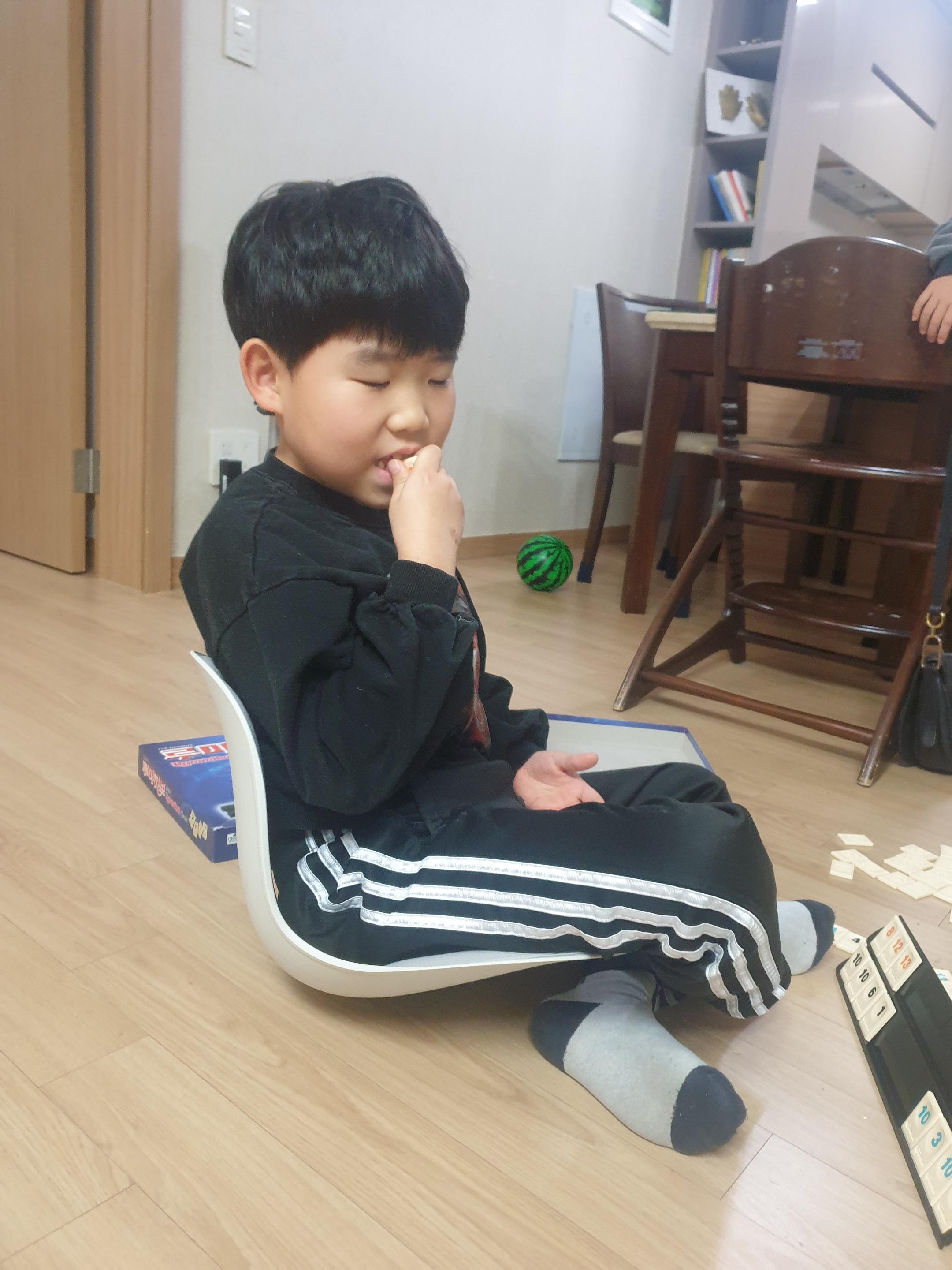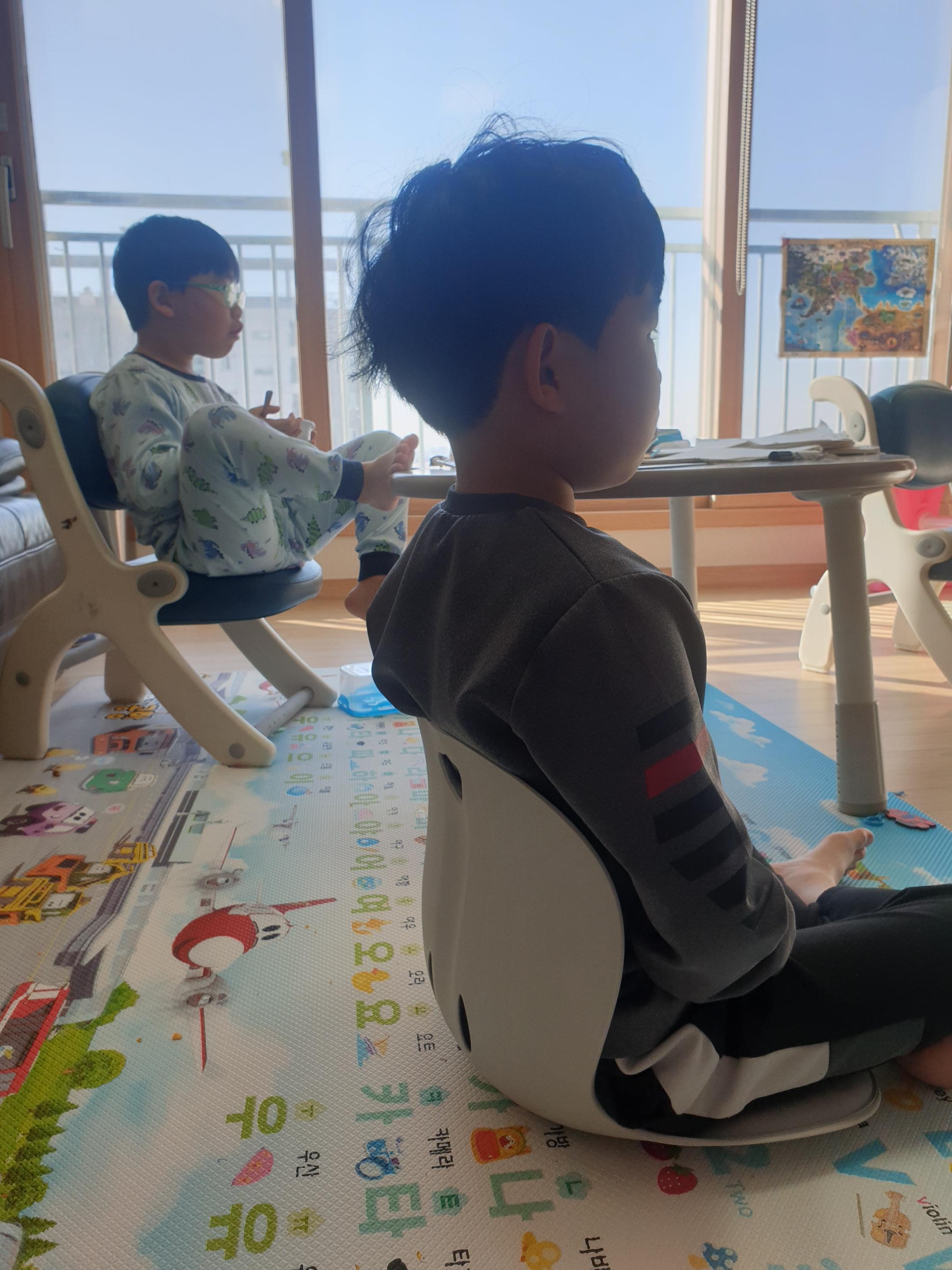 바닥에 앉을때는 편했다. 바닥에서 뭔가 해야할때 사용하면 좋을 듯 싶다. 하지만 맨 바닥에서 앉을 때는 플라스틱 곡선에 지지대가 없어서 아이들의 장난감으로 변하게 되니 꼭 매트 위에서 사용하는 것이 좋겠다.