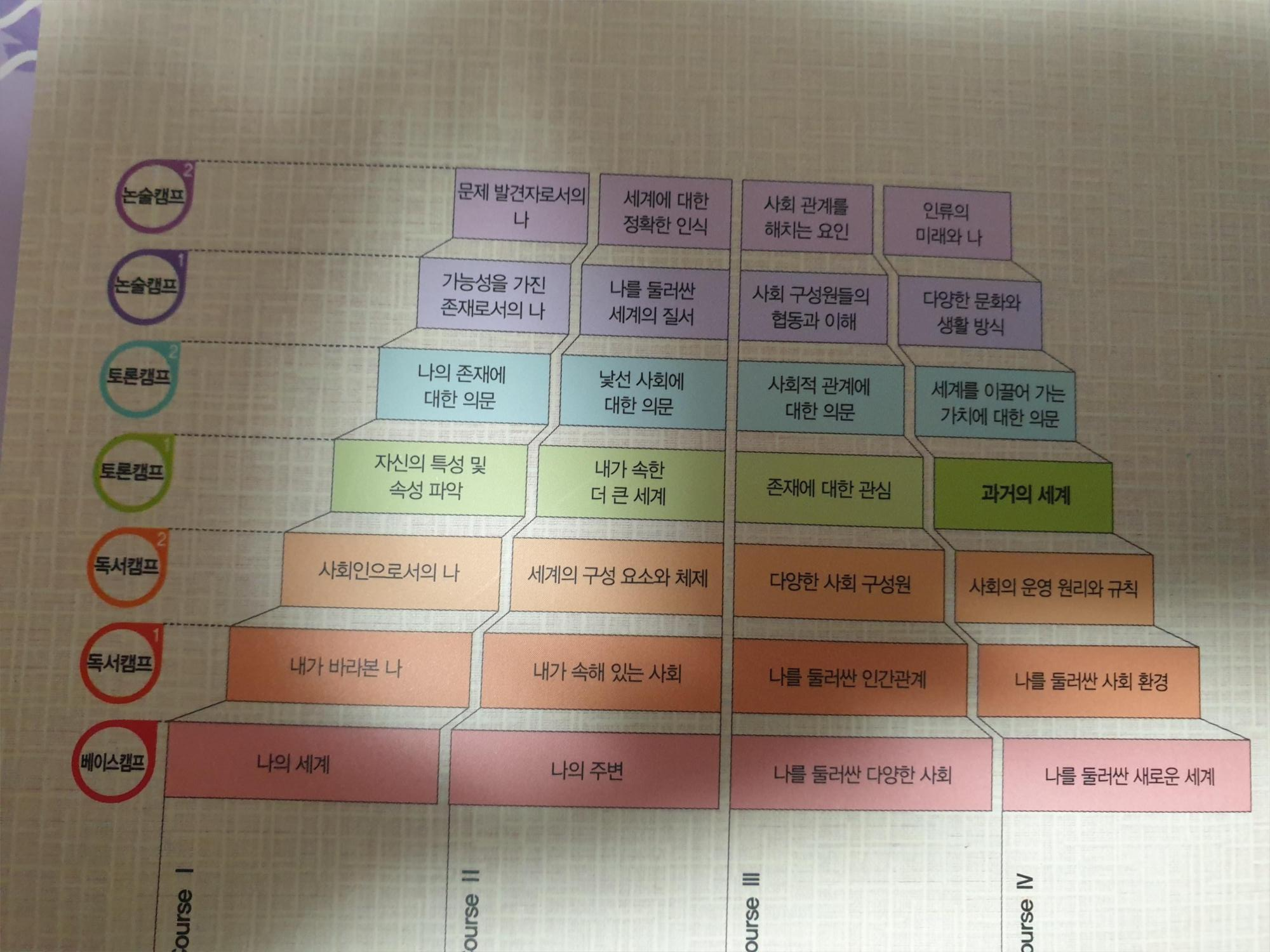 초등학교 3학년은 토론 캠프1 로 들어간다. 토론캠프는 자신의 특성 및 속성 파악, 내가 속한 더 큰 세계, 존재에 대한 관심, 과거의 세계 이렇게 코스로 들어가고 그에 맞는 책을 읽고 토론하는 것이다.