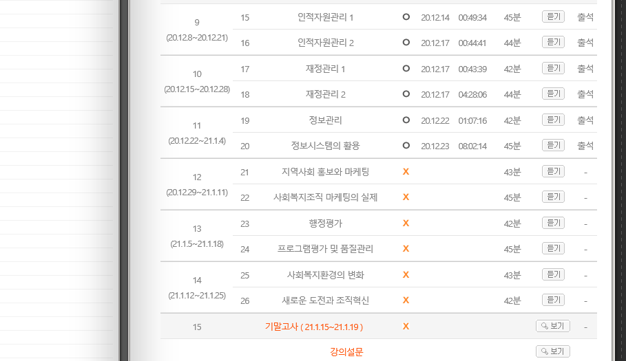 매 주마다 과목당 2교시에서 3교시까지 들을 수 있다. 2주안에는 다 들어야 한다. 2시간 안쪽으로 들을 수 있으니 일주일에 15시간정도 소요된다고 할 수 있다. 스마트 폰으로도 수강 가능해서 장소에 상관없이 들을 수 있어서 편했다. 배점은 15점이다.