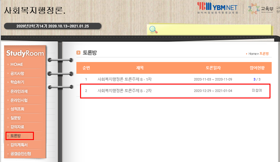 토론은 생소한데 자기 의견을 적는 것이다. 교안을 참조해도 되고 인터넷을 참고 해서 써도 된다. 처음엔 부담을 가지고 했는데 그냥 부담없이 적어도 된다. 이것은 한학기에 두번하는데 배점은 한번에 5점씩 10점이다.