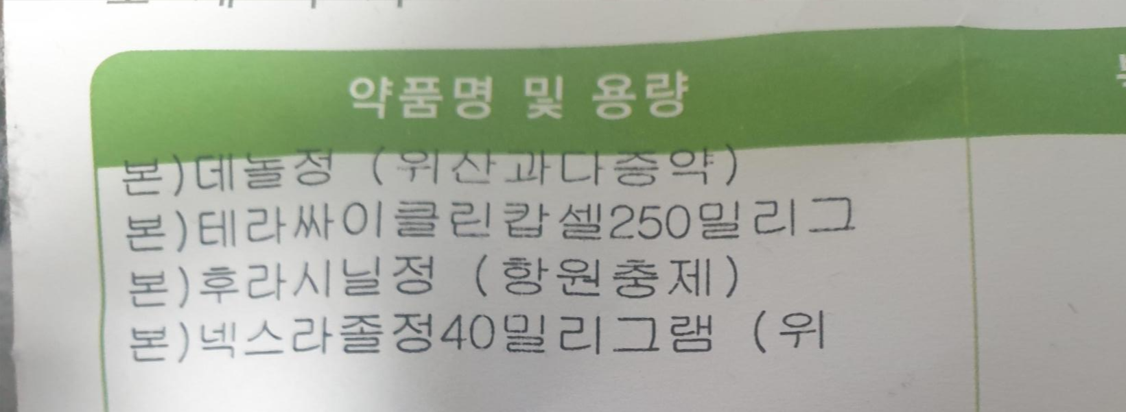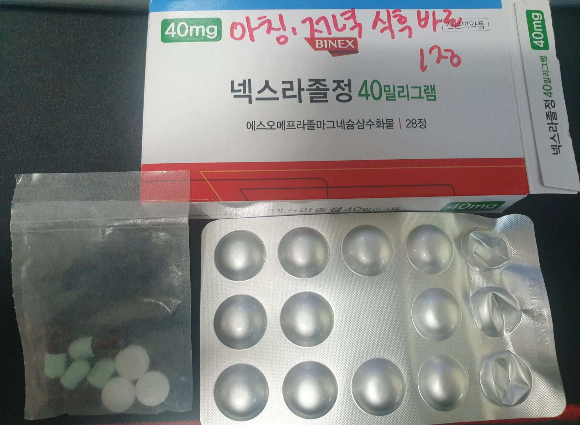 약 처방을 받았는데 아침 저녁으로는 8알 정도 된다. 데놀정(위산과다증 약), 테라 싸이클린 캡슐 250밀리그램, 후라시닐 정(항 충원제) 넥스라졸정 40밀리그램(위식도 역류 질환) 이렇게 처방을 받았다. 약값은 5만 원 넘게 나왔다.