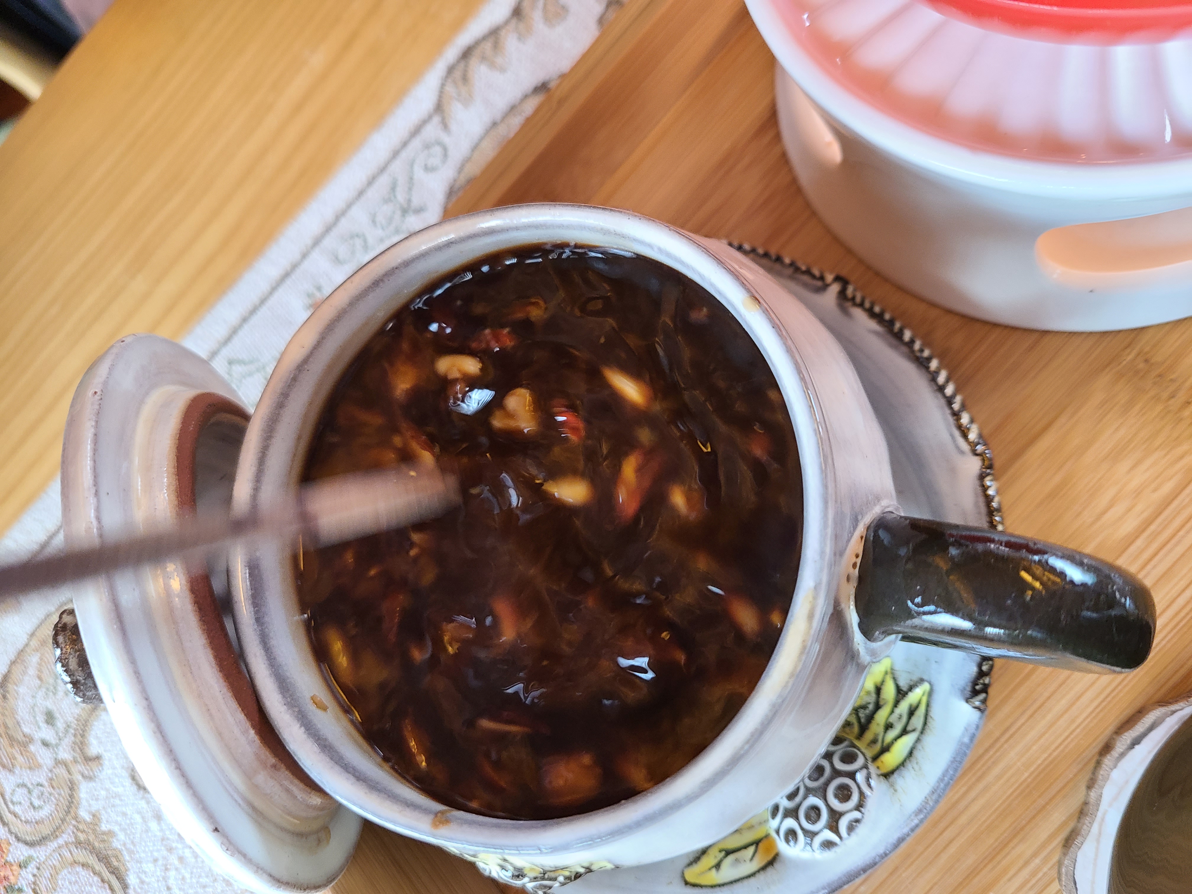 쌍화차에 있는 계란을 막 휘저은 다음 먹었다. 비린맛은 전혀 없고 따끈하고 견과류 잔뜩 들어있어서 든든한 맛이 느껴진다.