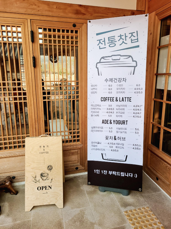 전통 찻집의 메뉴는 쌍화차 수청과 대추차 생강차는 6천원