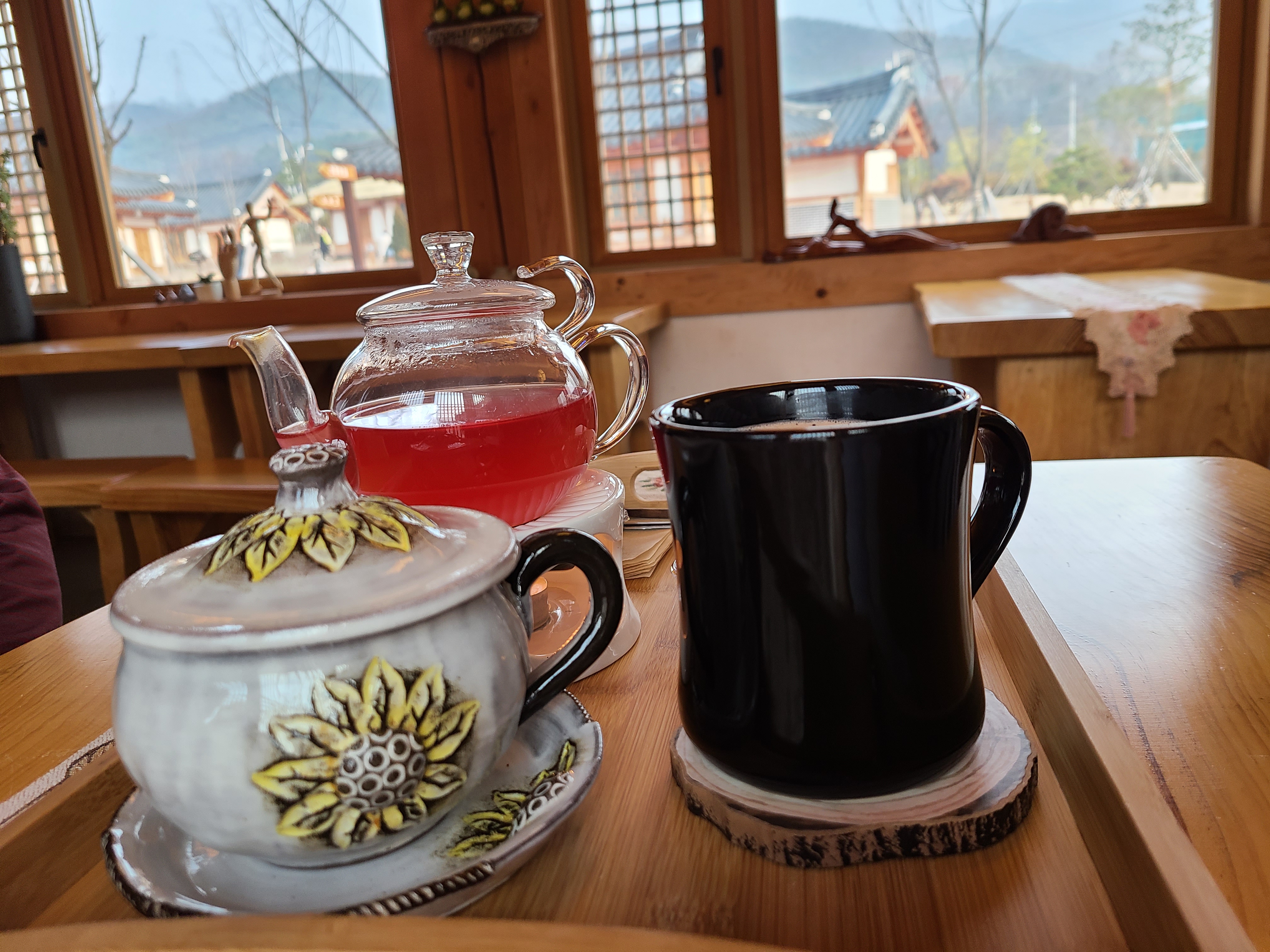 우리가 시킨 것은 오미자차, 쌍화차, 초코 라테이다.