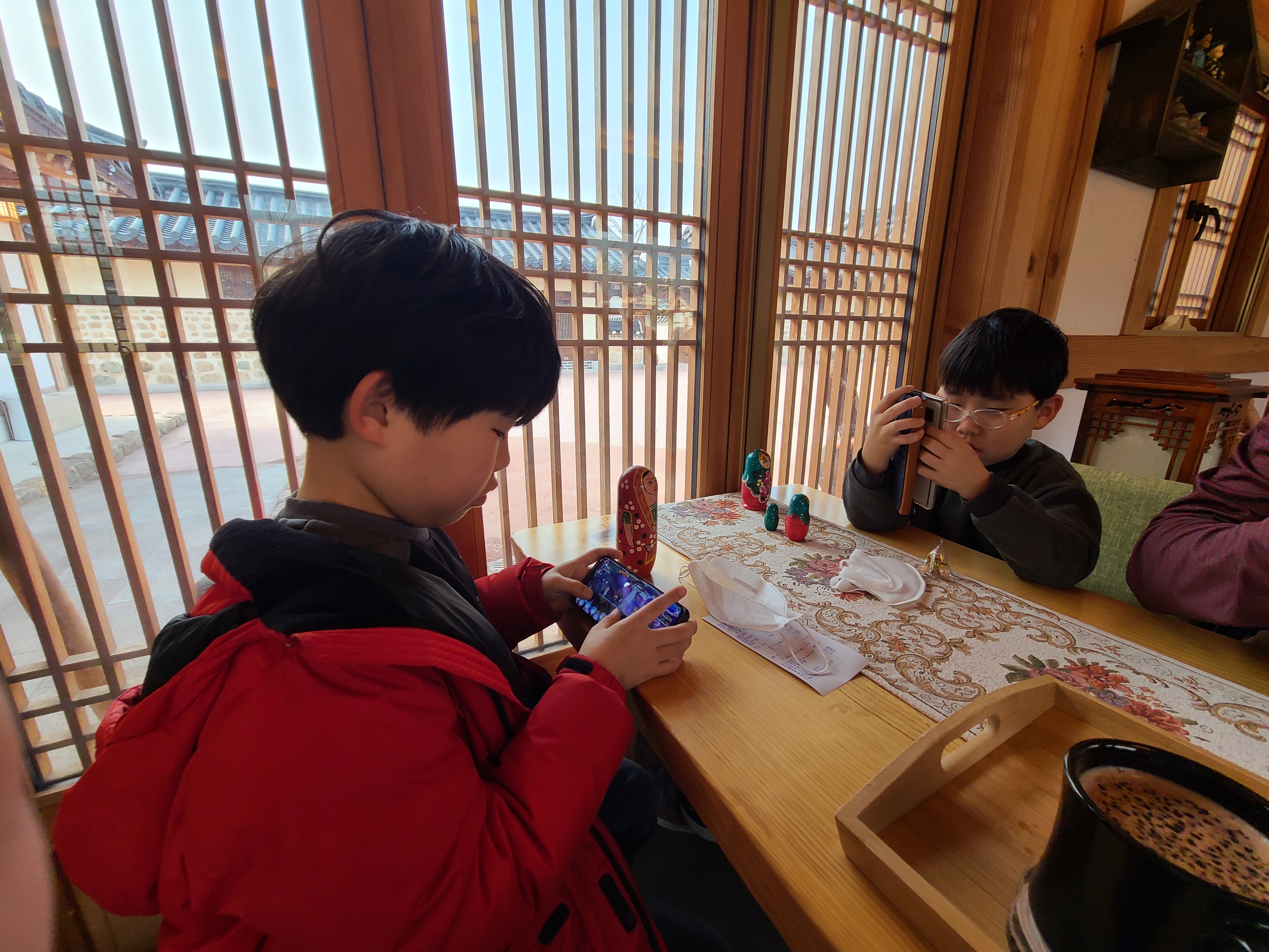 아이들은 차 마시는 것은 관심 없고 게임 중이다.