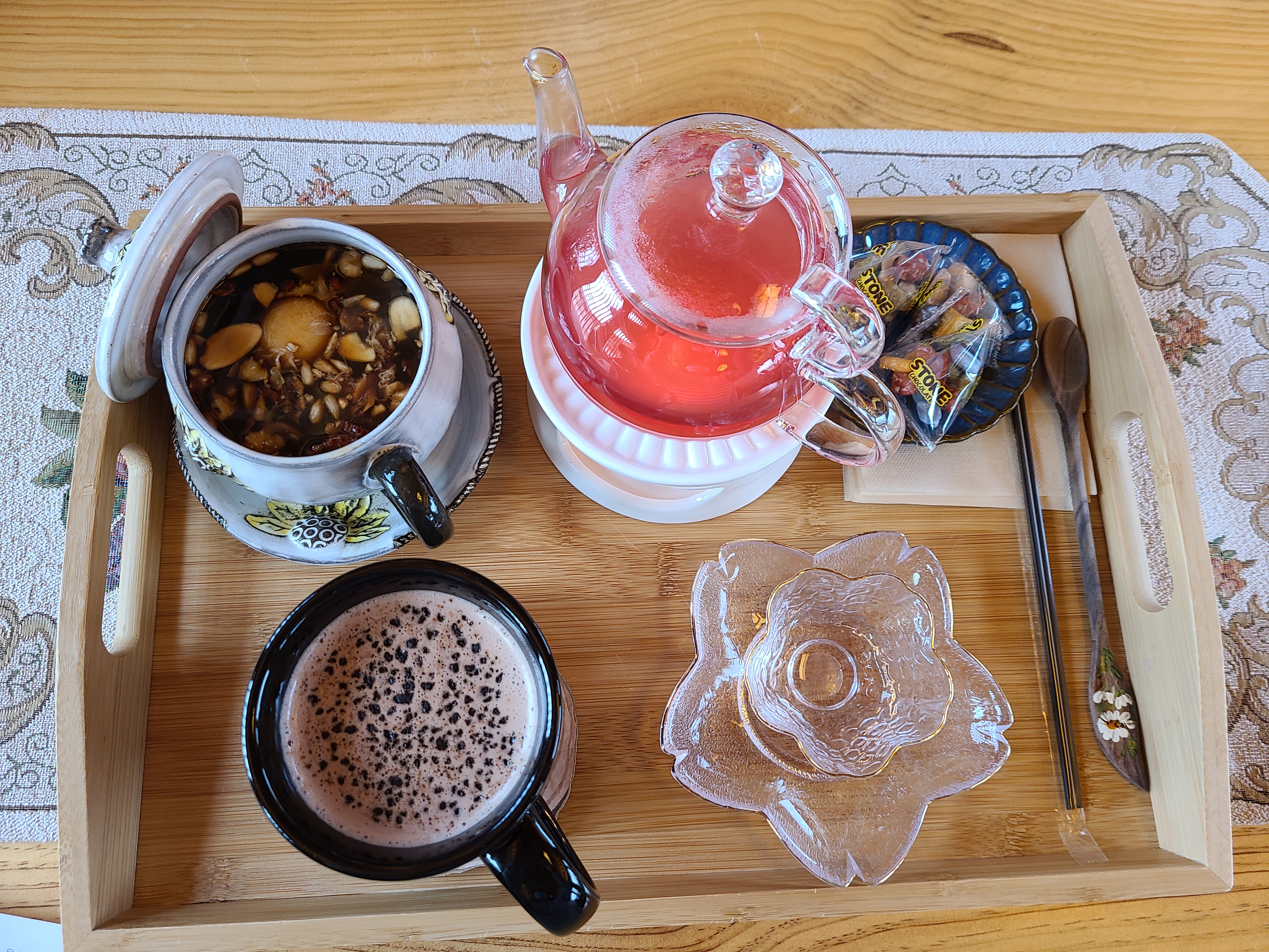 오미자 차는 따뜻하게 먹으라고 양초로 데워준다. 쌍화차는 계란 동동 띄어져 있다. 계란은 선택사항이다. 초코 라테에는 초코 알갱이가 송송 들어있다.