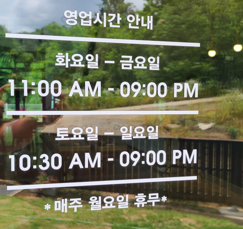 석실리 카페 쎄븐 씨드 운영시간은 11시 오픈 9시 마감이다. 토요일 일요일은 10시 30분 오픈, 매주 월요일은 휴무이다.