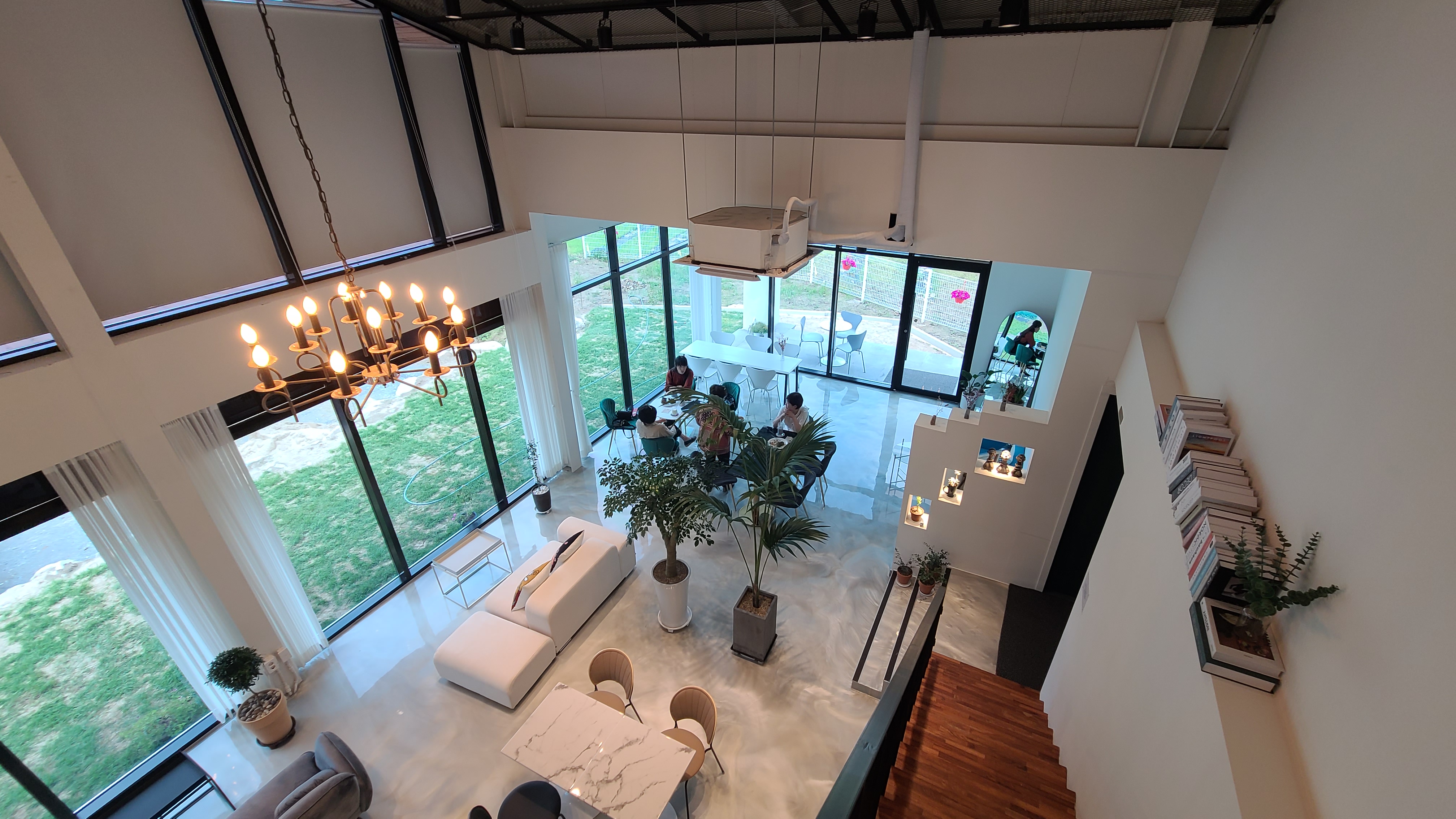 건물 내부이다. 커다란 창으로 논 밭 그리고 파란 하늘이 보여서 시원한 느낌이다. 도심에서 10분만 나오면 이런 쾌적한 풍경을 볼 수 있다.