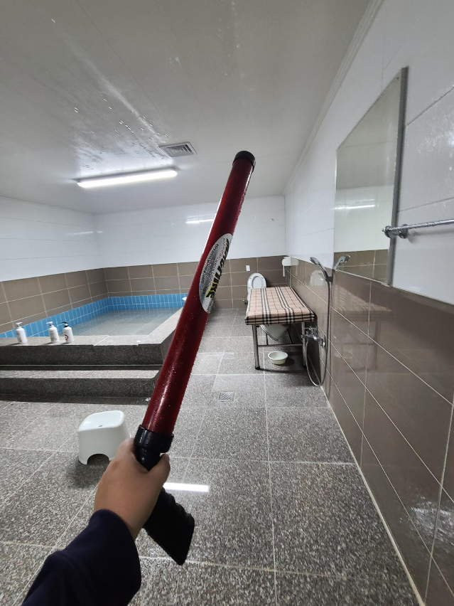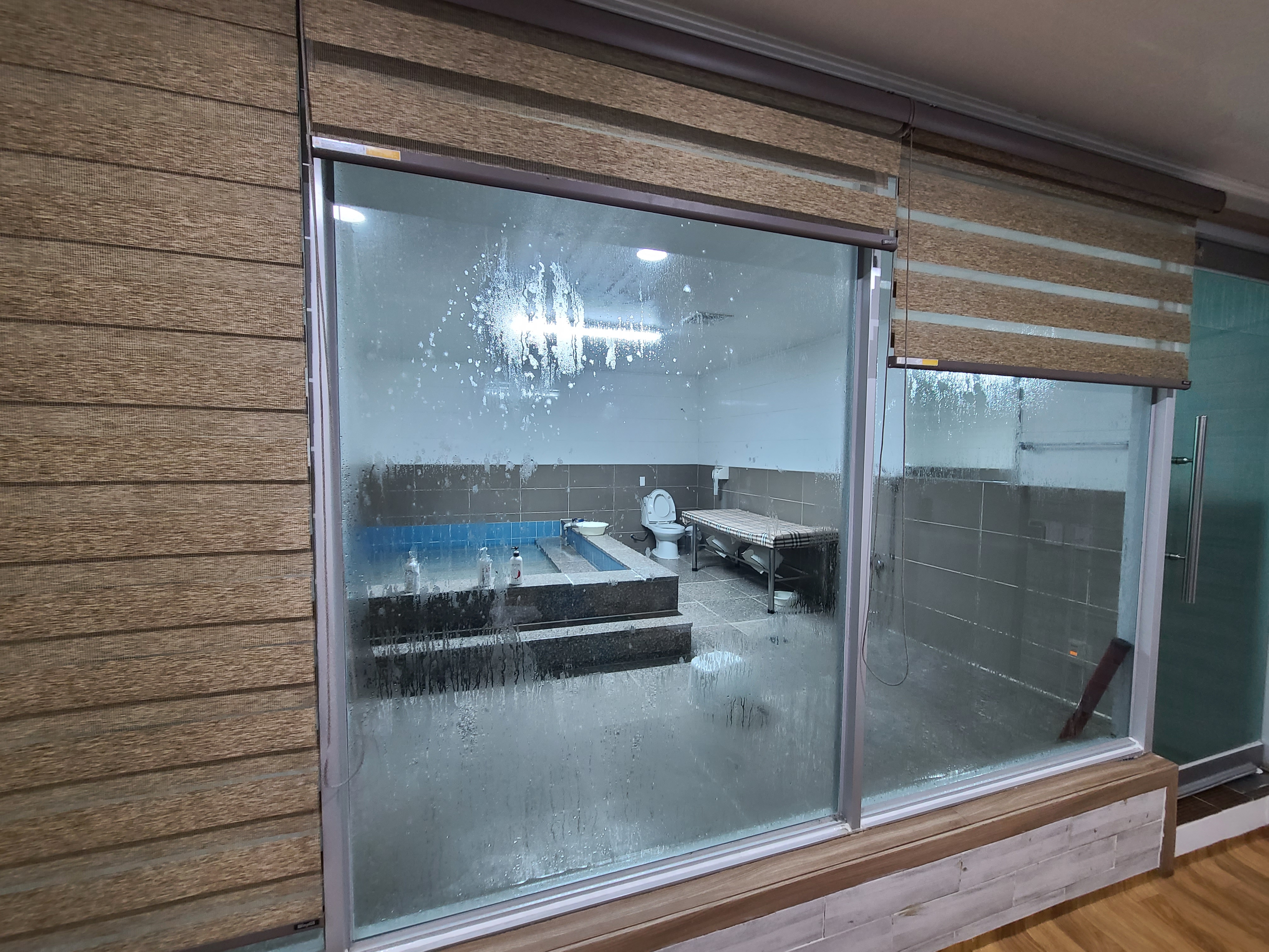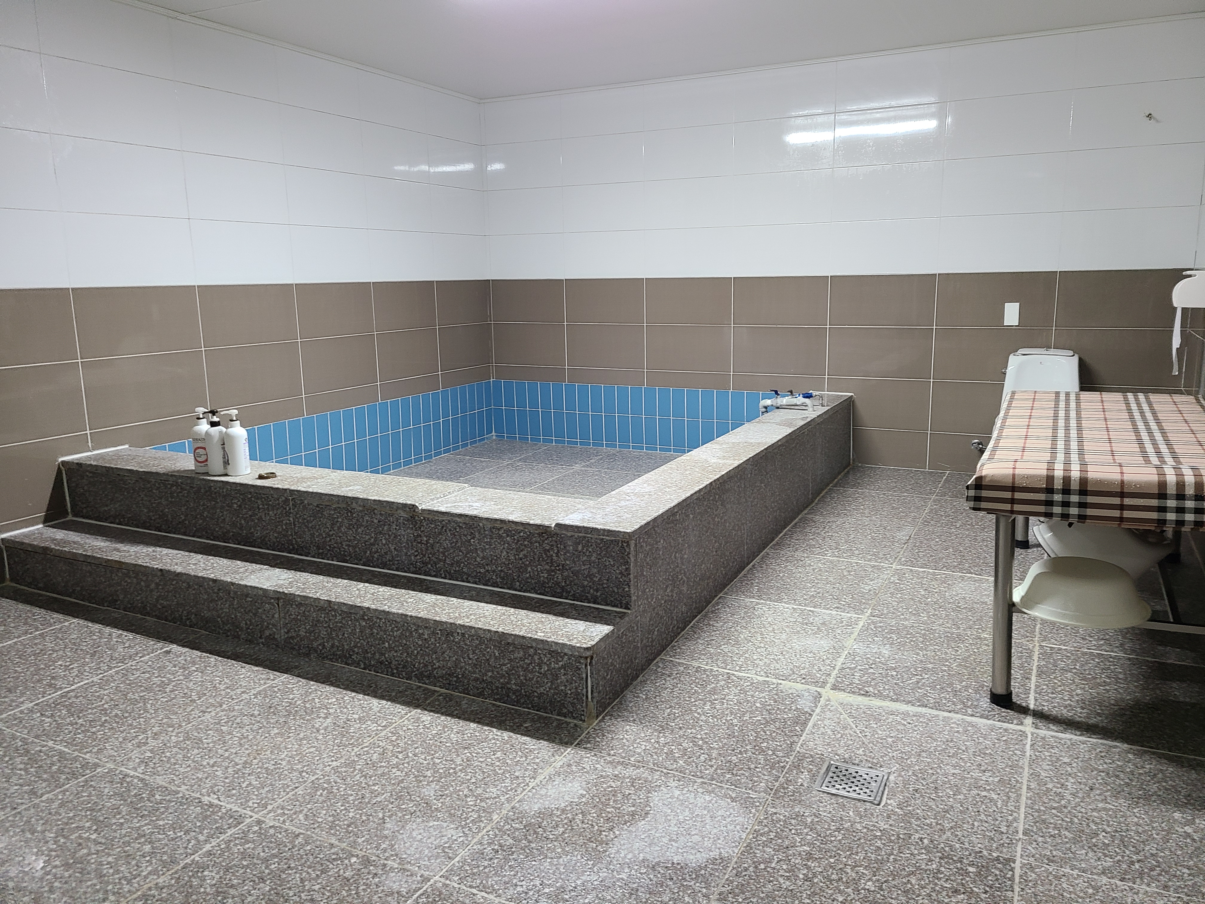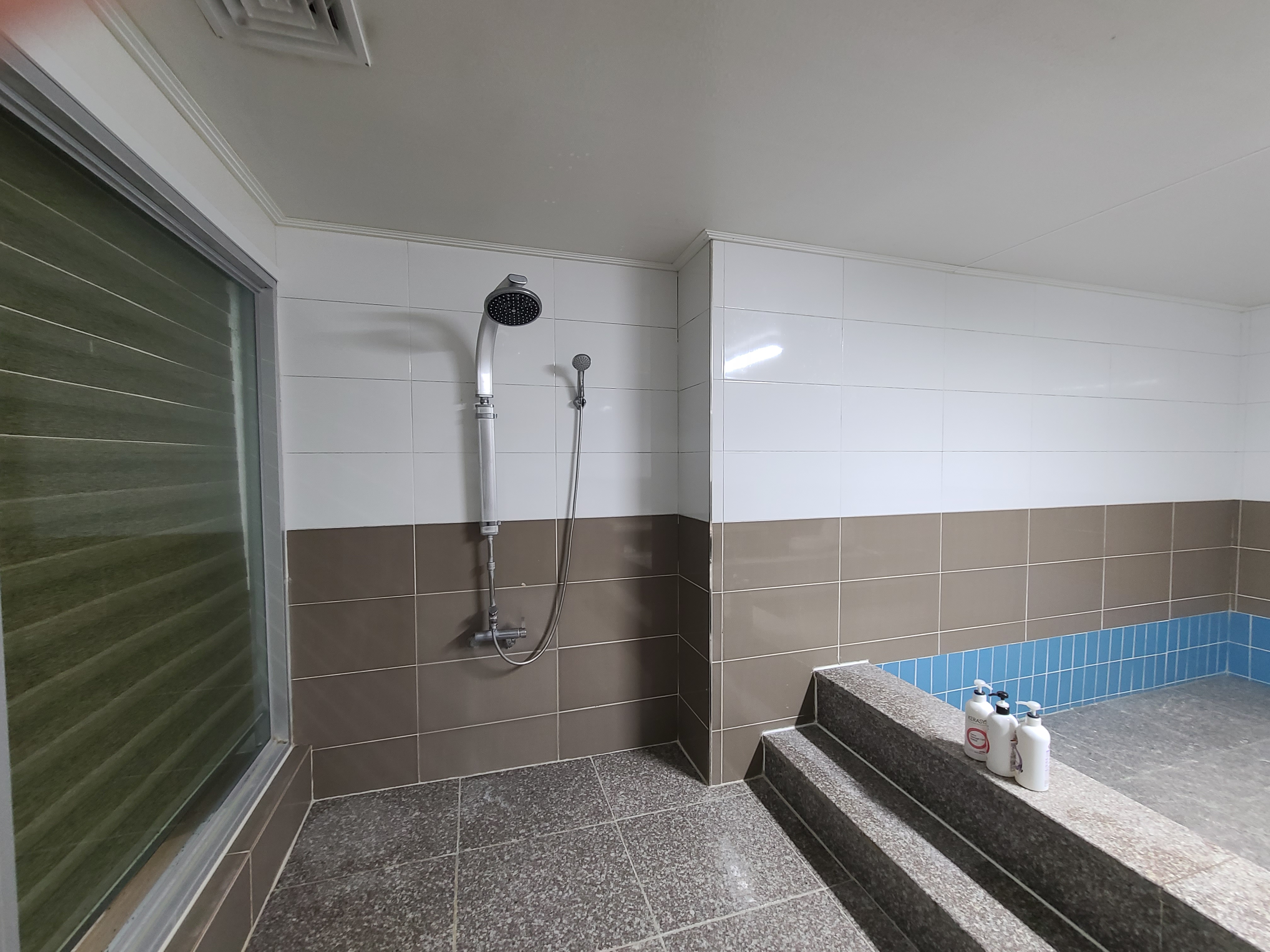 커다란 샤워기도 있고 옆으로 탈의실이 보이는 커다란 창이 있다. 샴푸, 린스, 바디워시는 탕에 준비되어 있고 송월 이태리 타월과 일회용 칫솔 치약 클렌징 폼 면도기 등등은 입실할 때 준다.