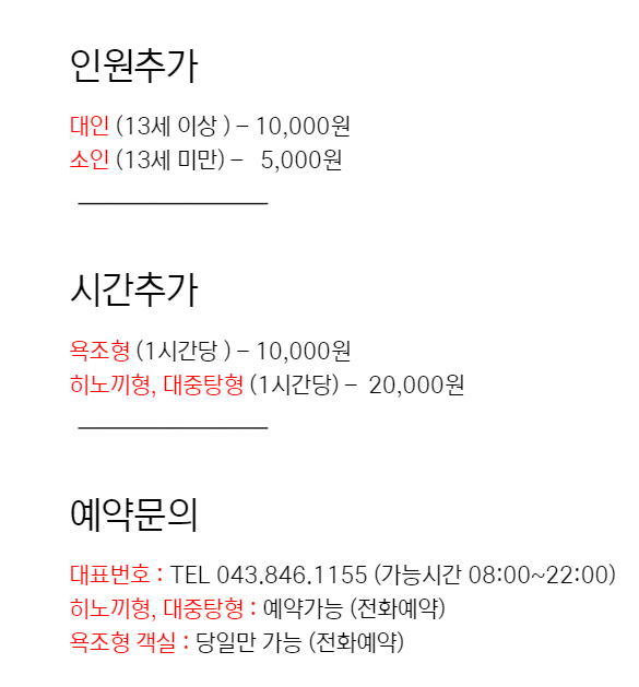 예약하려면 예약시스템은 별로 없고 전화로 해야한다. 전화번호는 043-846-1155로 전화해서 원하는 시간과 원하는 방타입을 물어봐야한다. 좀 번거롭기는 하다.
