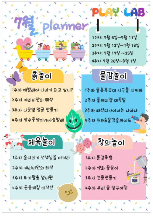 카톡 플레이 랩에 추가하면 매주 무엇을 하는지 톡이 온다. 흙놀이 물감놀이 체육놀이 창의 놀이 이렇게 네 가지 수업 중에 마음에 드는 수업을 신청하면 된다. 활동적인 아이들은 물감과 체육을 좋아하고 사부작 노는 아이들은 흙 창의놀이를 좋아할 듯싶다.