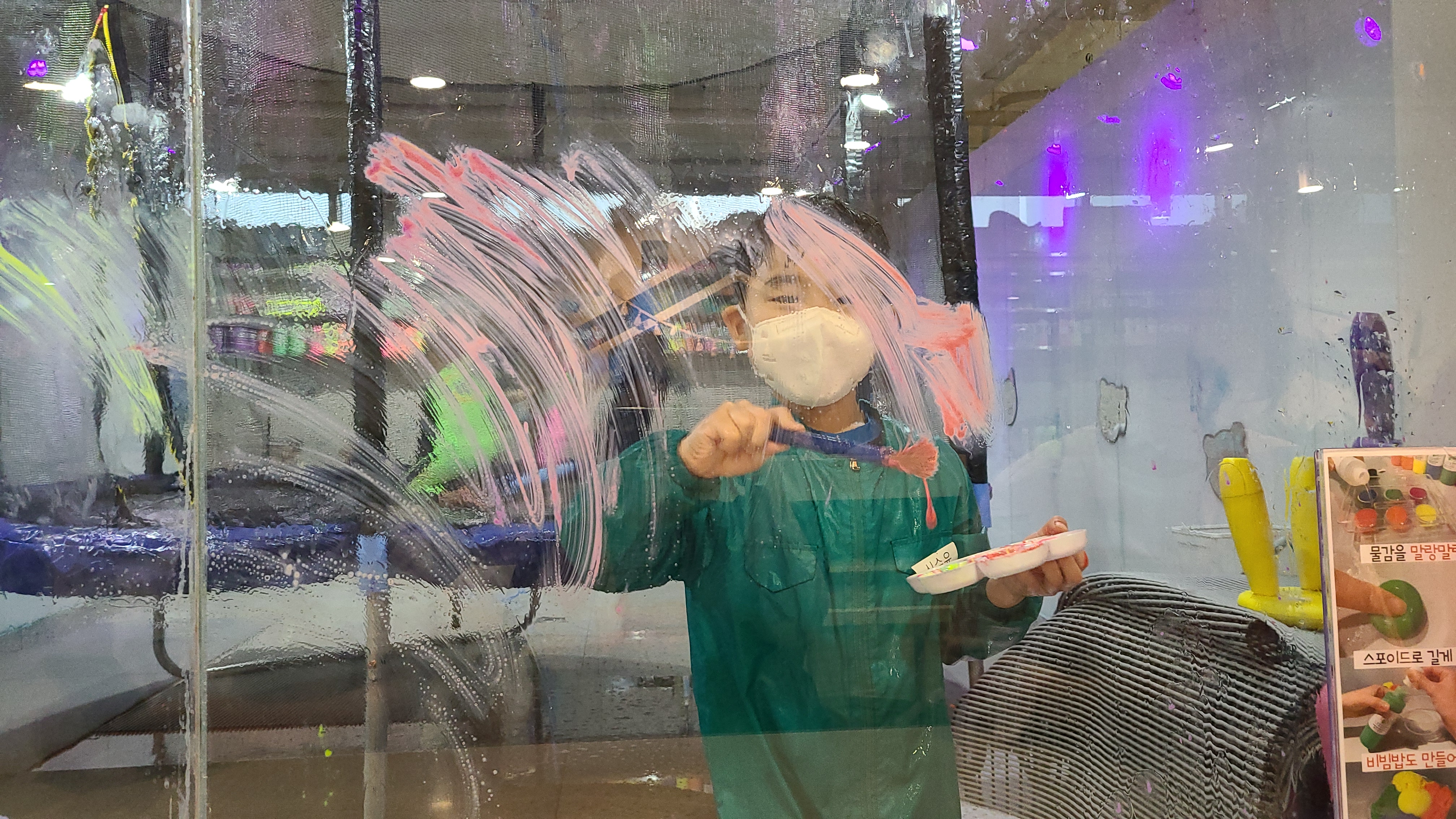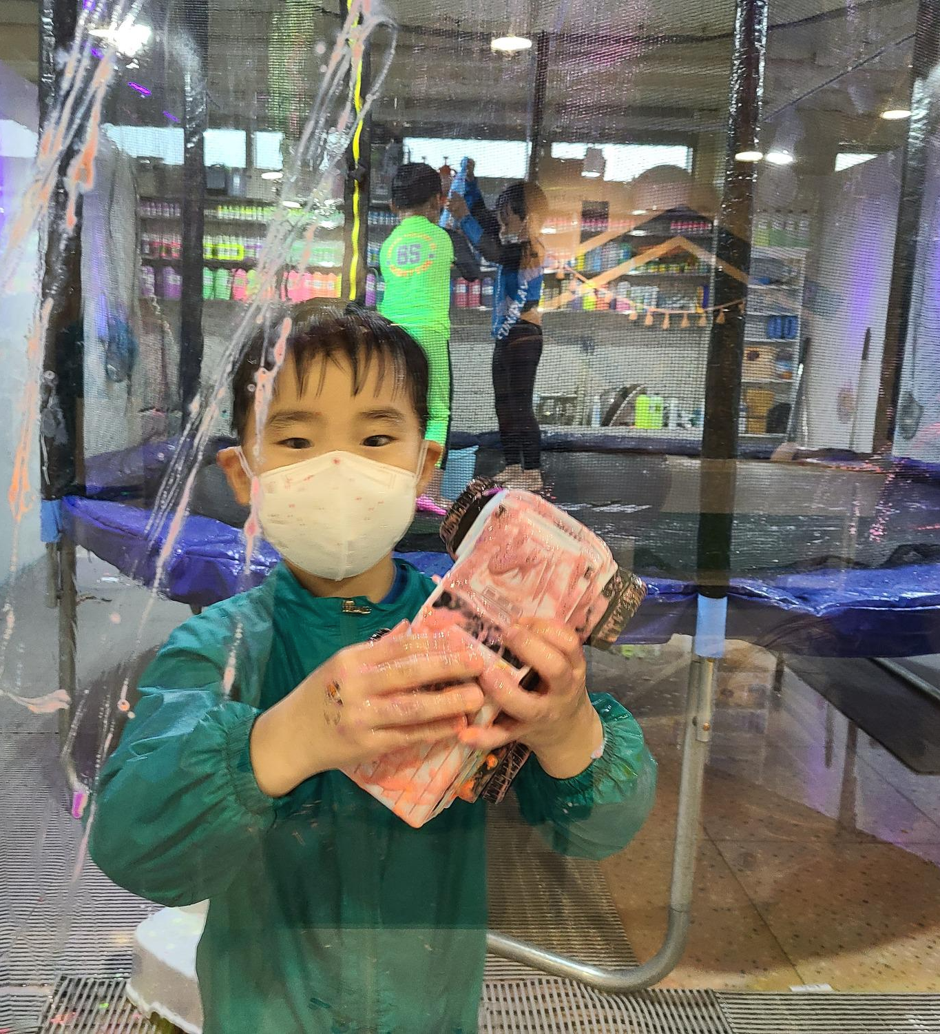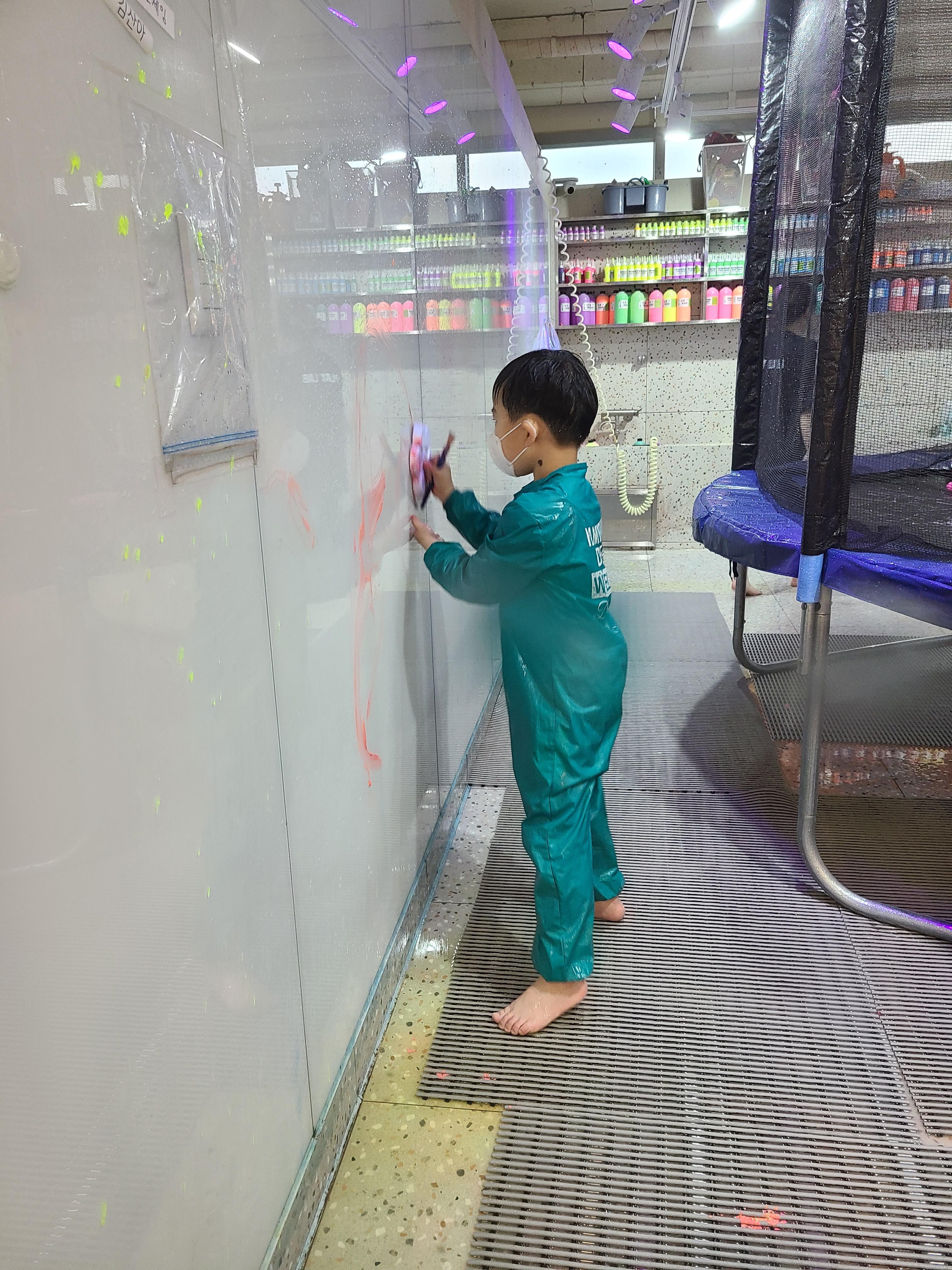 두 번째 체험은 물감놀이이다. 트램펄린을 타면서 천장에서는 따뜻한 물이 나온다. 물총도 쏘아보고 물도 뿌려보고 아이들이 정말 신났던 체험 중에 하나이다.