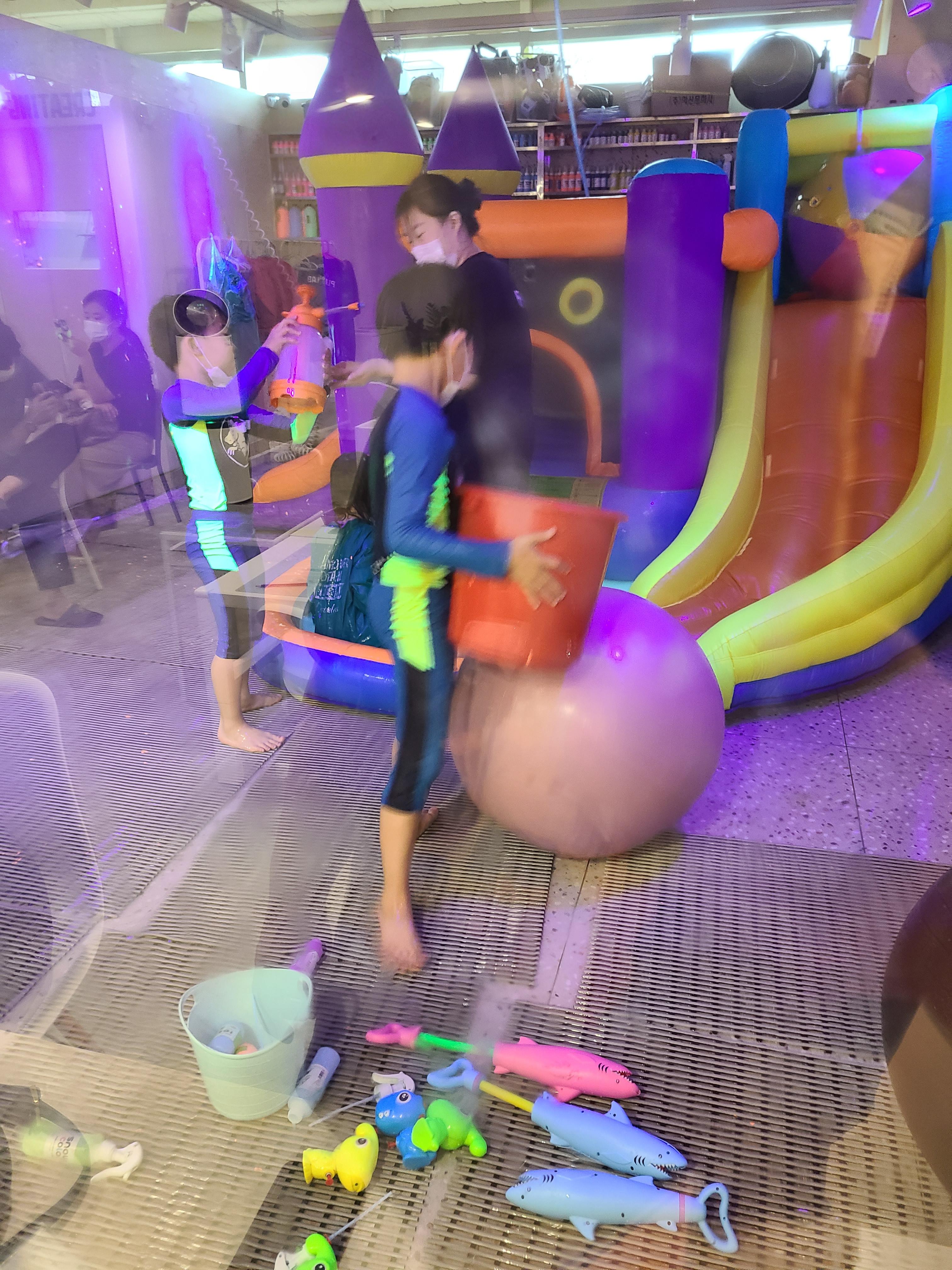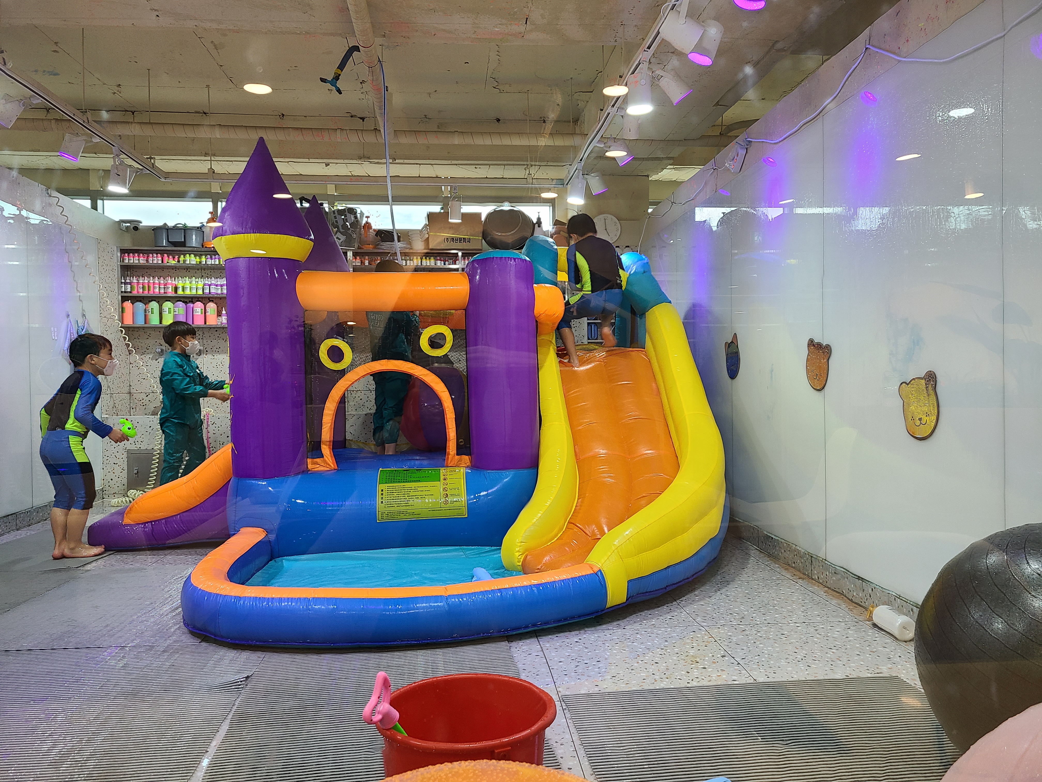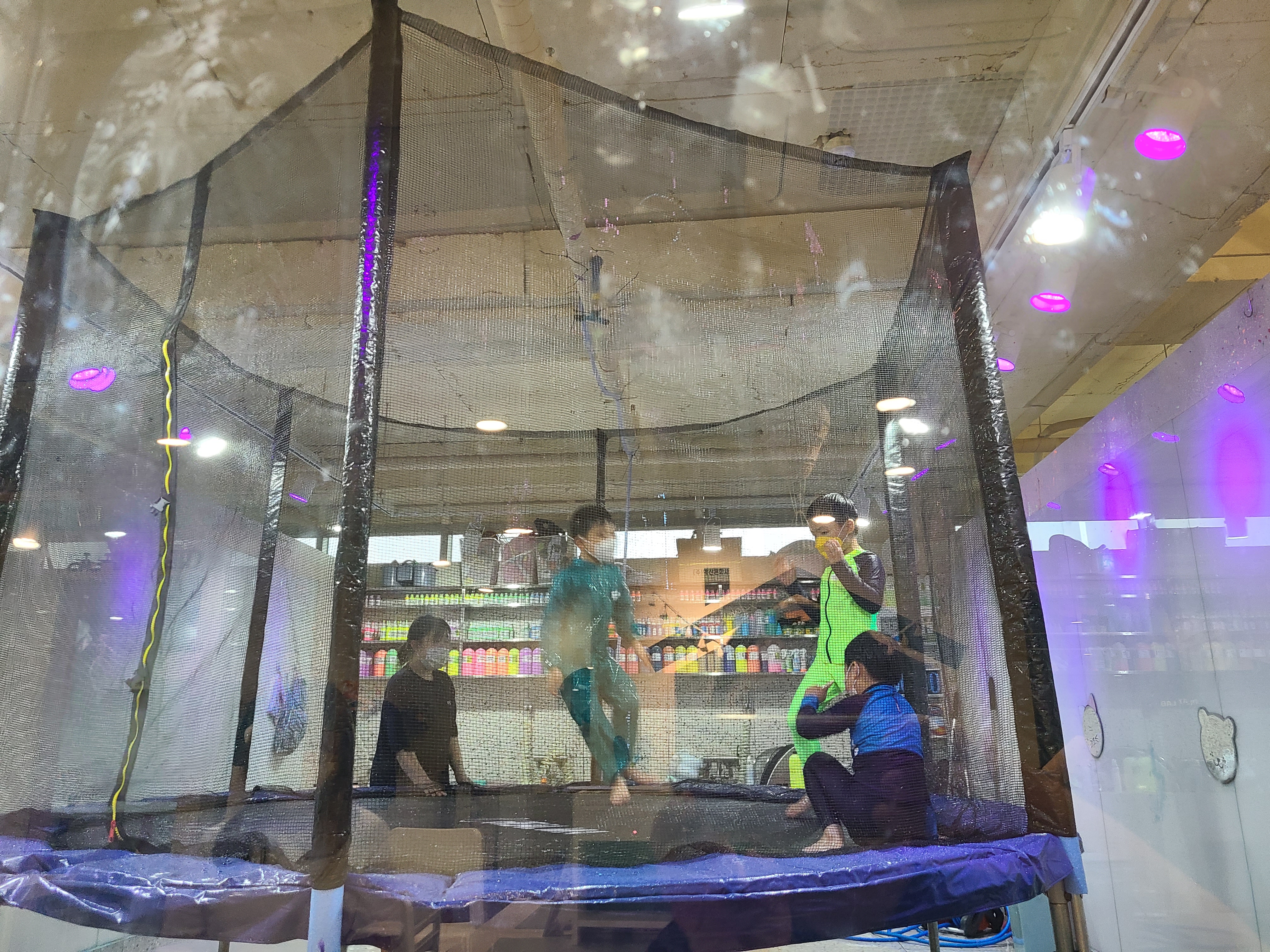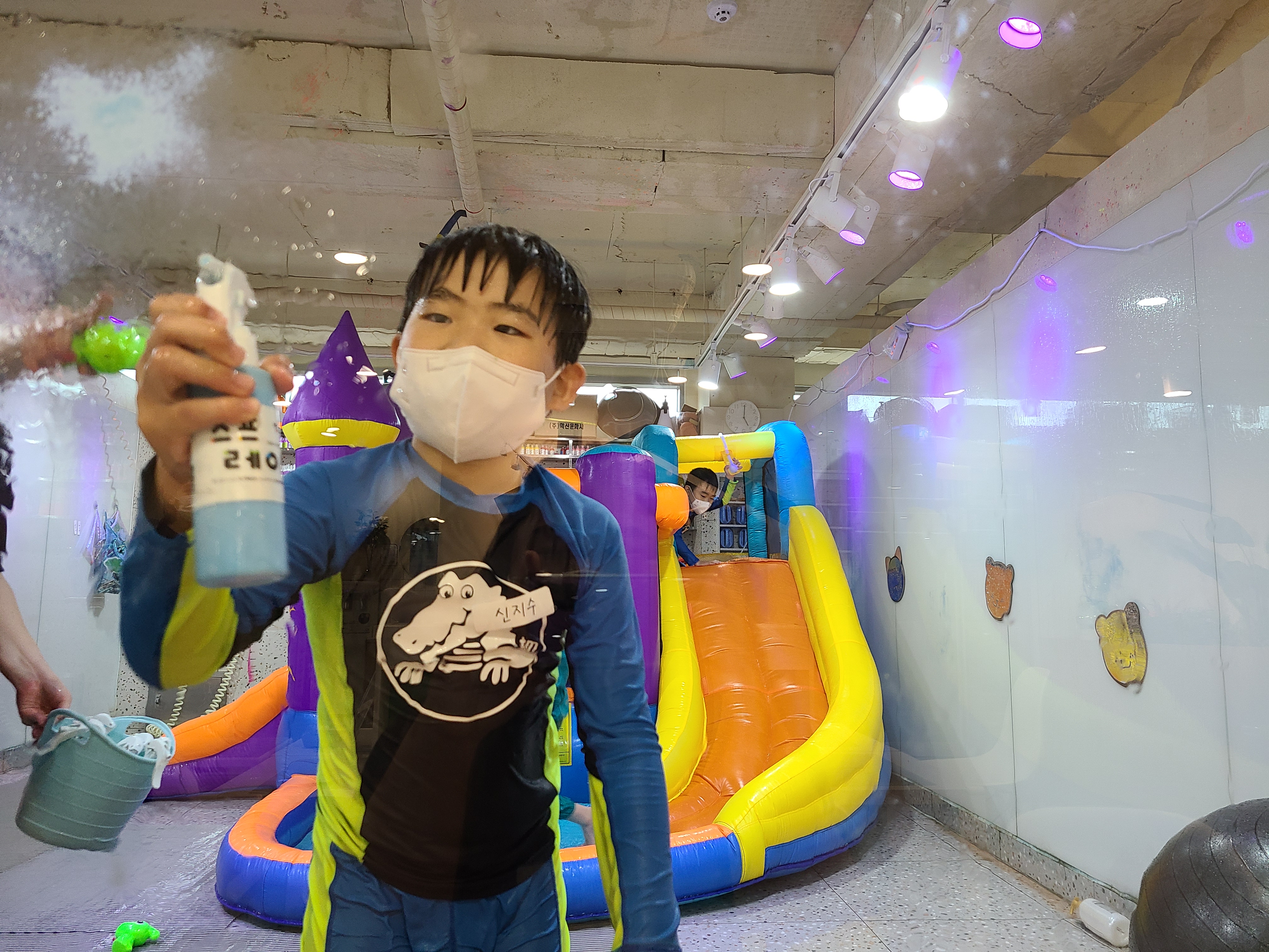두 번째 체험은 물감놀이이다. 트램펄린을 타면서 천장에서는 따뜻한 물이 나온다. 물총도 쏘아보고 물도 뿌려보고 아이들이 정말 신났던 체험 중에 하나이다.