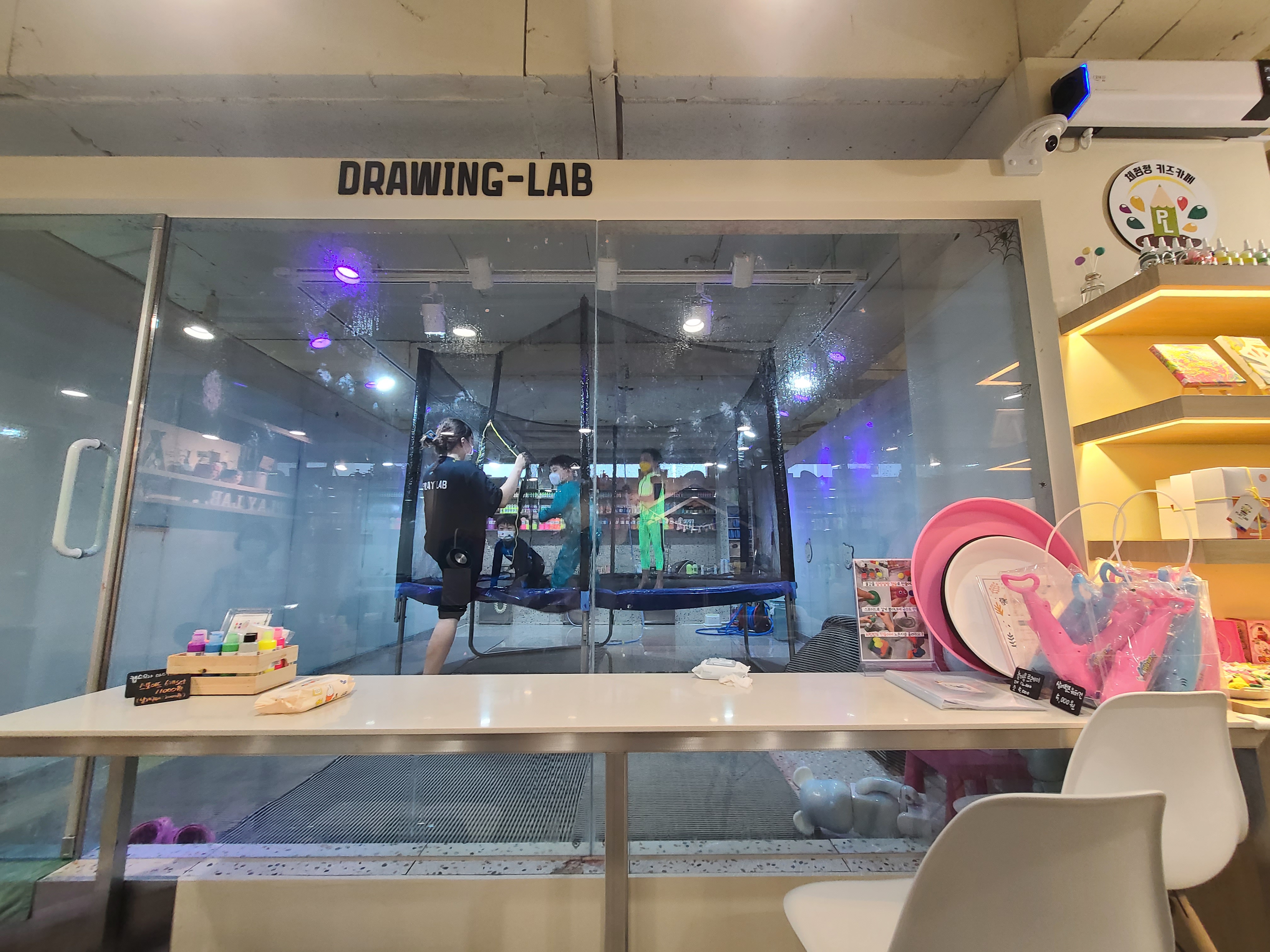 물감을 가지고 트램펄린에다가 물감을 가지고 색칠을 할 수 있다. 플래이랩의 장점 중에 하나가 물감 같은 재료를 아끼지 않는다는 것이다. 아이들이 마음껏 그리고 손으로 만지고 칠하도록 유도한다는 것이다.