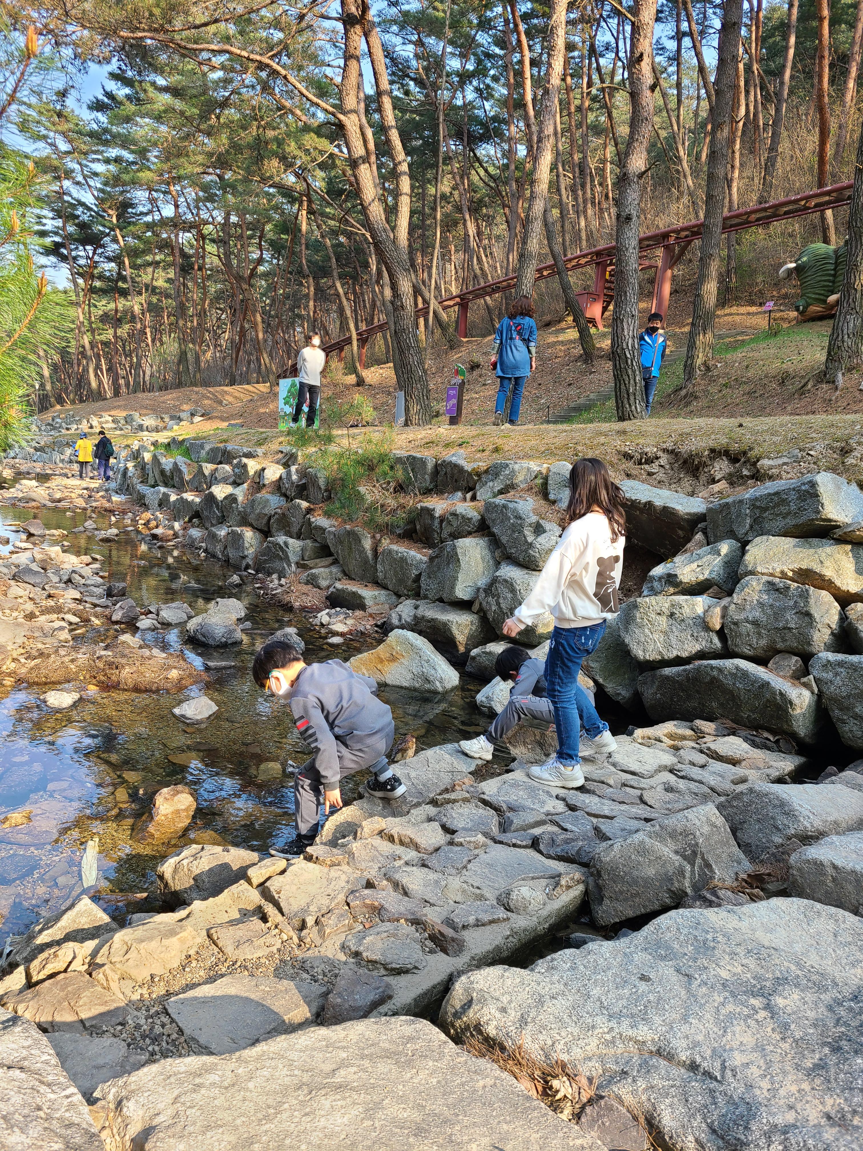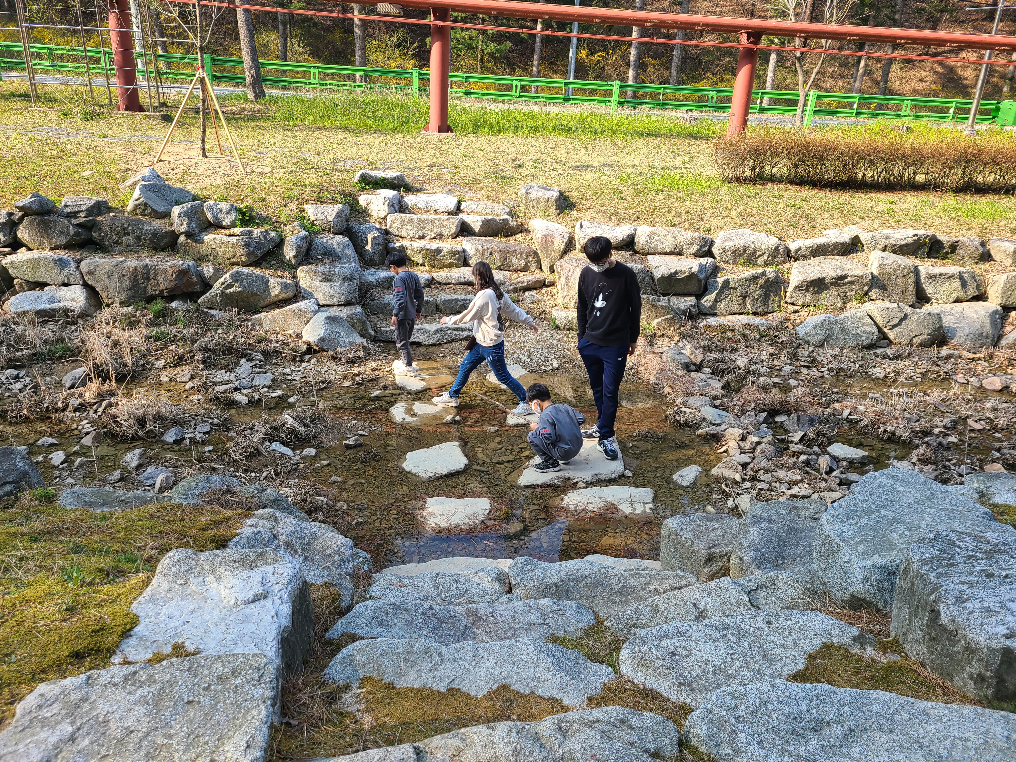 작은 냇가만 보여도 즐거워보이는 아이들이다. 여름이 되면 살짝 발 담그고 놀아도 좋을 듯싶다.