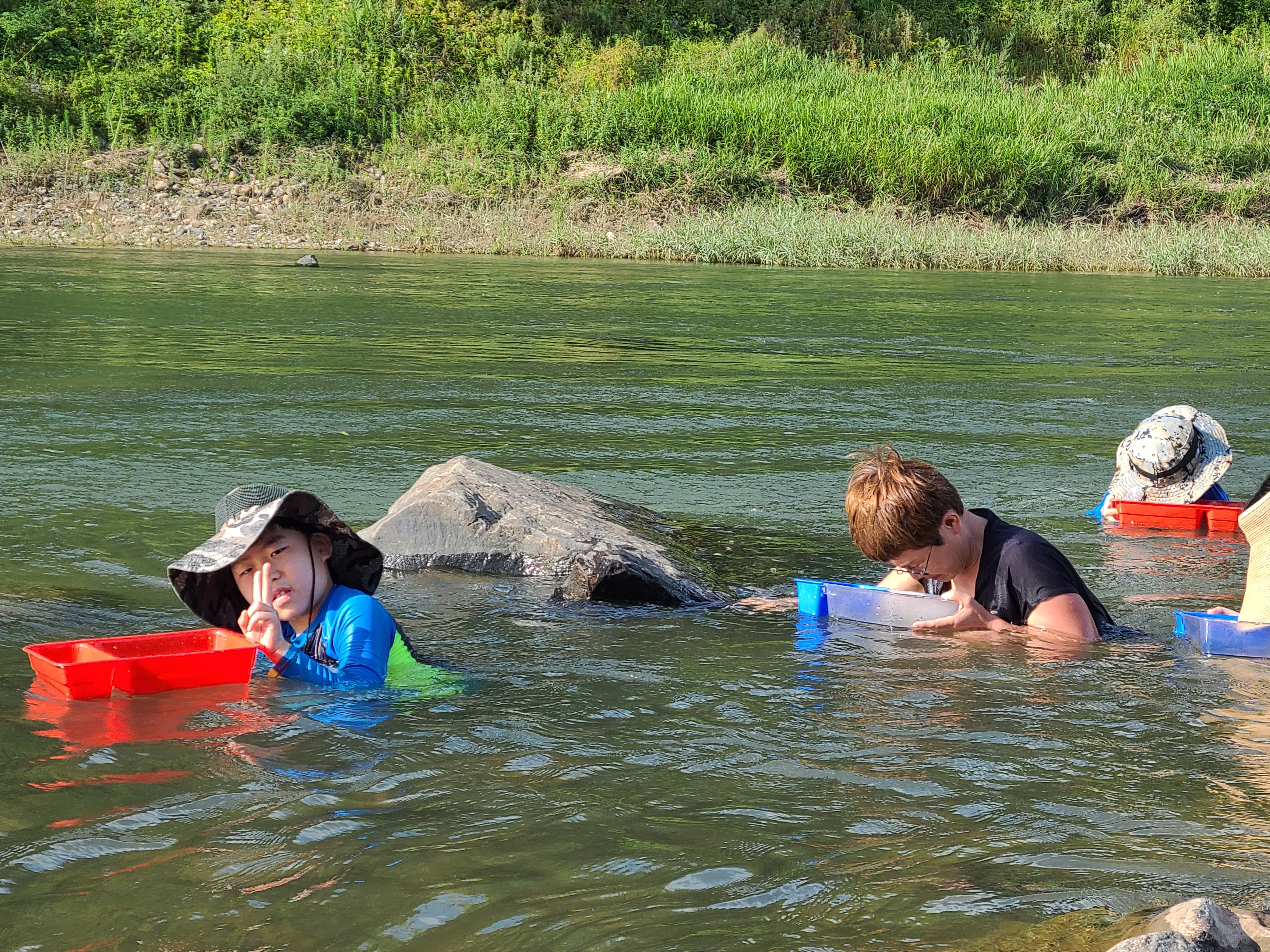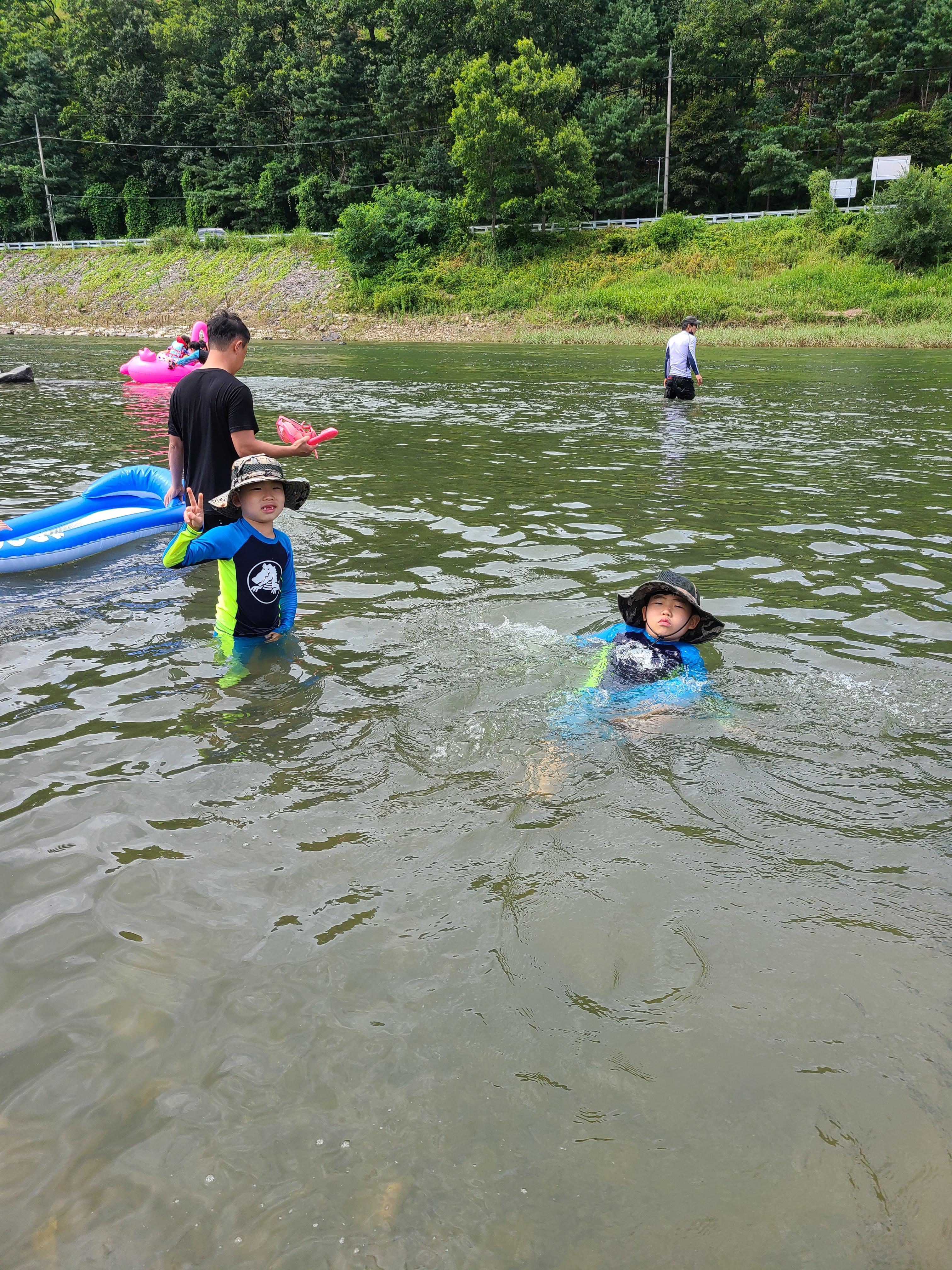 아이들은 다슬기 청주 사투리로는 올갱이 잡으려고 만반의 준비를 했지만 올해는 작년처럼 올갱이는 없었다. 물놀이로 시작했다. 친구도 금방 사귀귀어서 잘 놀았다. 물높이는 이번엔 아이들이 놀기 적당했지만 상류 쪽으로 올라가면 갑자기 깊어지는 곳도 있으니 아이들을 잘 관찰해야 한다.