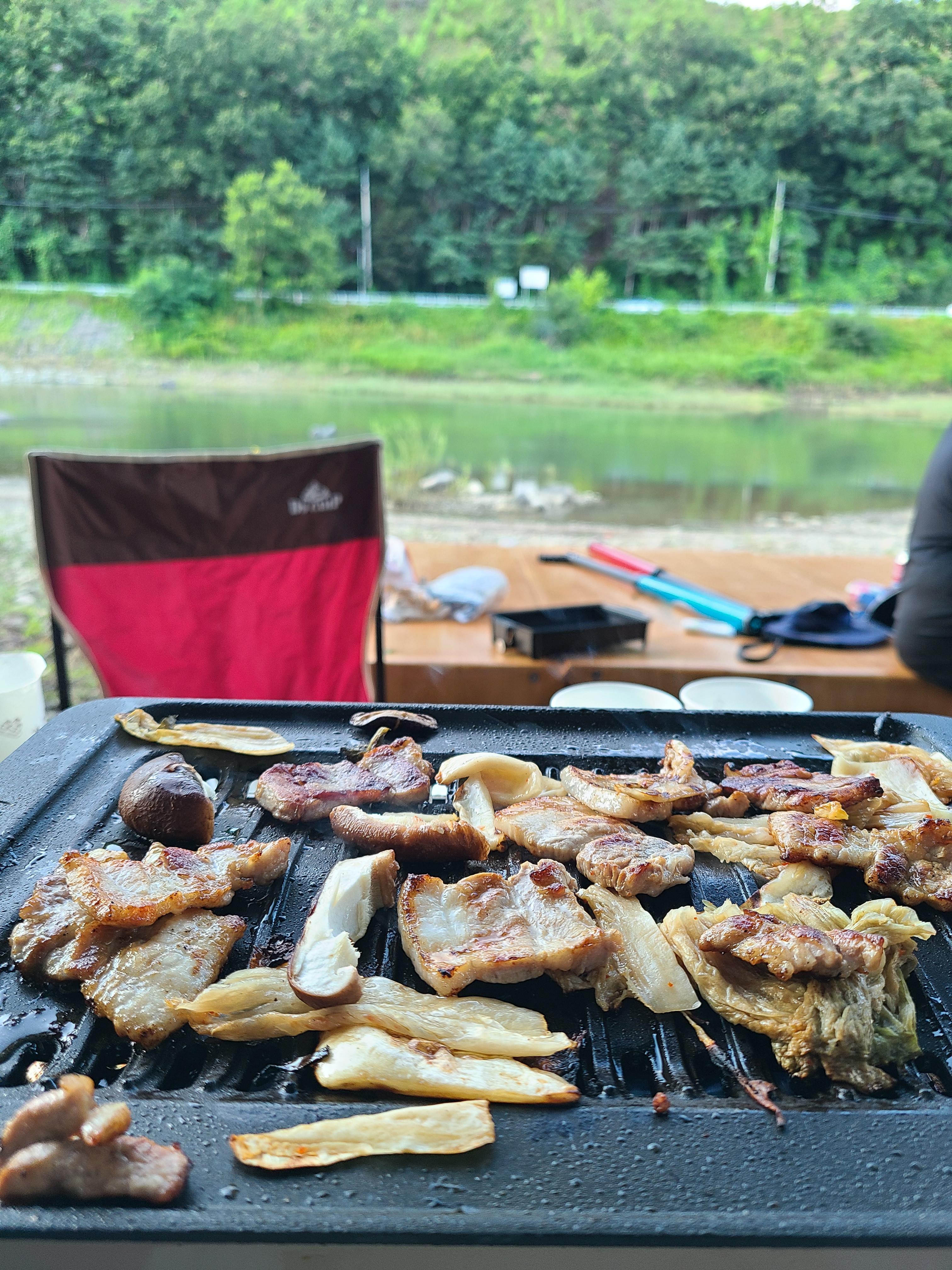 평상에 자리 잡았다. 커다란 나무가 위에 있고 바람 솔솔 불고 앞에는 냇가가 흐르고 놀기 딱 좋은 날씨이다. 고기도 구우니 땀이 삐질삐질 났다. 평상 가격은 2만 원짜리도 있고 3만 원짜리도 있다.