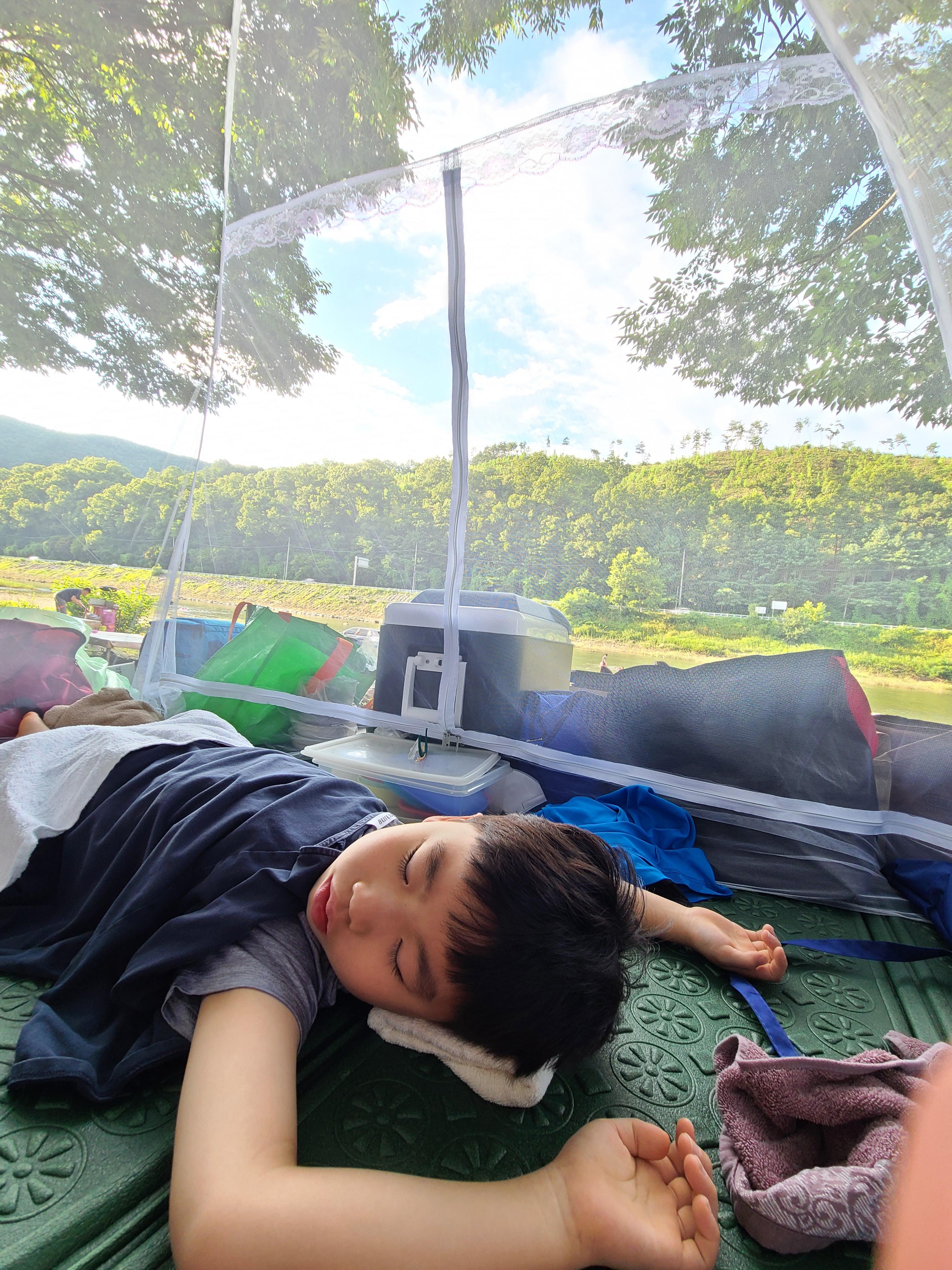 이번에 올 때는 모기장을 가져왔는데 정말 잘 썼다. 야외이다 보니까 파리가 날아다니는데 모기장 안에서 자니 그럴 걱정이 뚝 사라졌다. 아침 10시에 제일 먼저 와서 7시 넘어서까지 제일 늦게 가는 가족이다.