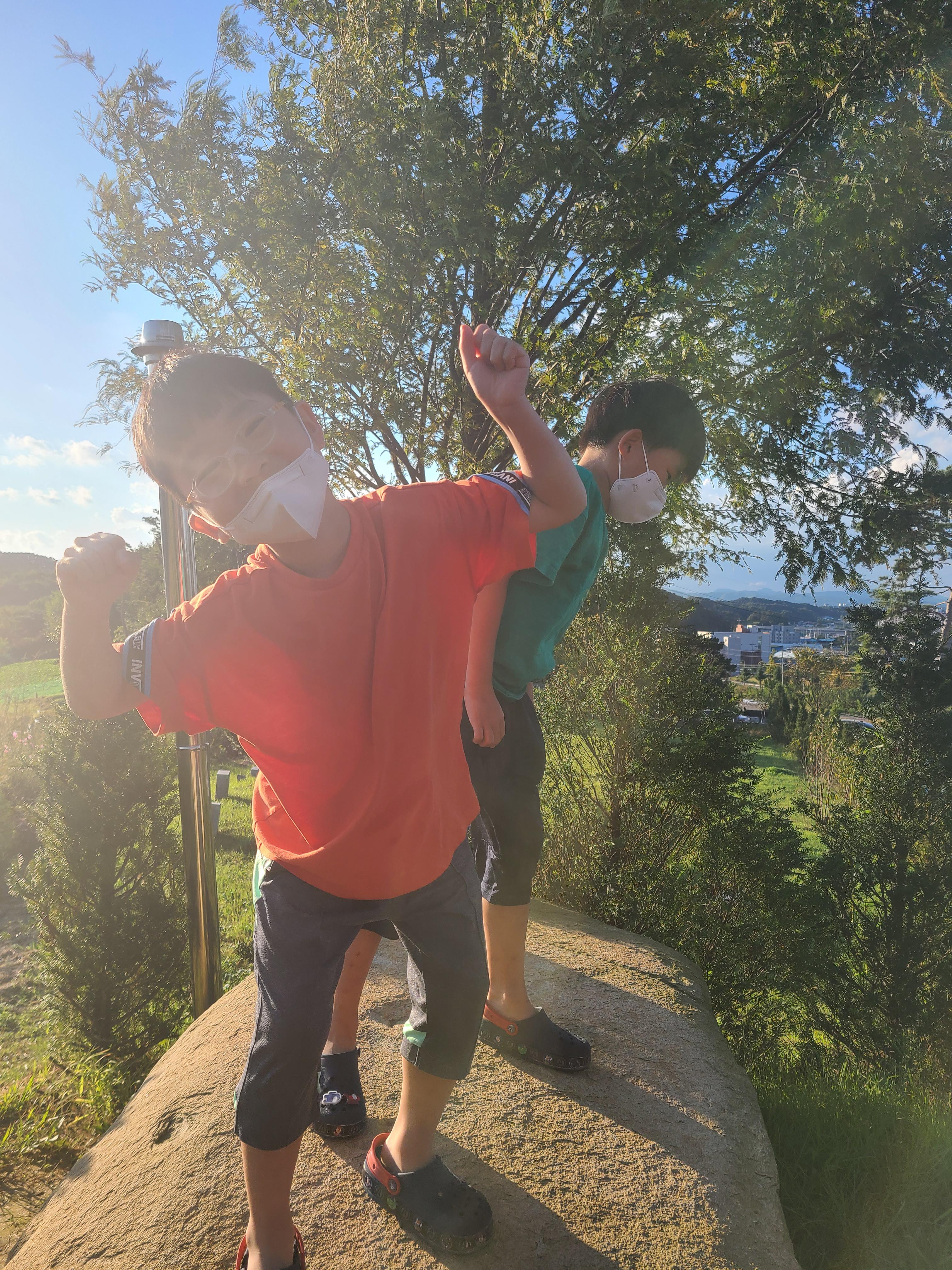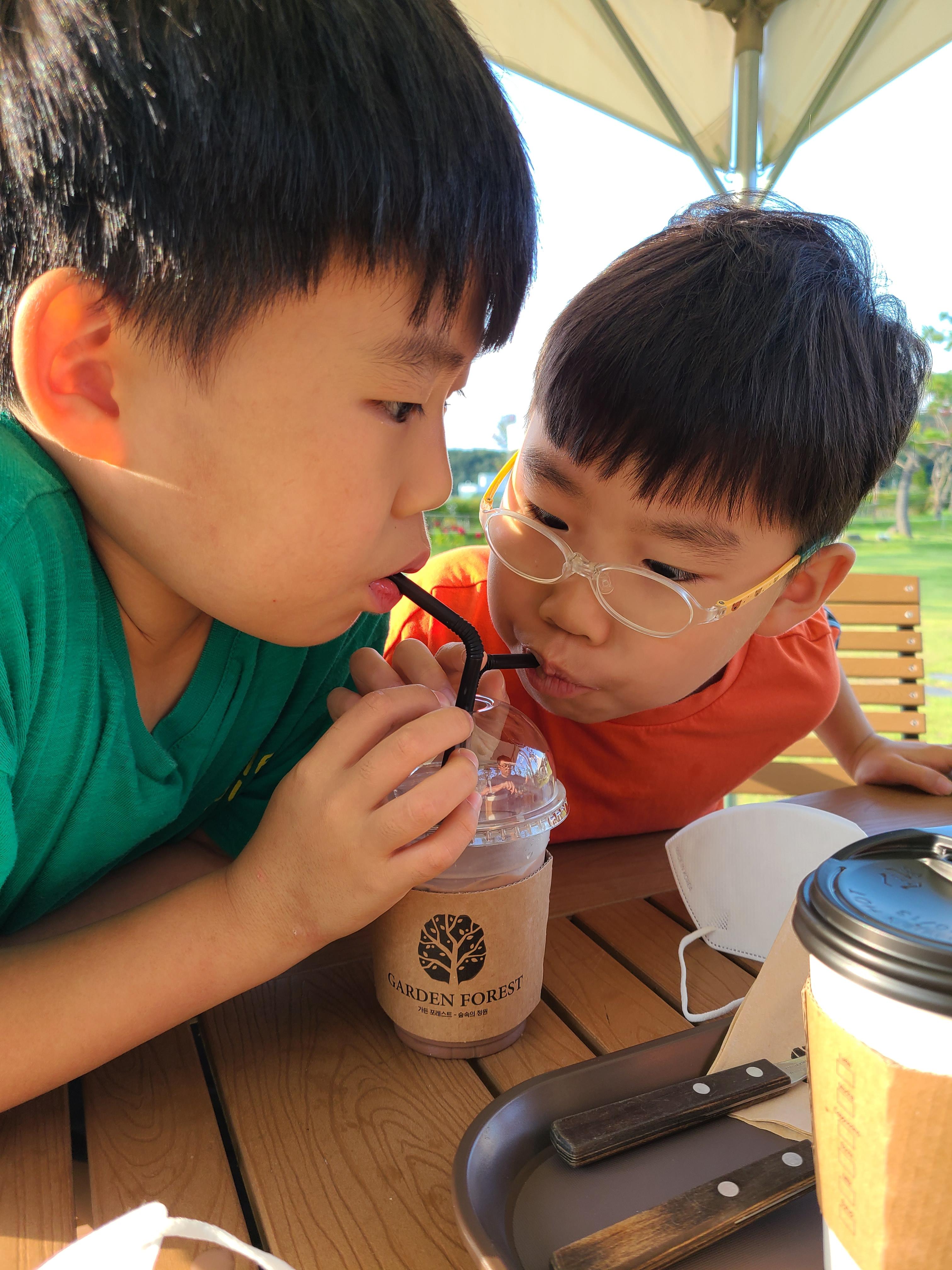 간신히 뒤어가는 애들 잡아놓고 사진 찍으라고 부른다. 이제 엄마랑 카페 가는 것도 싫고 먹으러 가는 것도 싫고 친구들이랑 놀이터 가는 것이 더 좋은 나이라는 것을 실감한다. 예전엔 아이들 놓고 편하게 차 한잔 마시는 것이 소원이었는데 지금은 아이들을 꼬셔서 카페에 가야 한다.