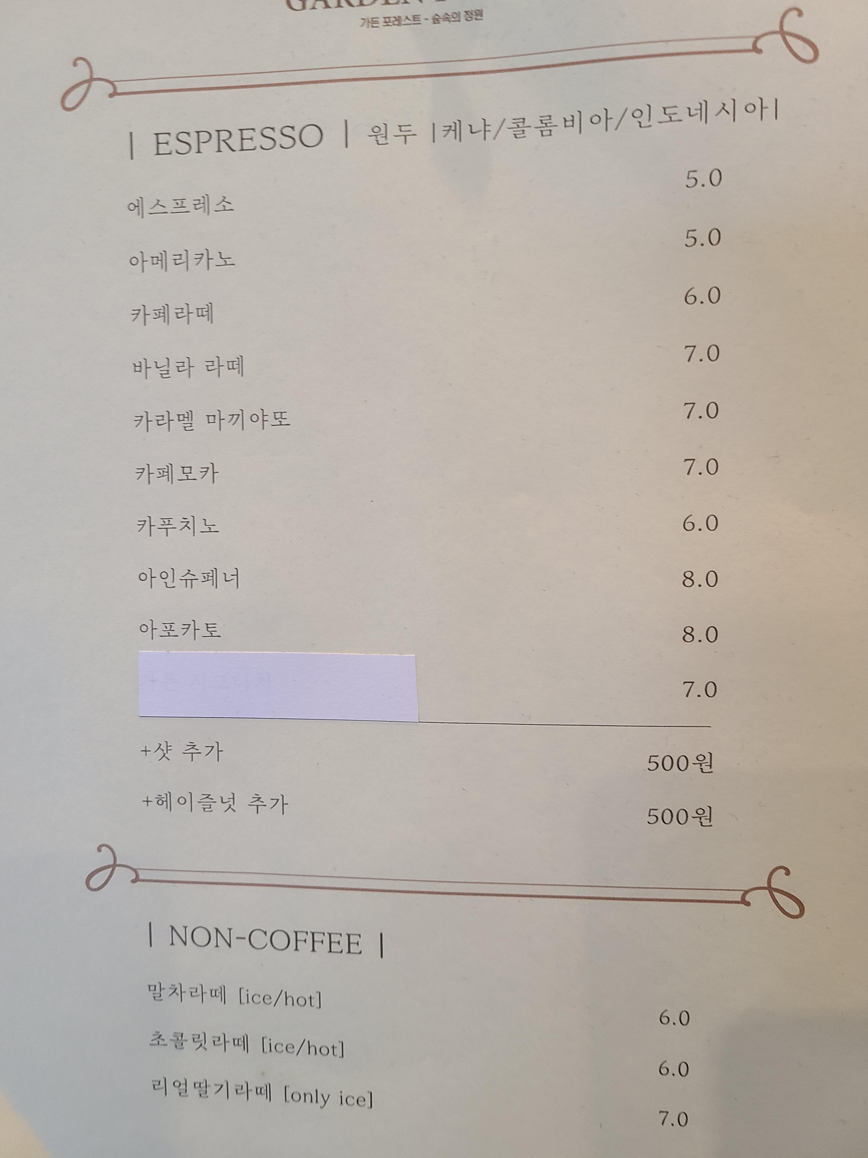가든 포레스트 메뉴이다. 티 종류는 6천 원 주스와 에이드는 7천 원선이다.