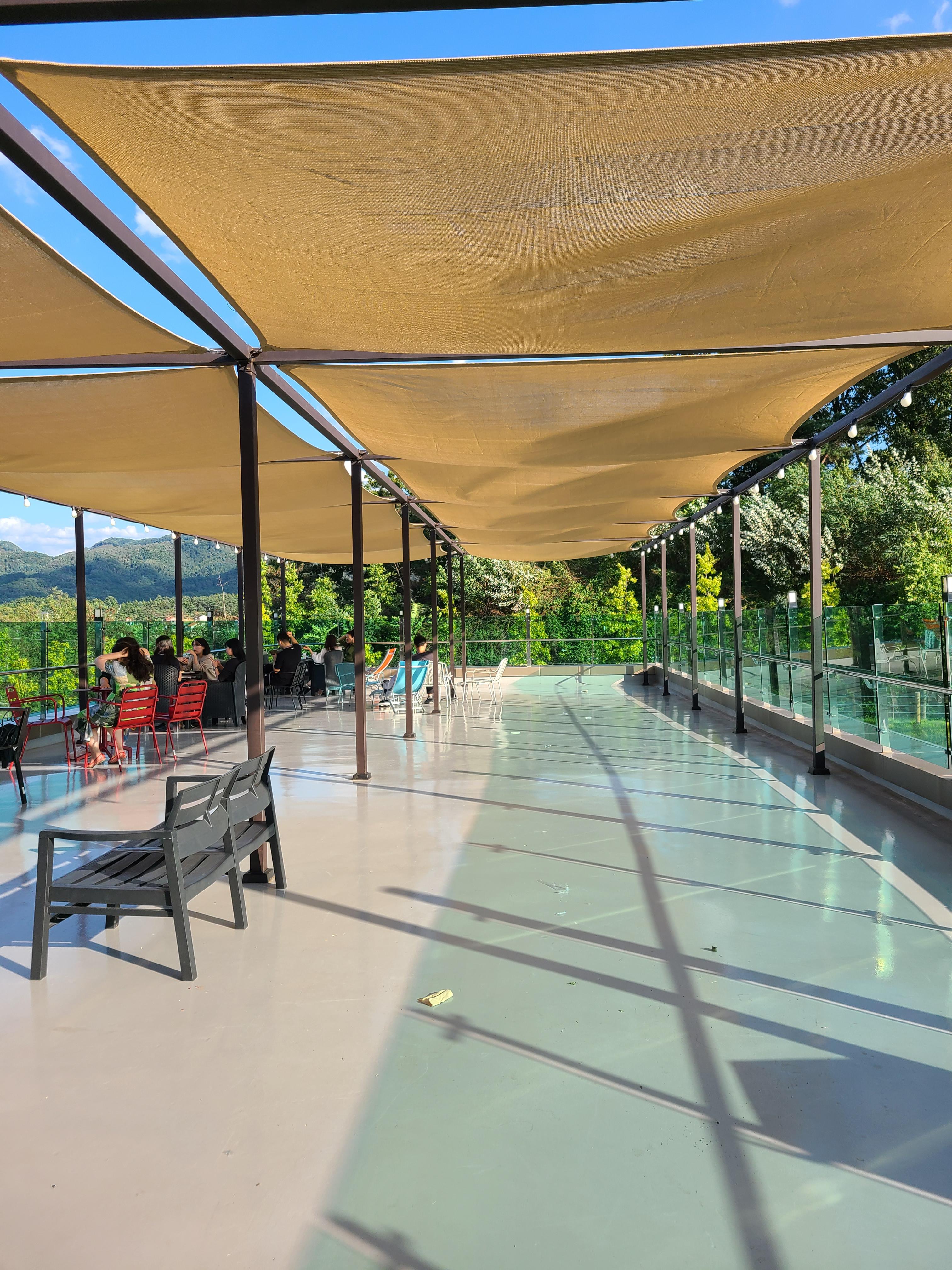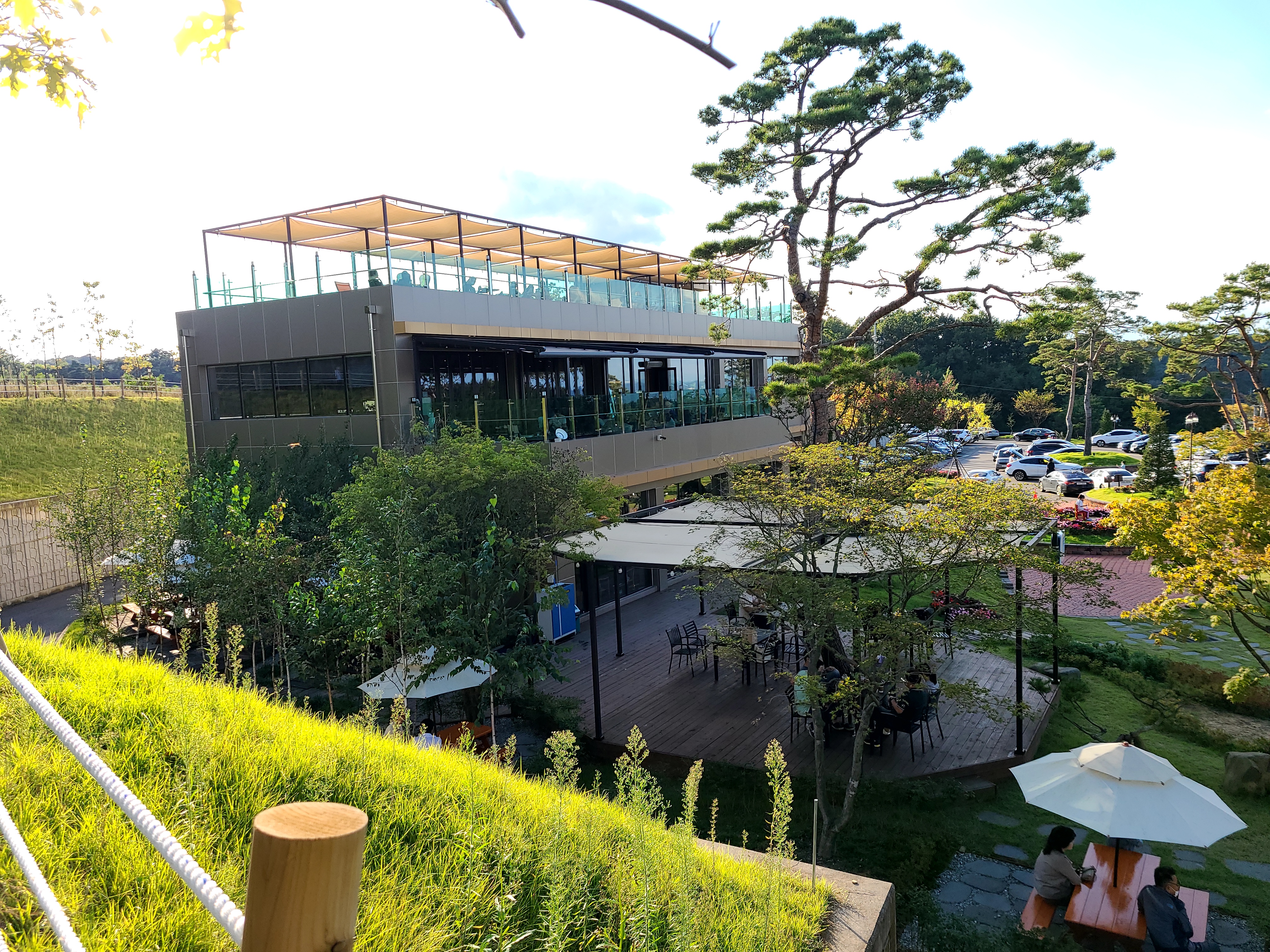 건물의 모습 파라솔도 곳곳에 있다. 지금 같은 가을 날씨에는 건물 안 보다 이런 테이블이 더 좋다. 그리고 아이들과 함께 놀기에도 이런 야외 파라솔 자리가 훨씬 인기가 많다.
