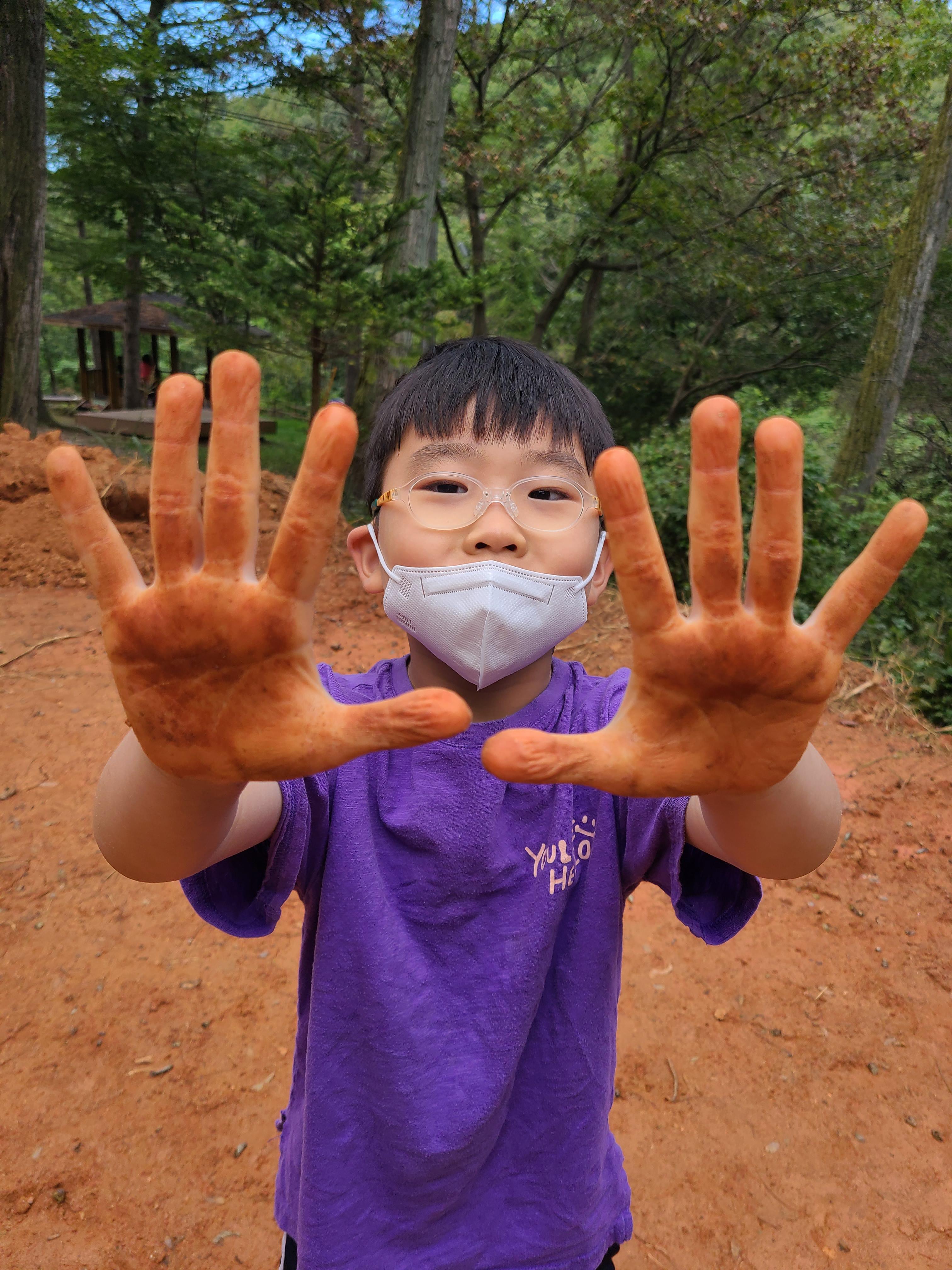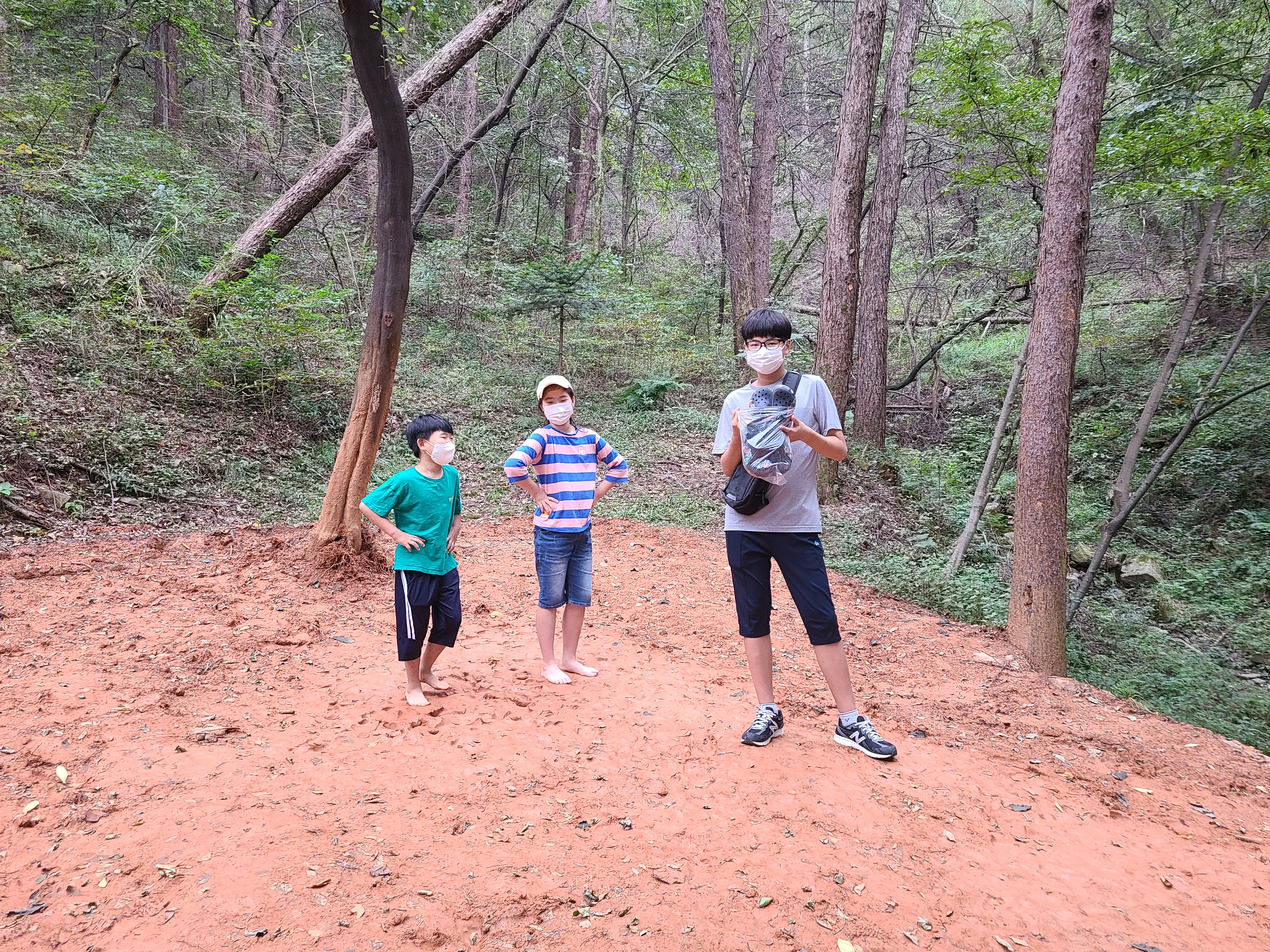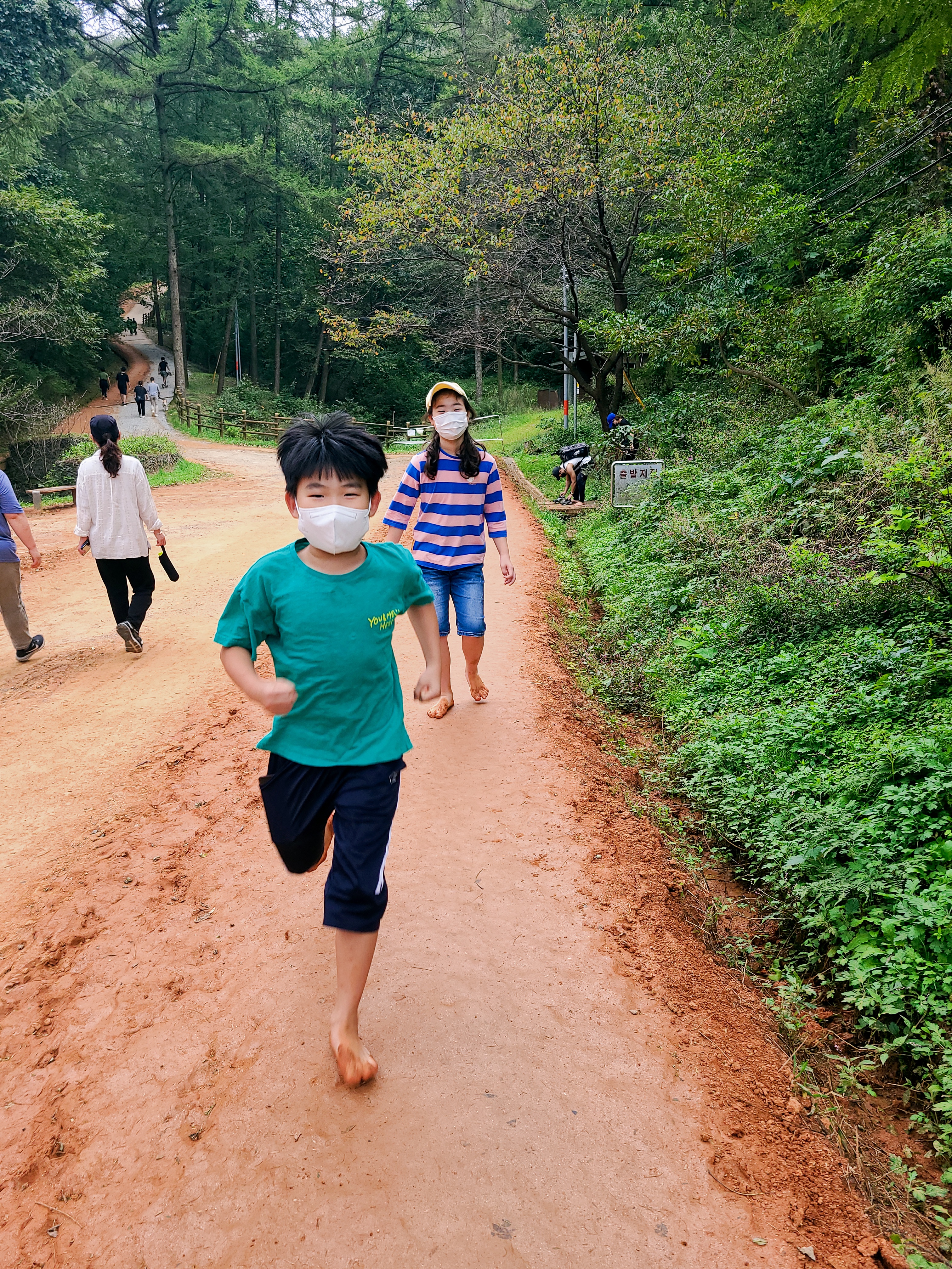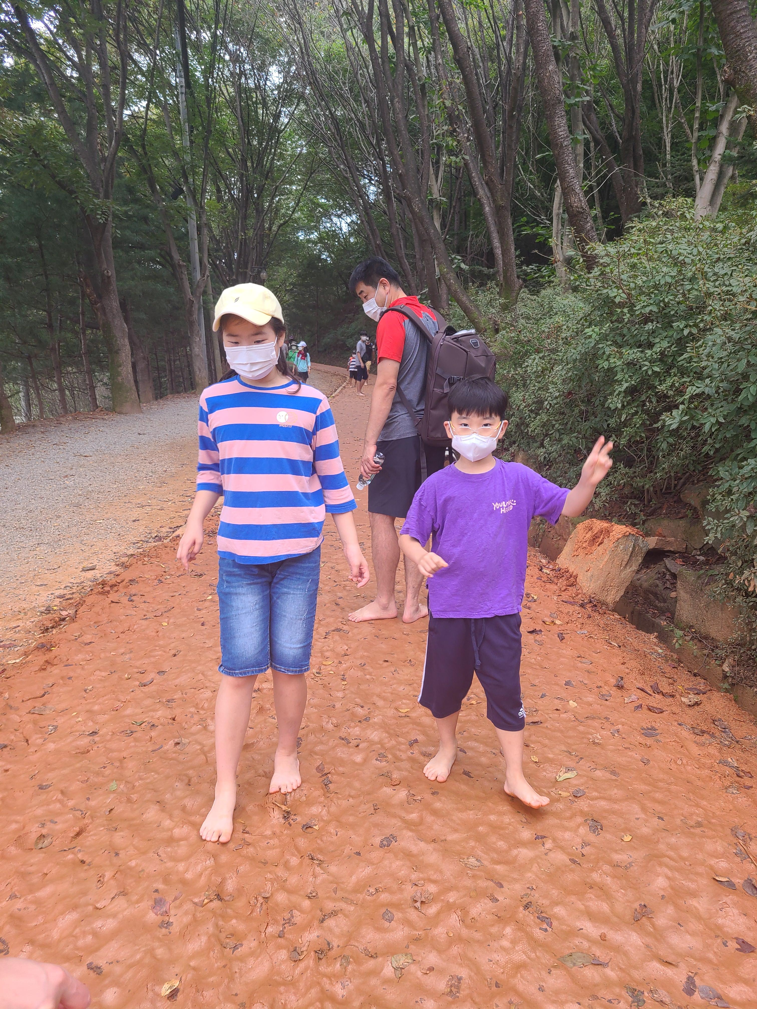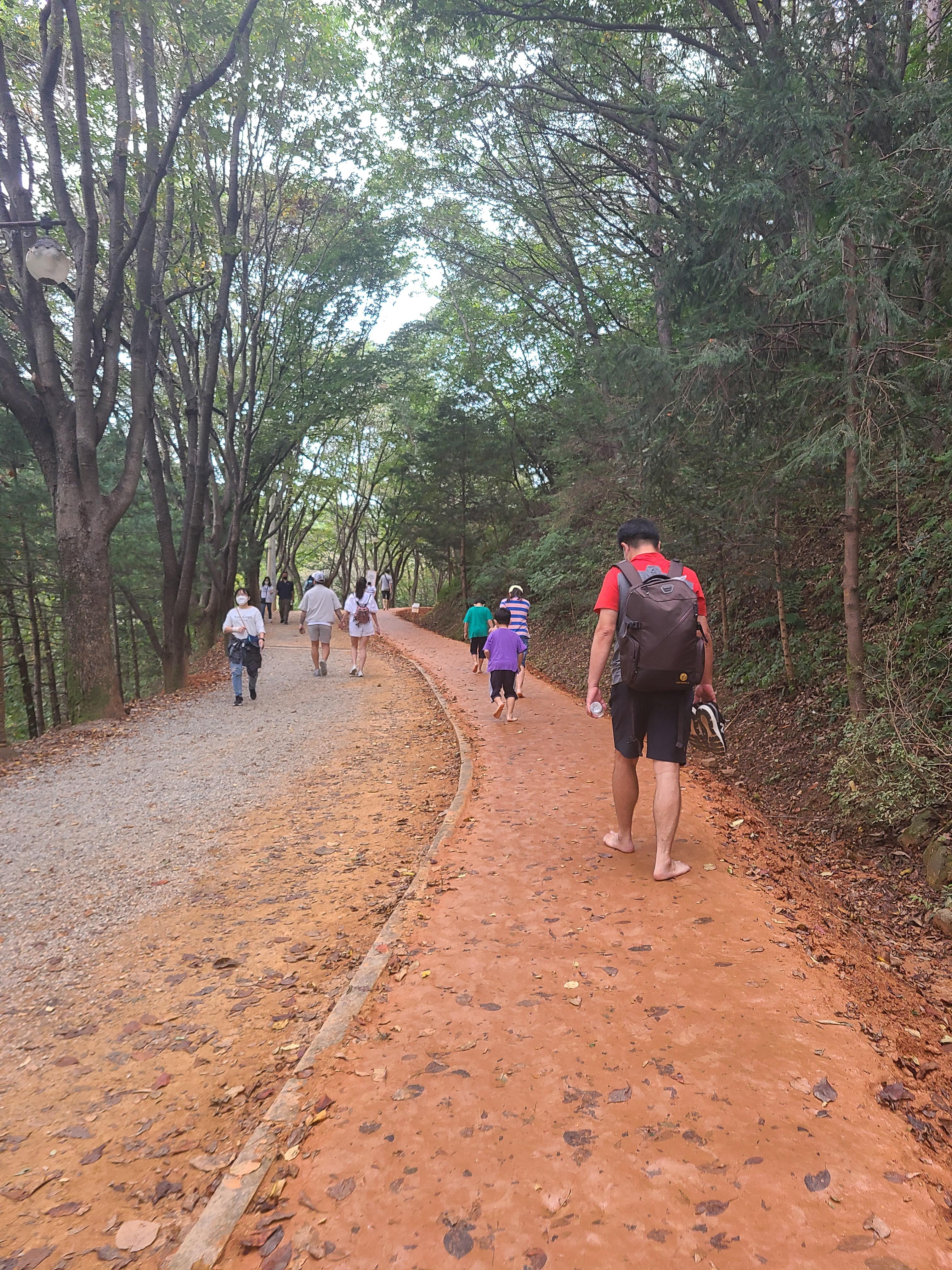 황톳길이 비가 오면 폭신하지만 사람들이 많이 걸으면 약간 미끄러운 길도 있다. 어른들은 천천히 걷지만 아이들은 팔짝 팔잘 잘 뛴다. 내려가는 길에도 아이들은 맨발로 가고 싶다면서 뛰기 시작한다.