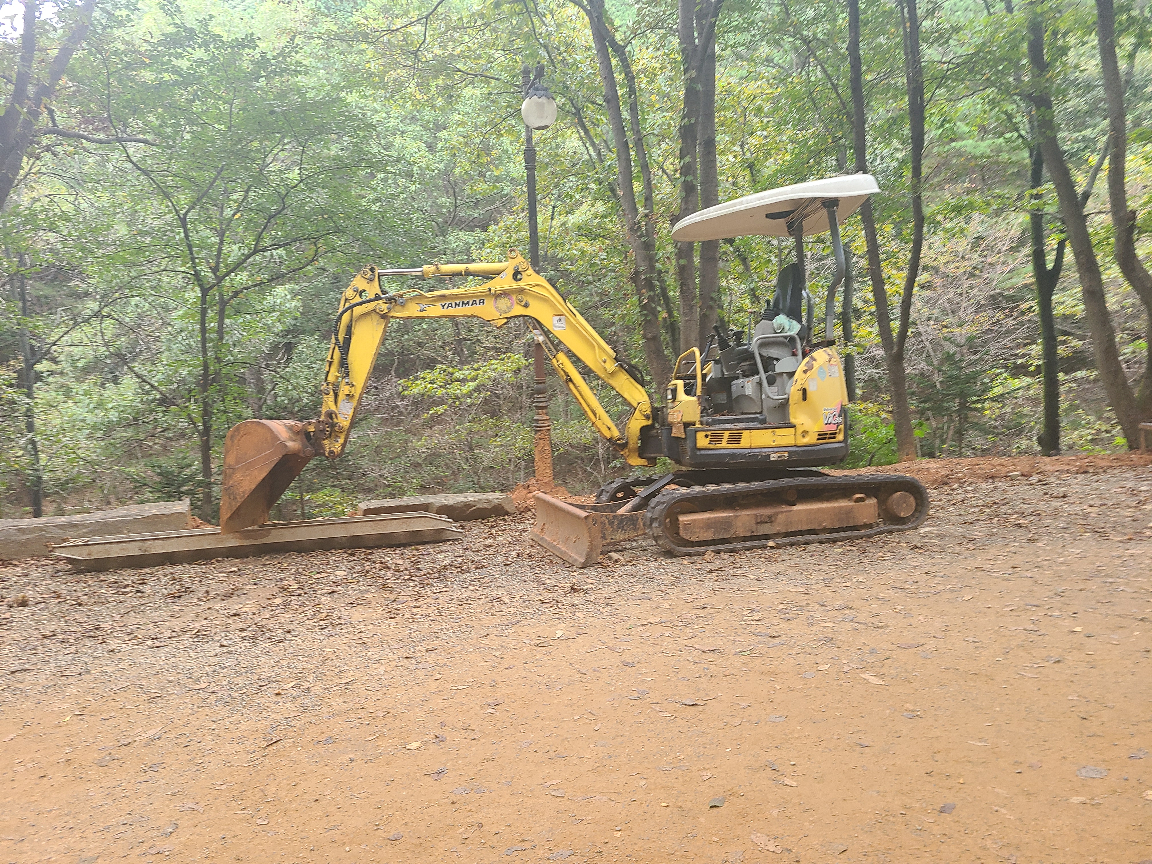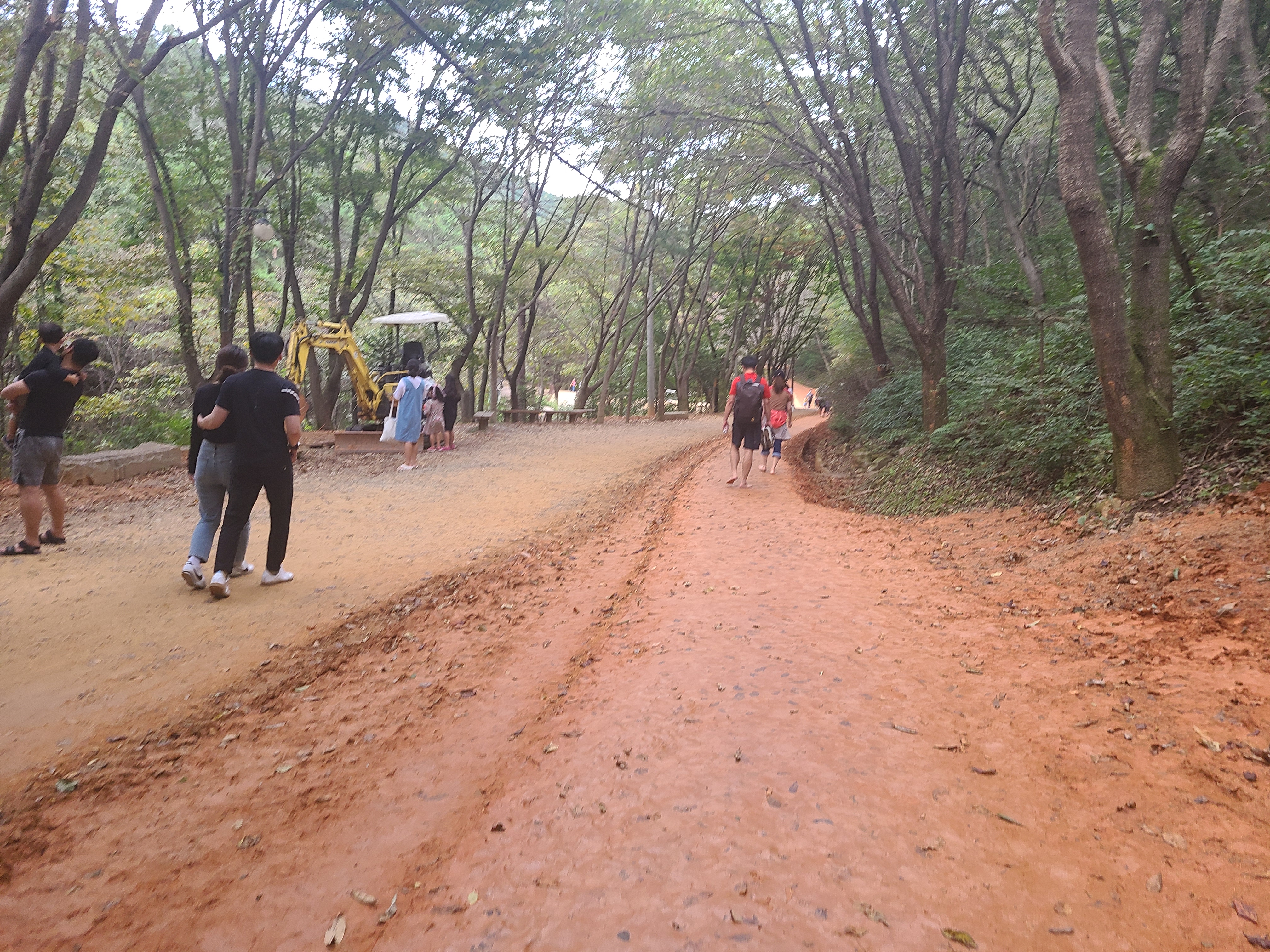 황톳길을 조성하는 작은 포크레인이 중간에 있다. 아이들의 포토존으로 많이 쓰인다.