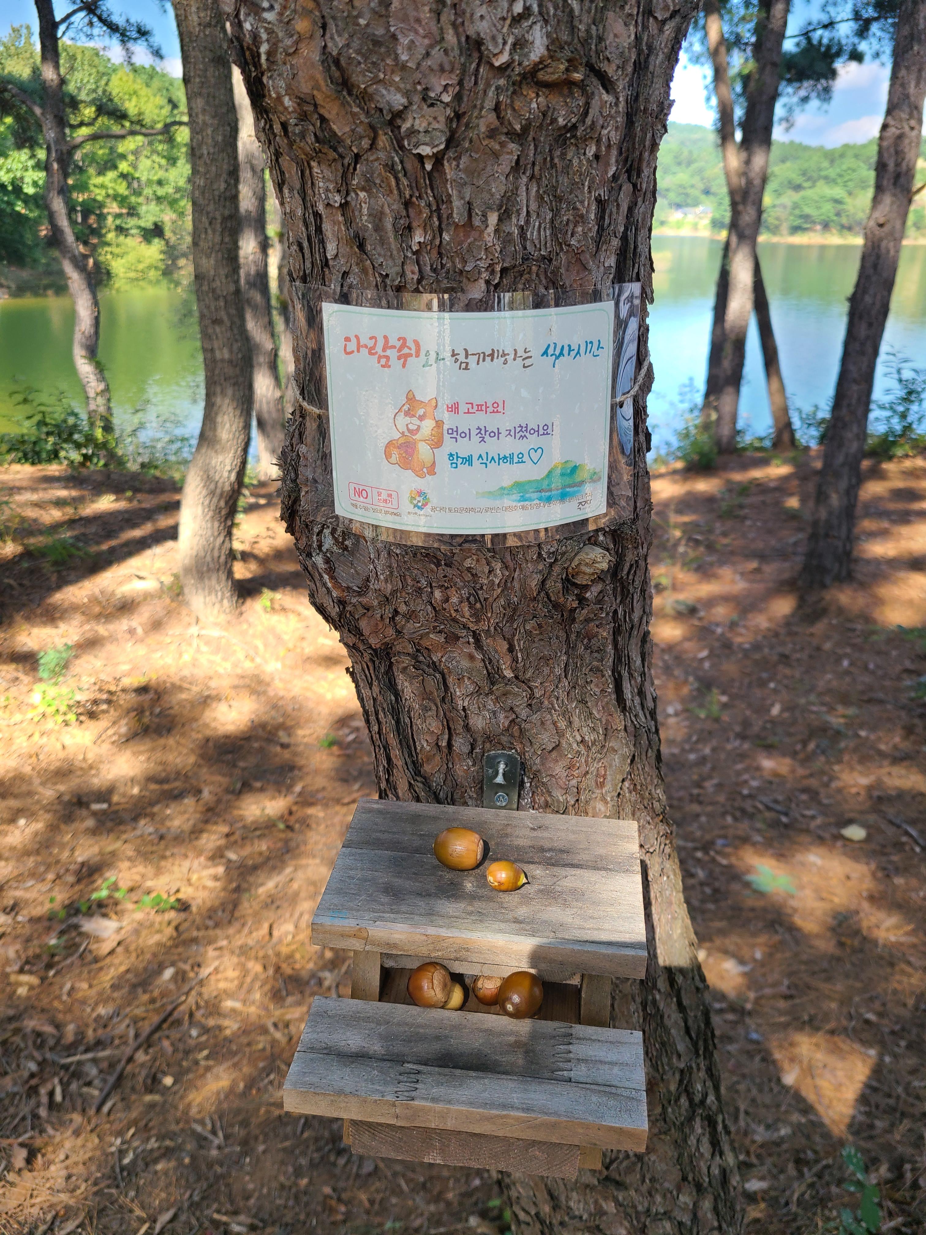 다람쥐와 함께하는 식사시간이다. 먹이를 찾아 헤매지 말고 여기서 함께 식사하자는 의미에서 만들어 놓은 것 같다.