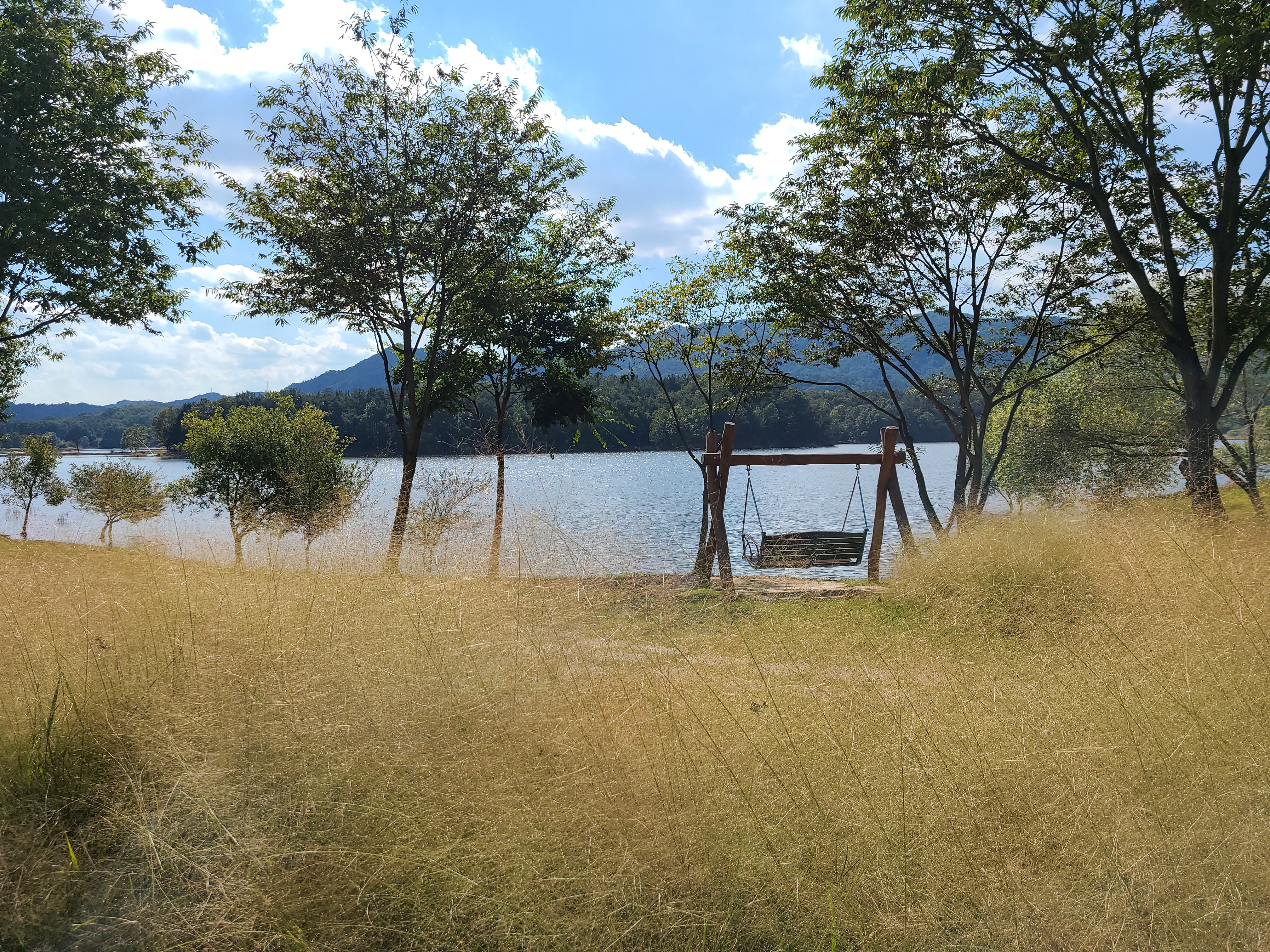 핑크뮬리는 아니고 비슷한 느낌의 식물 뒤로 흔들의자가 보인다. 호수를 보면서 쉬어도 될 듯싶다. 아이들을 데리고 왔으면 그네를 한참 테 울텐데, 엄마 아빠를 모시고 왔으면 좋았을 텐데, 이런 생각이 드는 것은 이곳이 너무 좋았기 때문일 것이다.