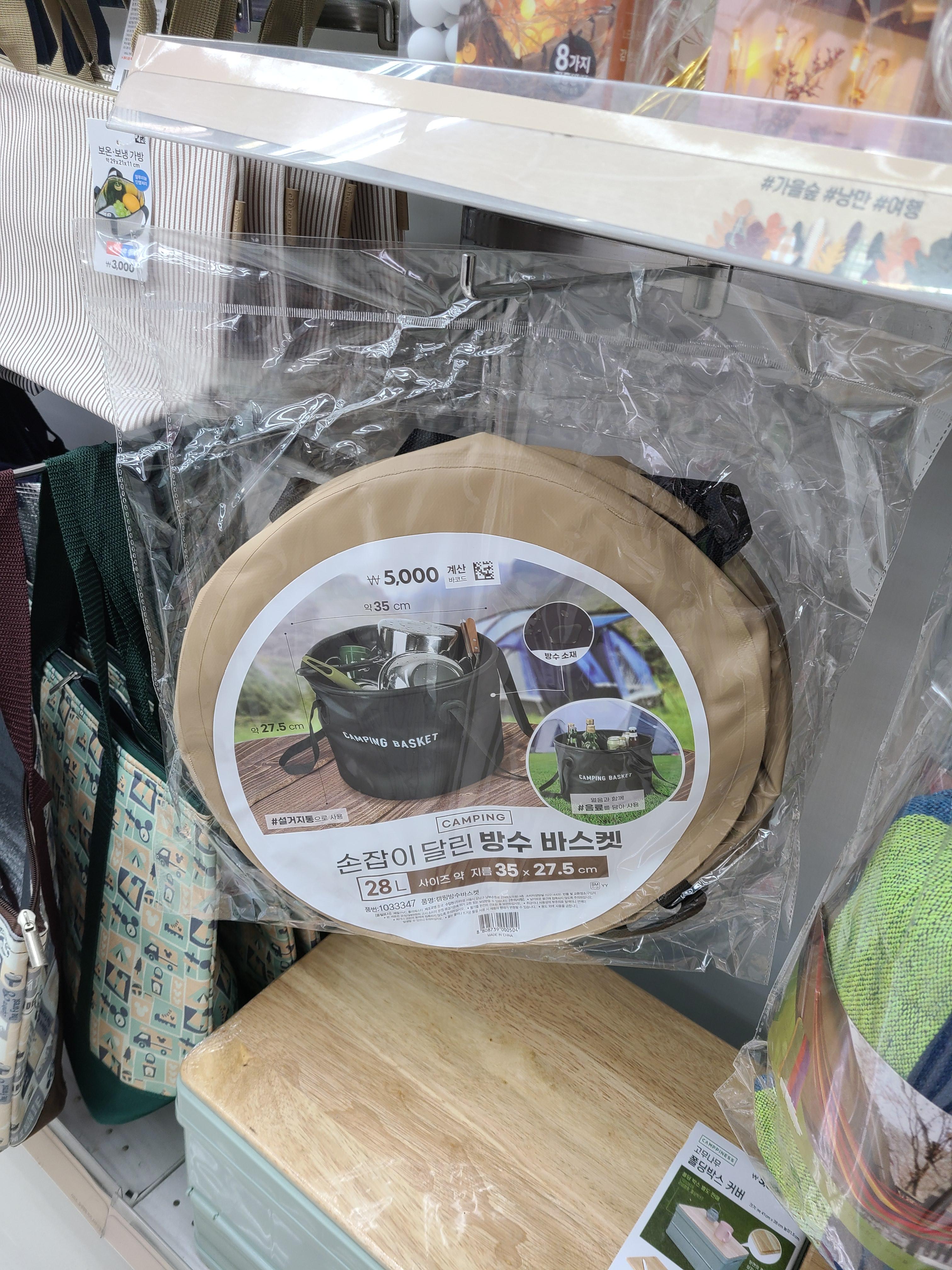 손잡이 달린 방수 바스켓 28리터 사이즈 지름 35cm 높이 27.5cm는 갸격은 5000원입니다.