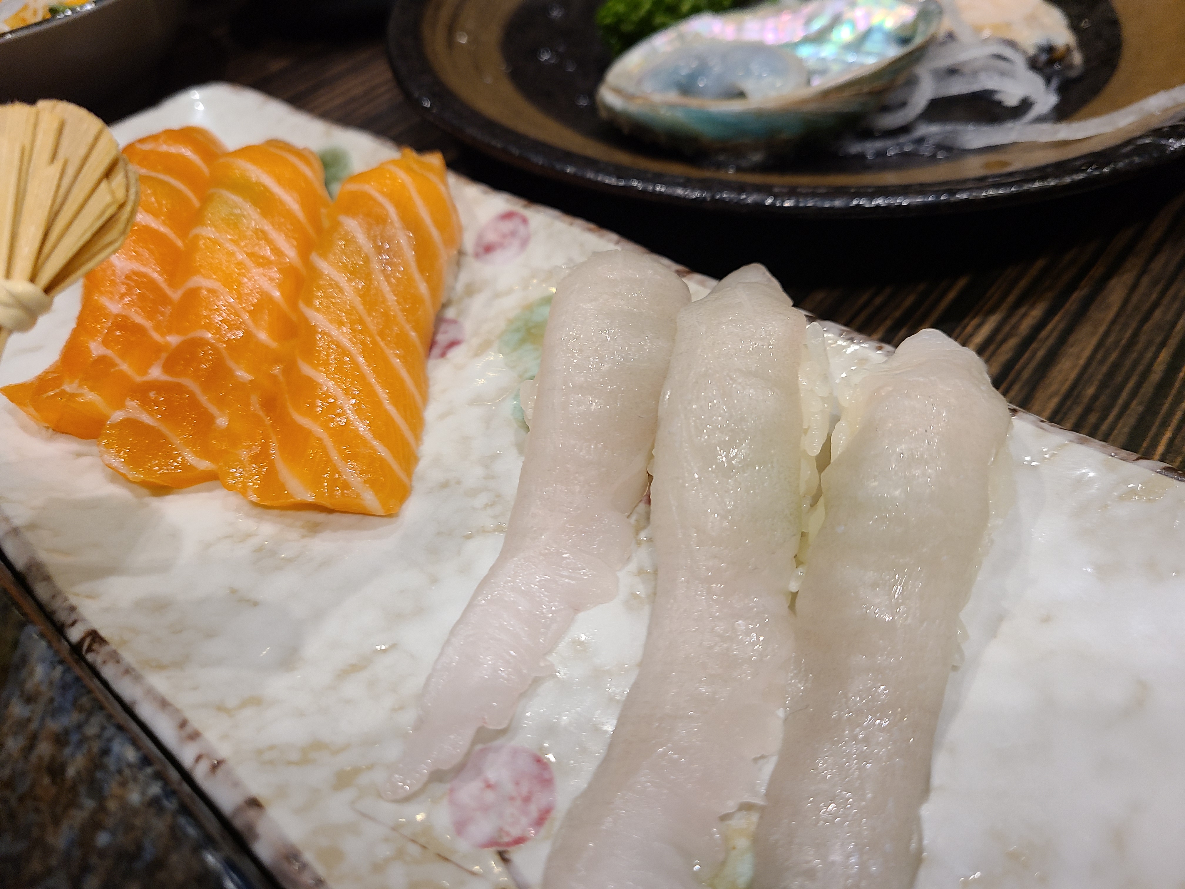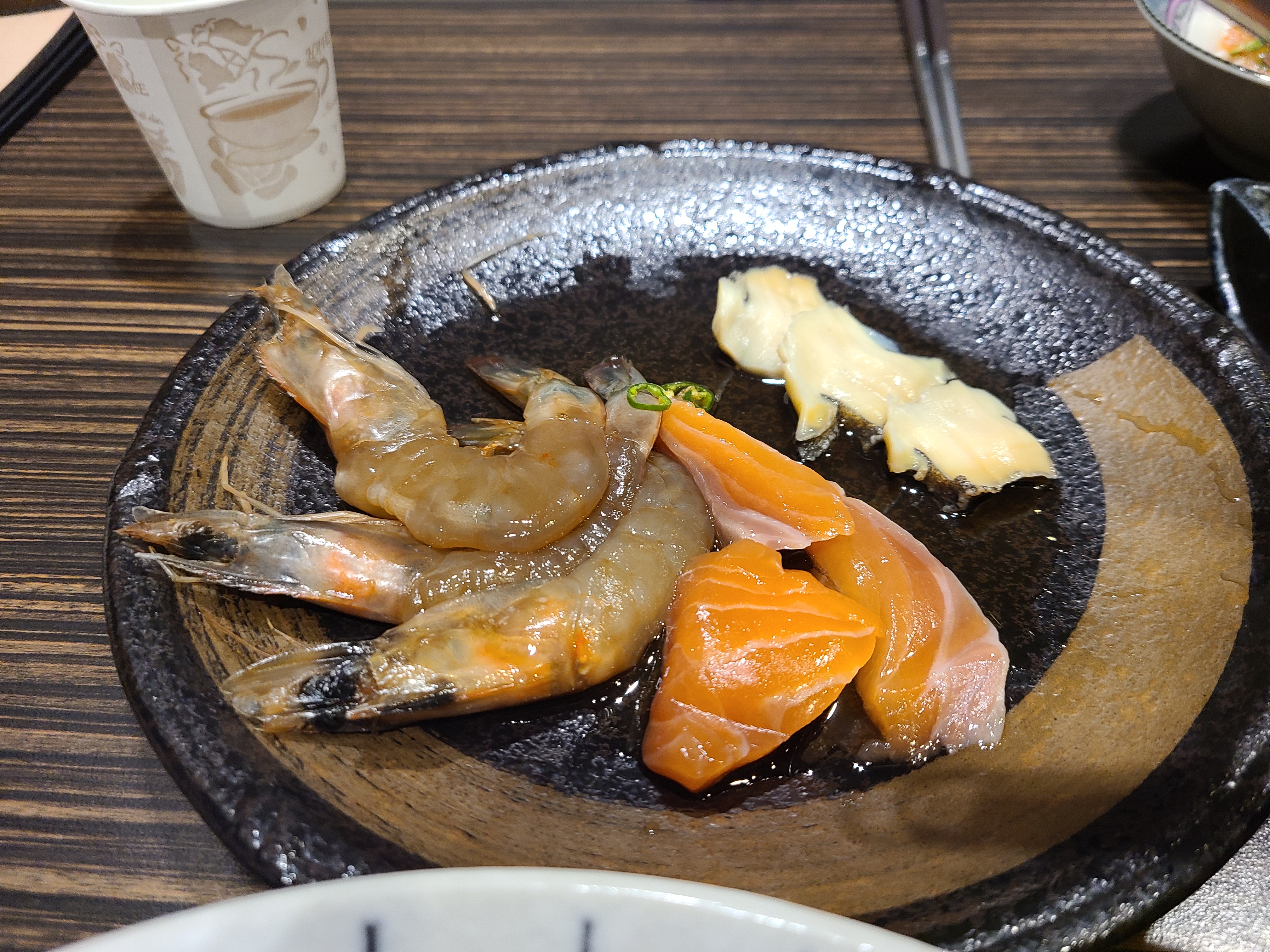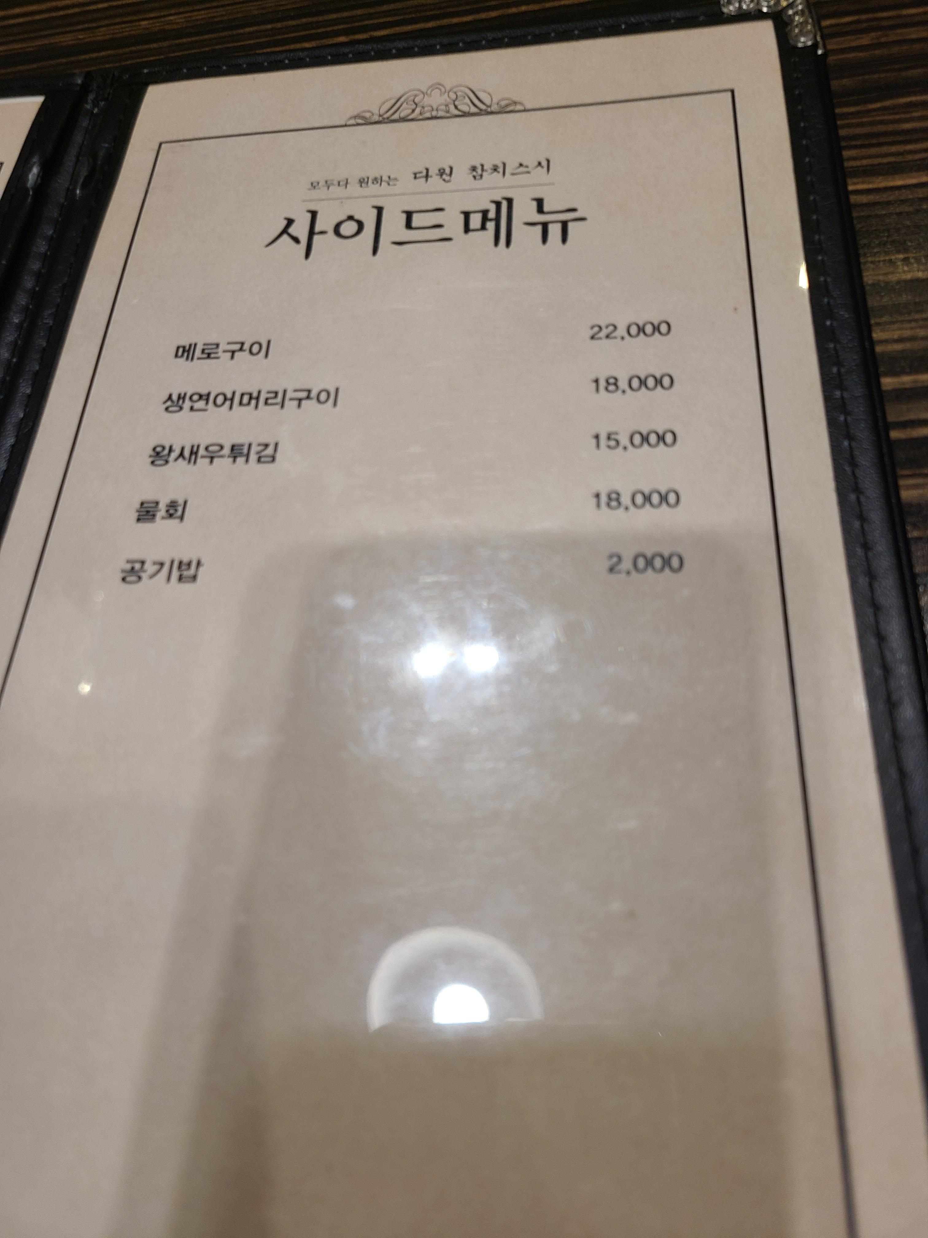 사이드 메뉴로 메로구이, 연어 머리구이, 물회, 왕새우 튀김도 판다.