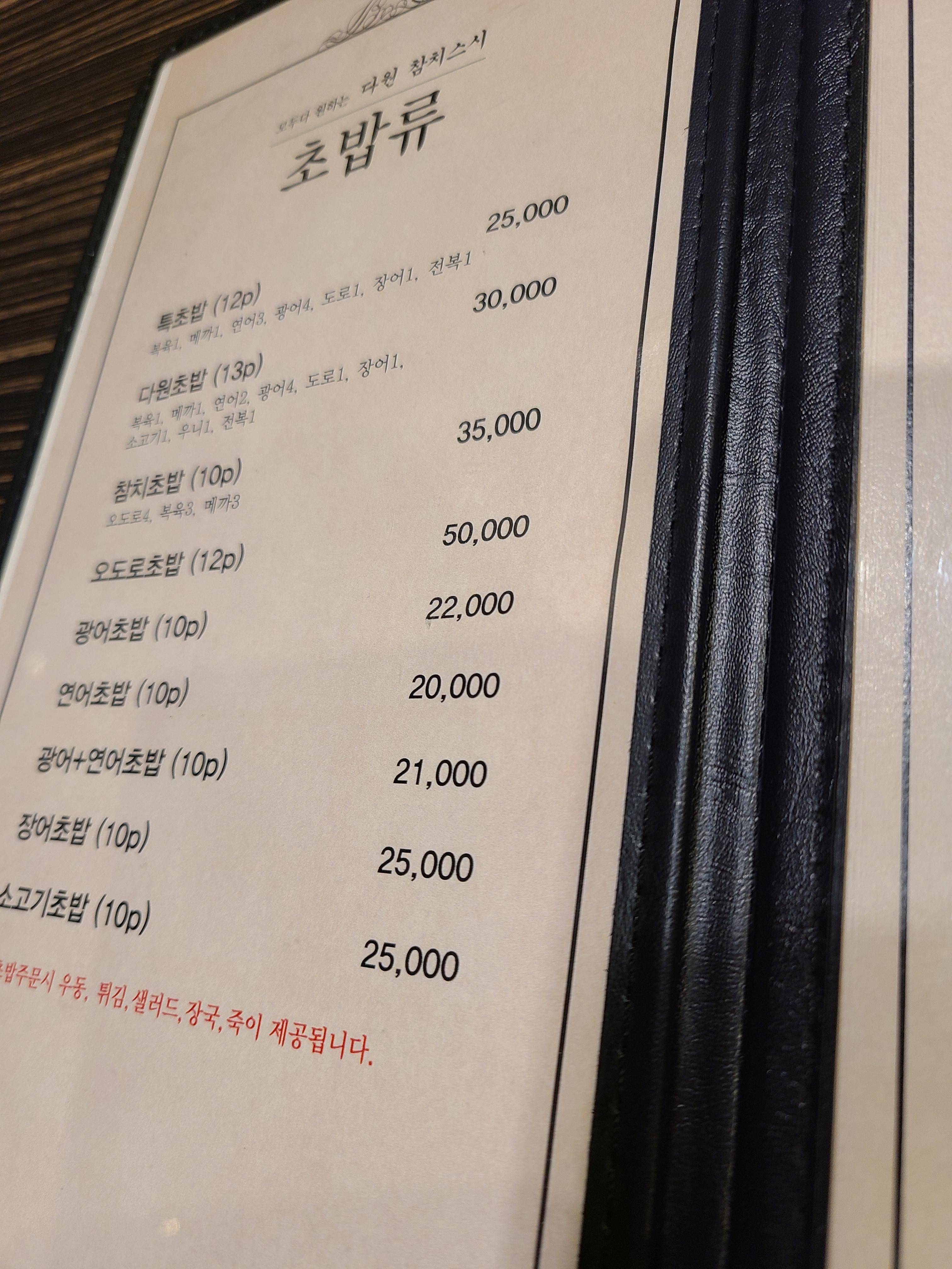 특초밥 25000원, 다원초밥 30,000원 연어, 장어, 소고기 초밥 등이 있다.