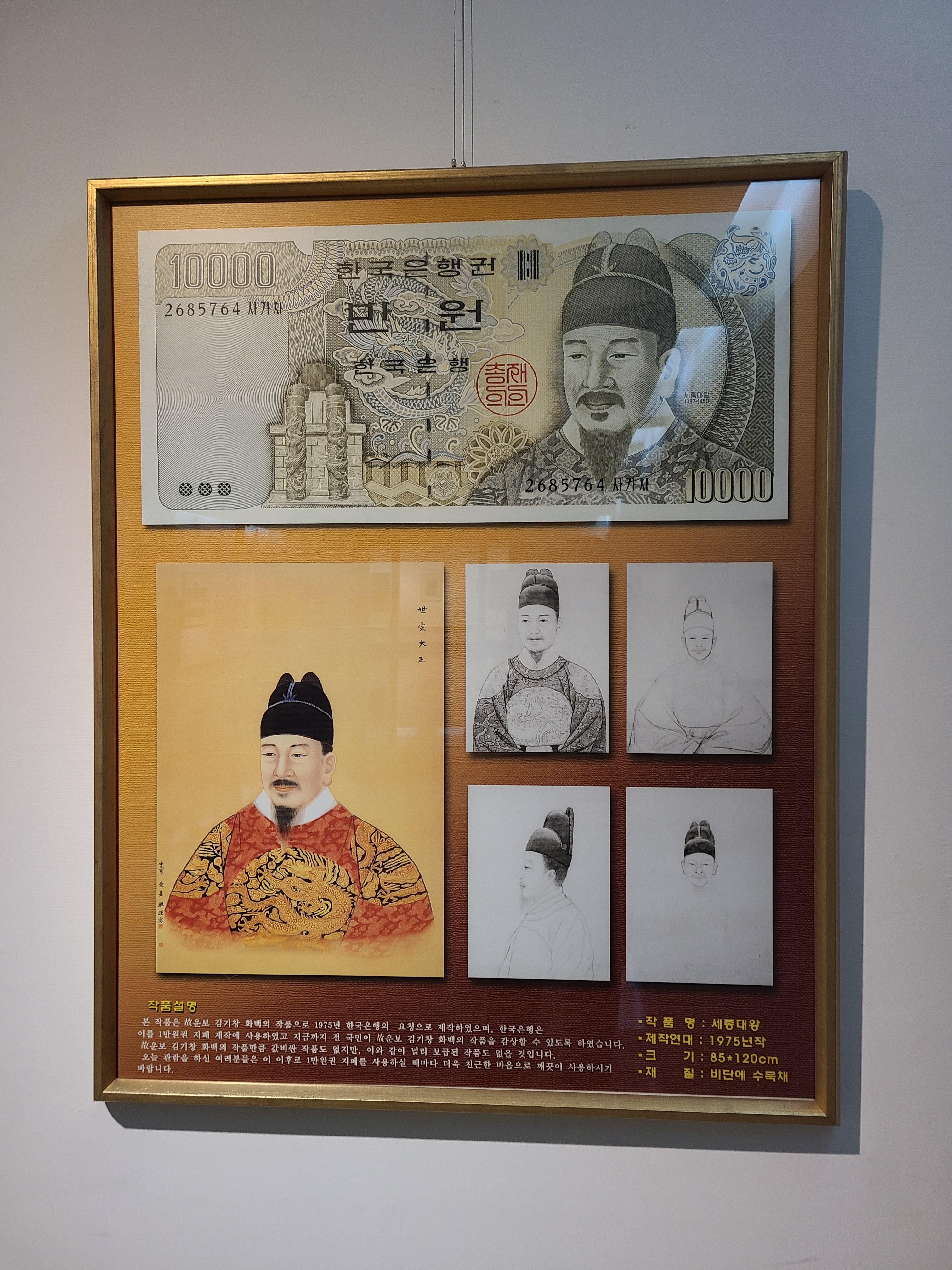 1975년 한국은행의 요청으로 만들어진 것으로 한국은행은 이를 1만 원권의 지폐로 사용하여 운보 김기창 화백이 이름이 널리 알려진 계기가 되었다.