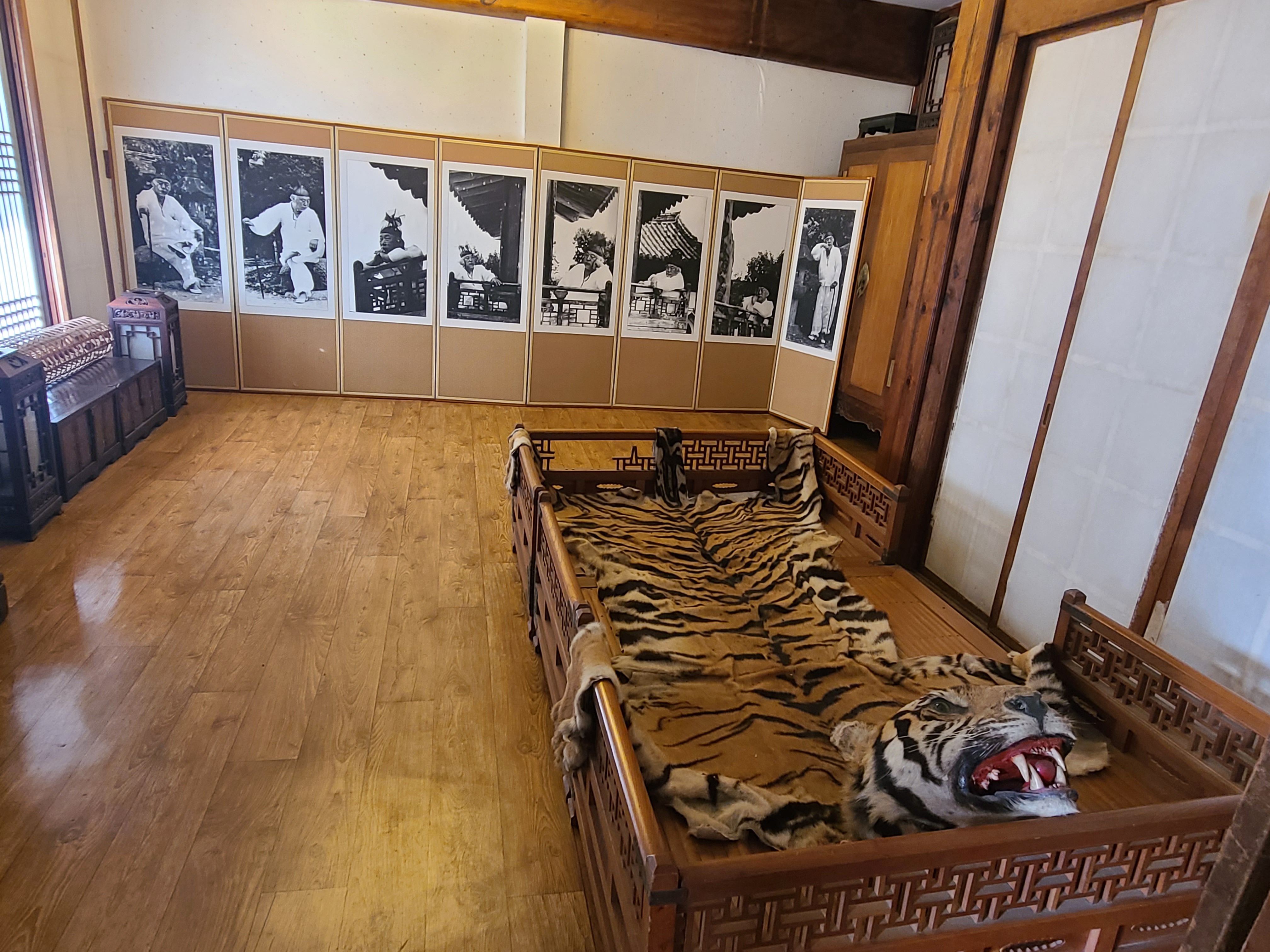 한국의 유명하고 잘 알려진 화백의 집답게 호랑이 가죽으로 되어있는 카펫이 제일 눈에 띄었다. 병풍엔 운보의 집에서 보낸 노후의 사진들이 있다.