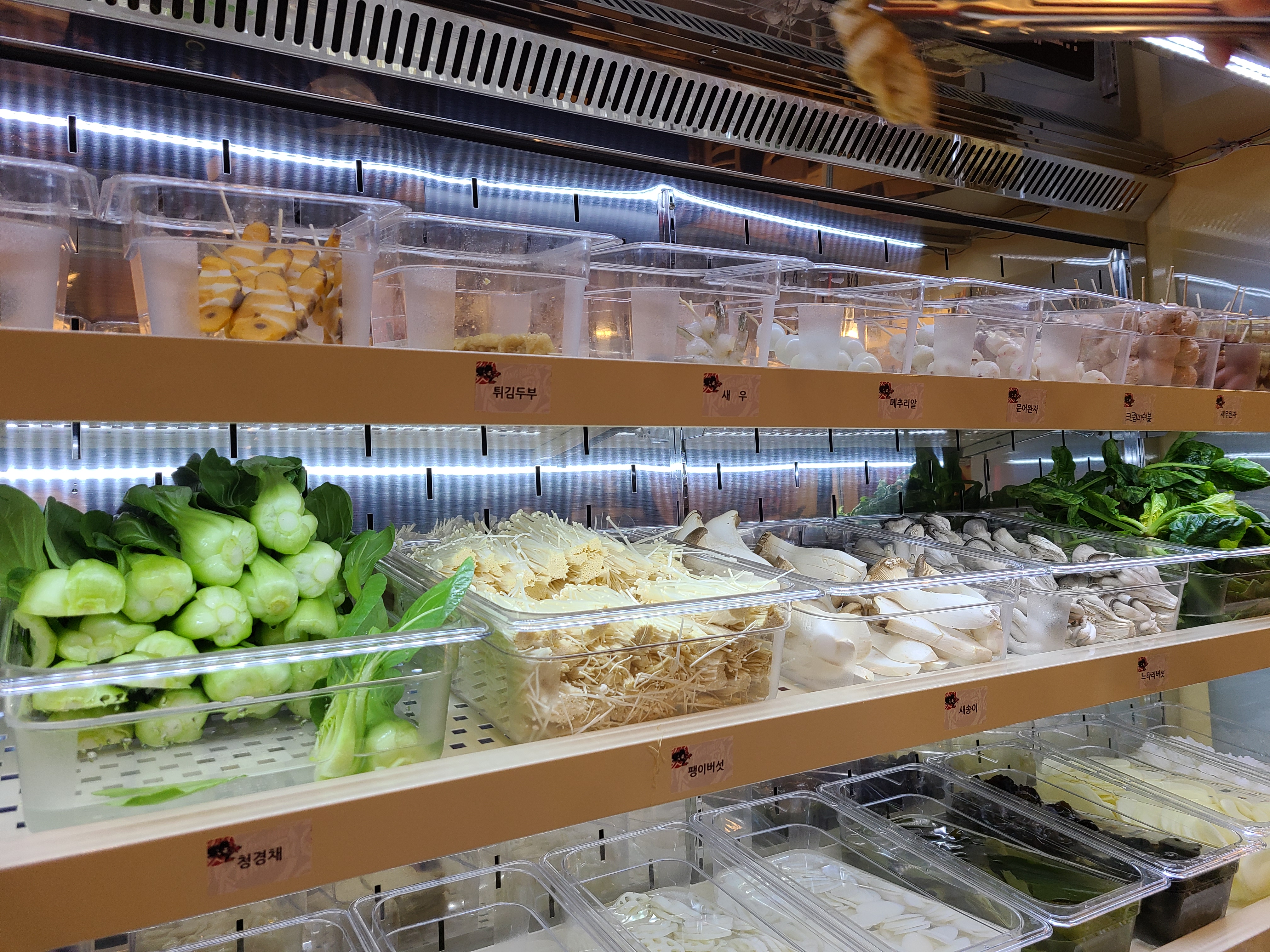 흰색 볼에다가 먹고 싶은 것을 담아서 무게를 다는 것이다. 처음에는 무엇을 고를 줄 몰라서 야채와 꼬치만 골랐는데 마라탕의 핵심은 면이라는 것을 안 후부터 이것저것 면을 골라 넣었다. 옆에 소고기와 양고기도 있어서 그것도 넣으면 국물 맛이 좋다.