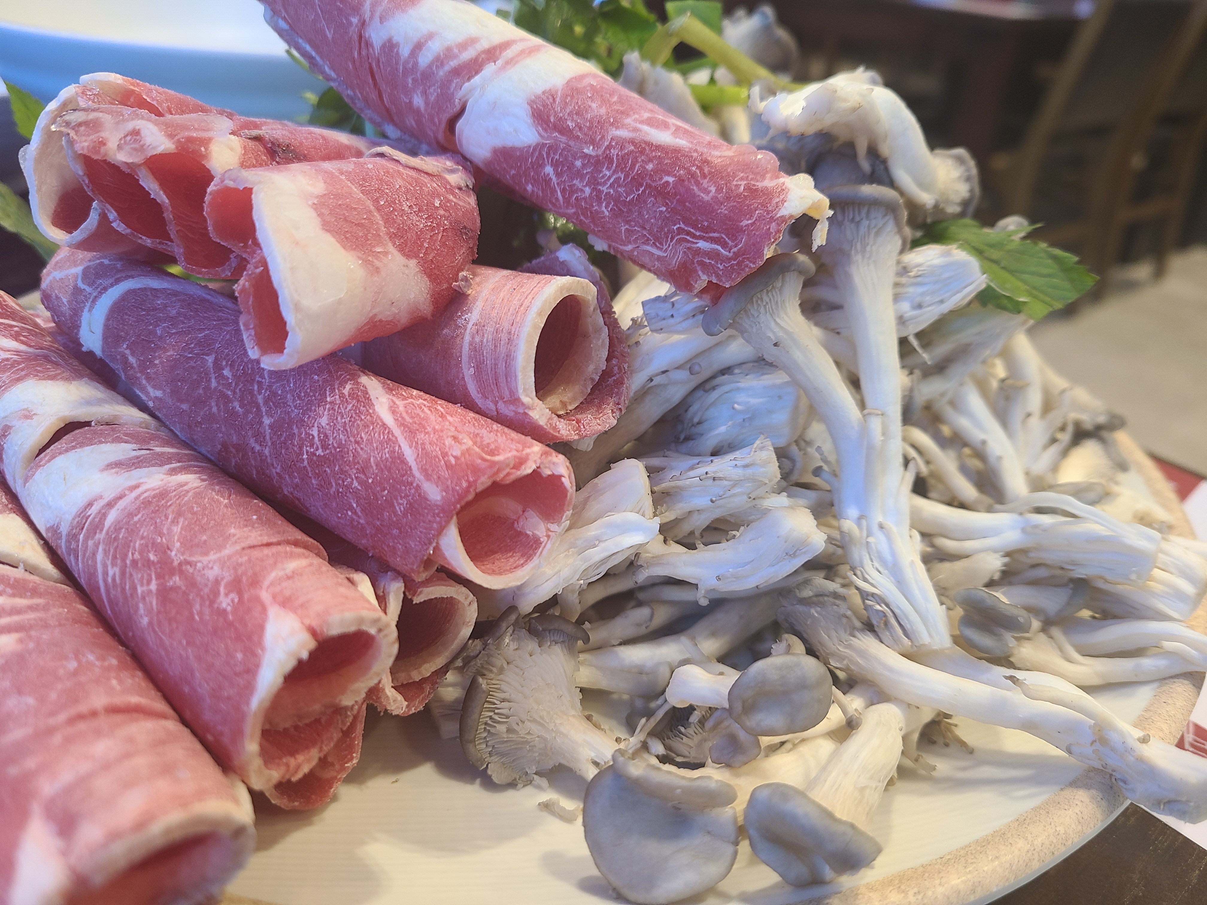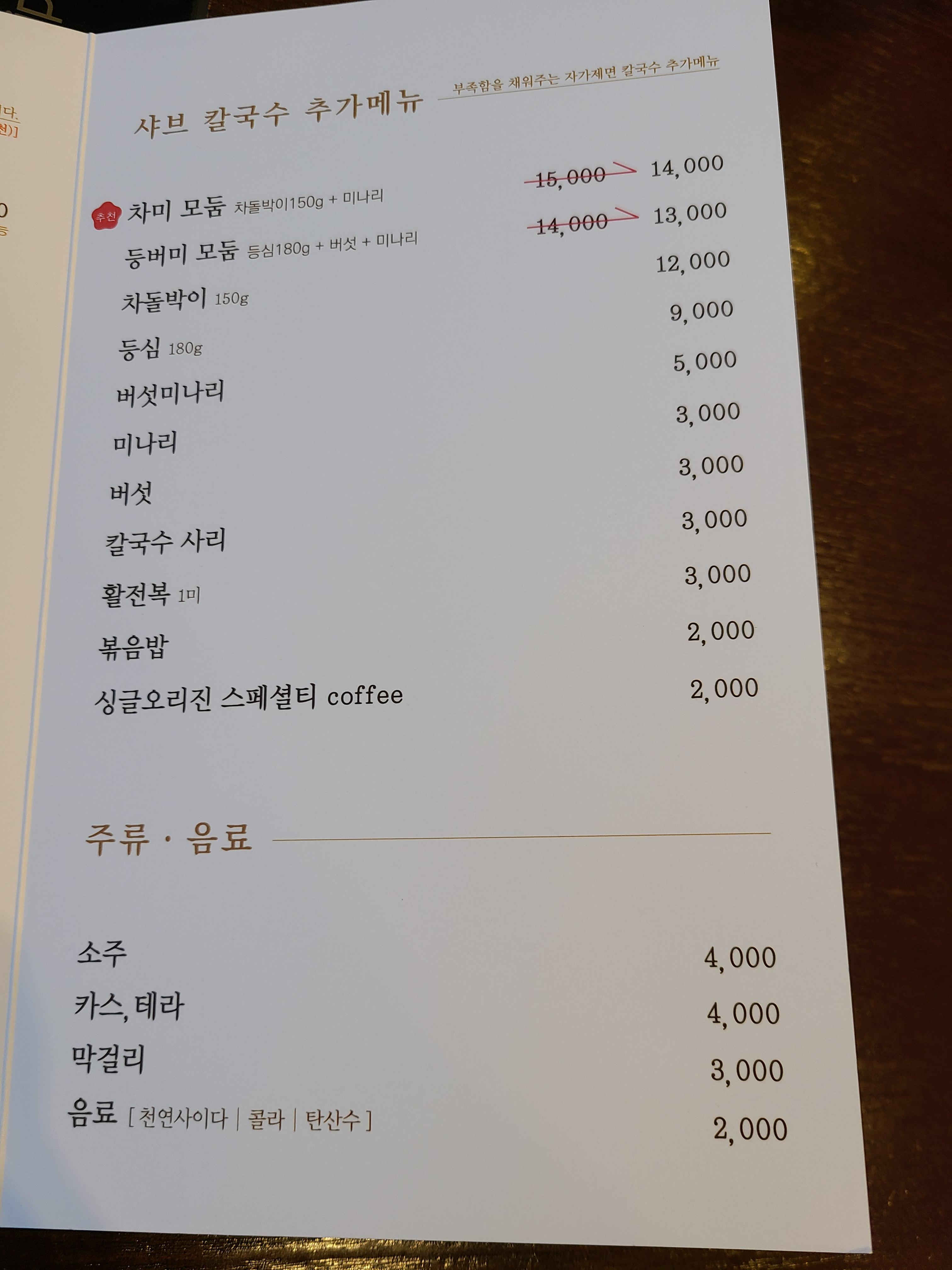 샤뷰 칼국수 추가로 버섯 미나리나 차돌막이 전복 칼국수 사리 등을 시킬 수 있다.