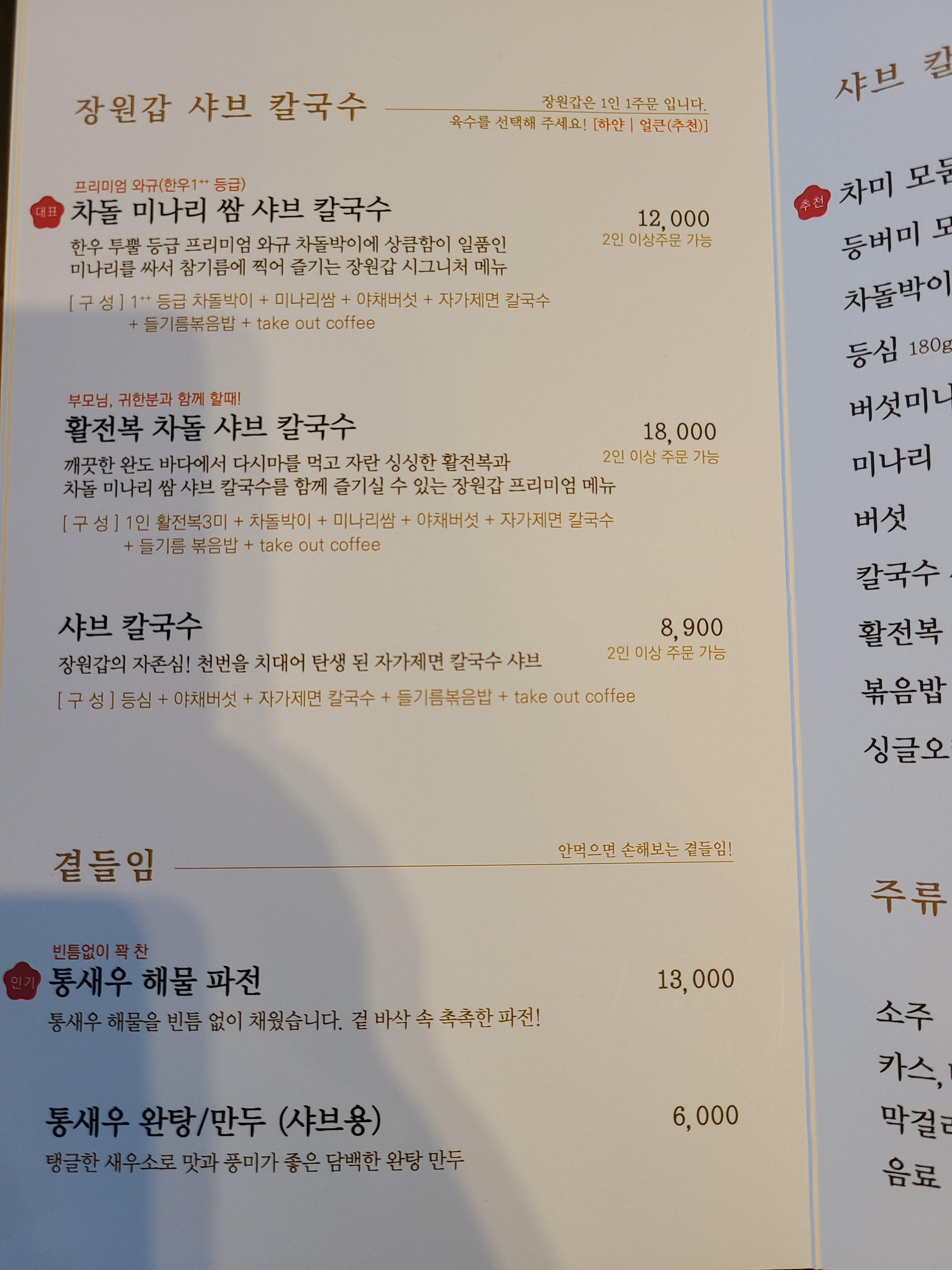 장원갑 칼국수는 샤부 칼국수를 많이 먹는데 고기 등심이 들어가고 야채와 버섯 칼국수 나중에 들기름 볶음밥까지 해먹을 수 있는 것이다. 곁들임 메뉴로는 통새우 해물파전과 통샤우 완탕과 만두가 있다.