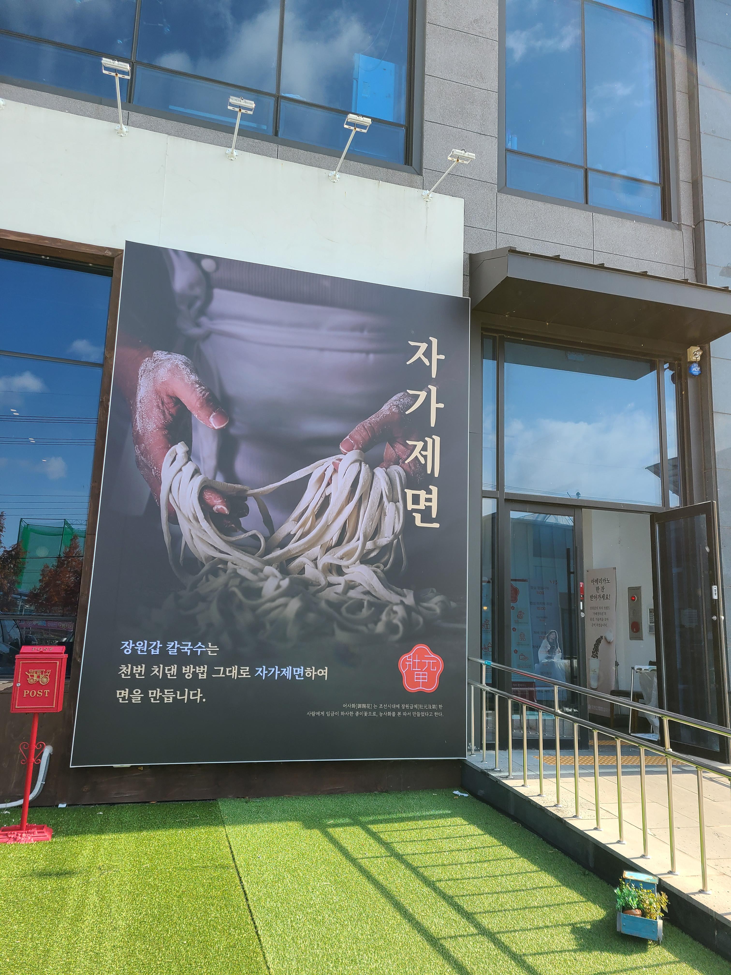 장원갑 칼국수는 천번을 치댄 방법 그대로 자가제면하여 면을 만든다고 씌여있다. 이곳을 장점은 주차하기 편하다는 것이다. 수십대가 할 수 있어 차를 가져오는 사람들이 많을 경우는 이곳에서 모임하기 편하다.