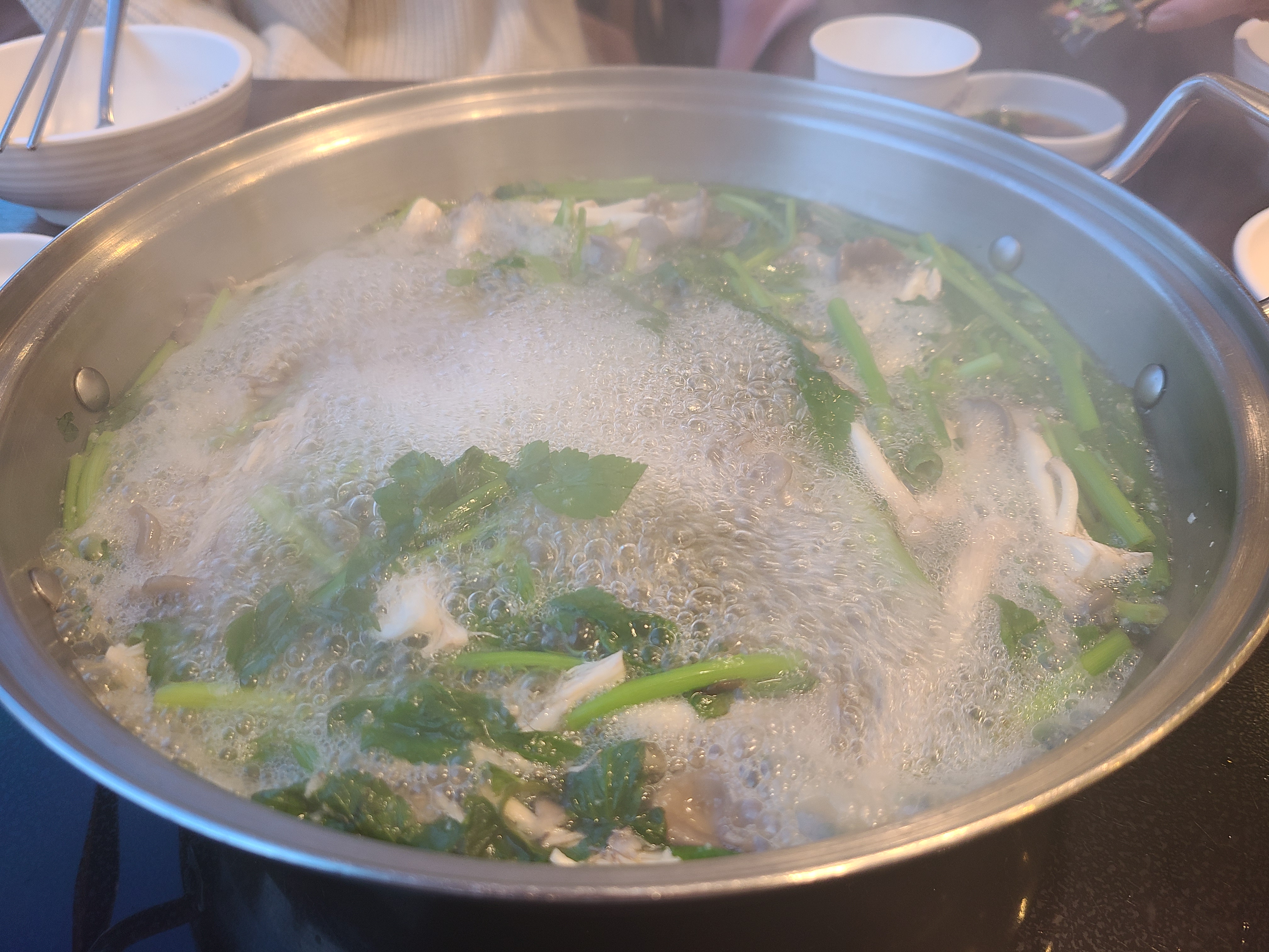 팔팔 끓여서 쫃득한 면과 미나리 향기가 어우러져 맛있다. 샤브는 좋아하는데 면을 더 고급진 것을 먹고 싶다면 장원갑 칼국수를 추천한다.