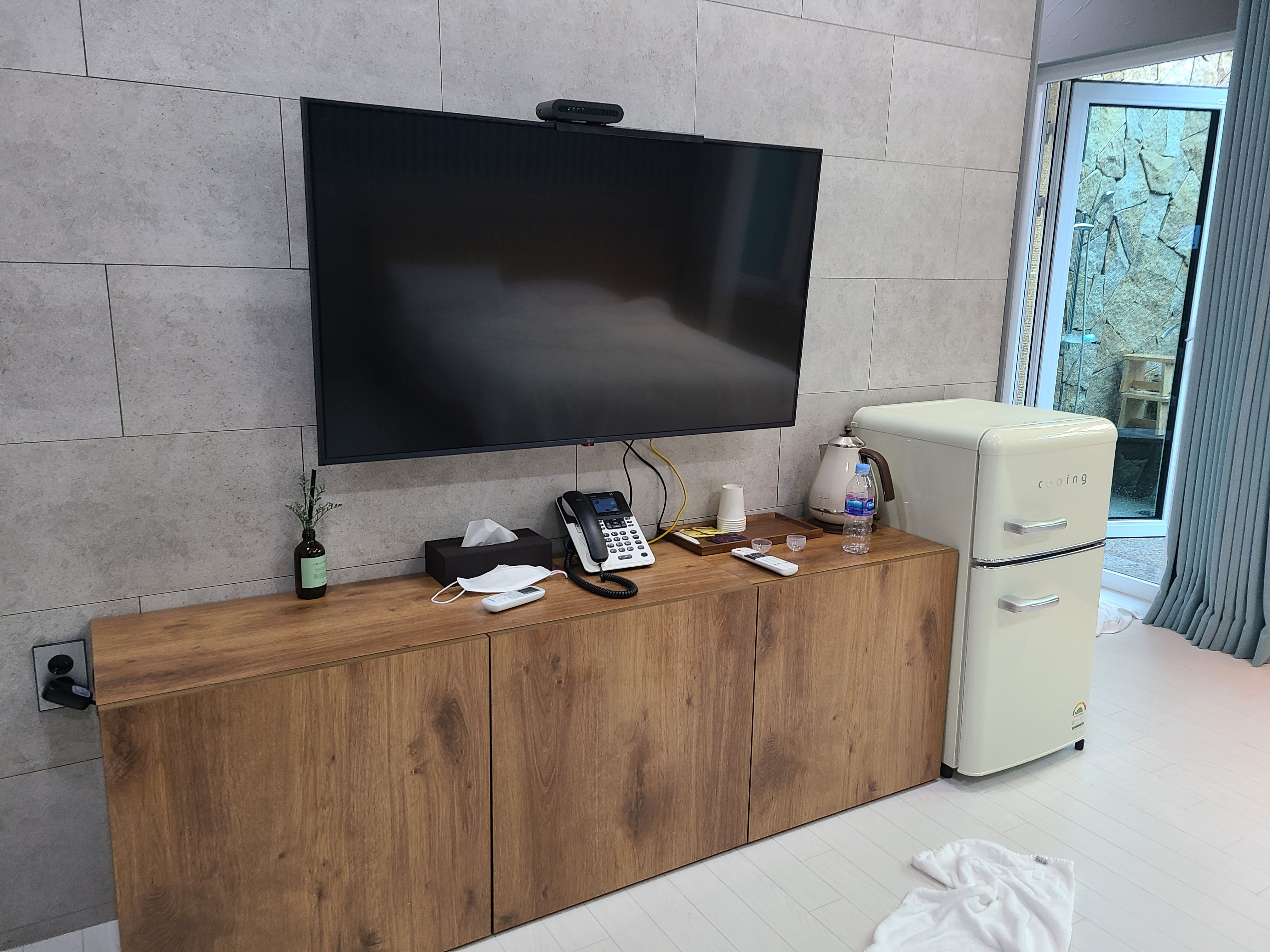 티브이 전화 전기포트가 보입니다. 냉장고도 아담하게 있고 물과 음료가 준비되어있어요.