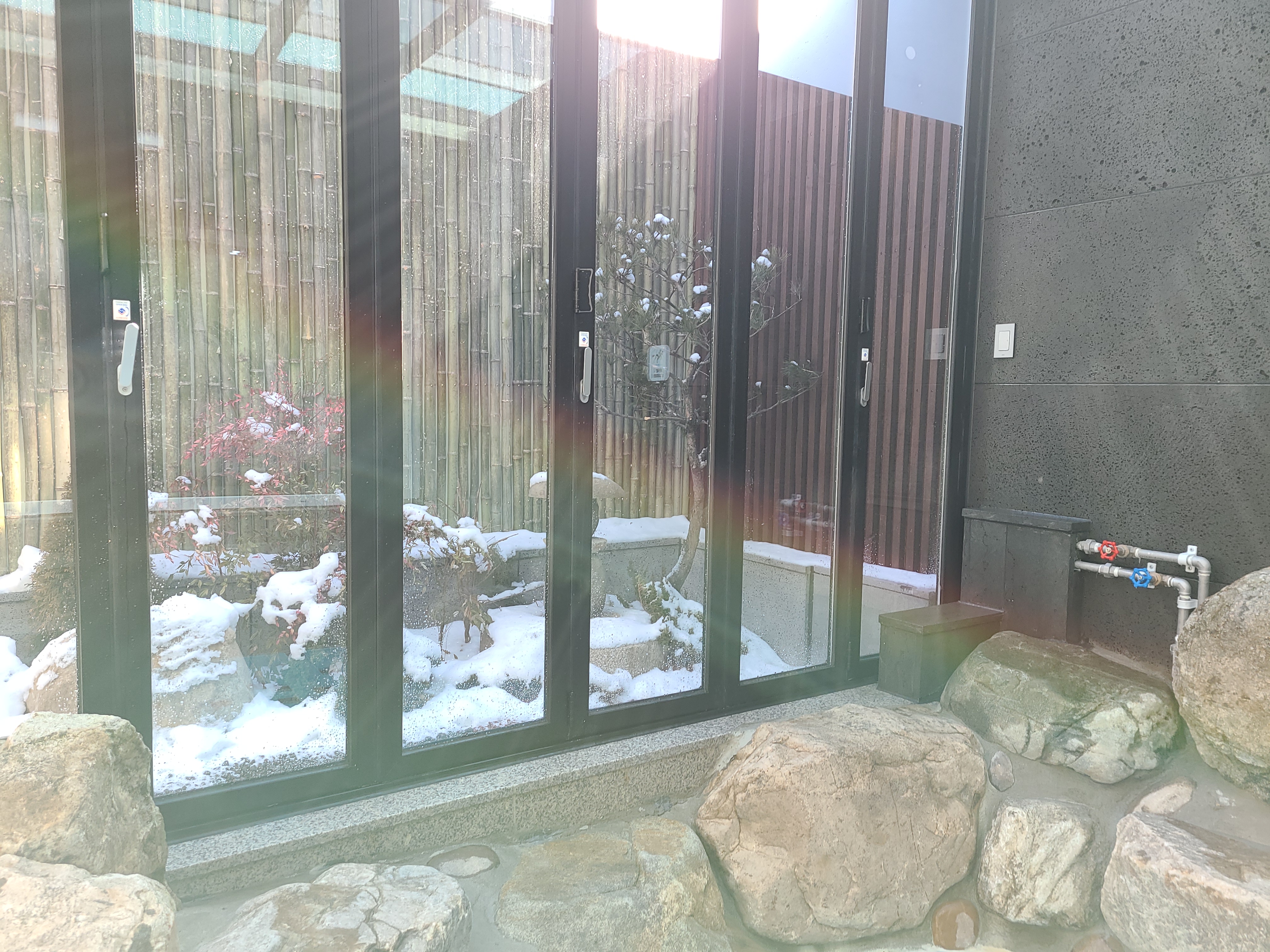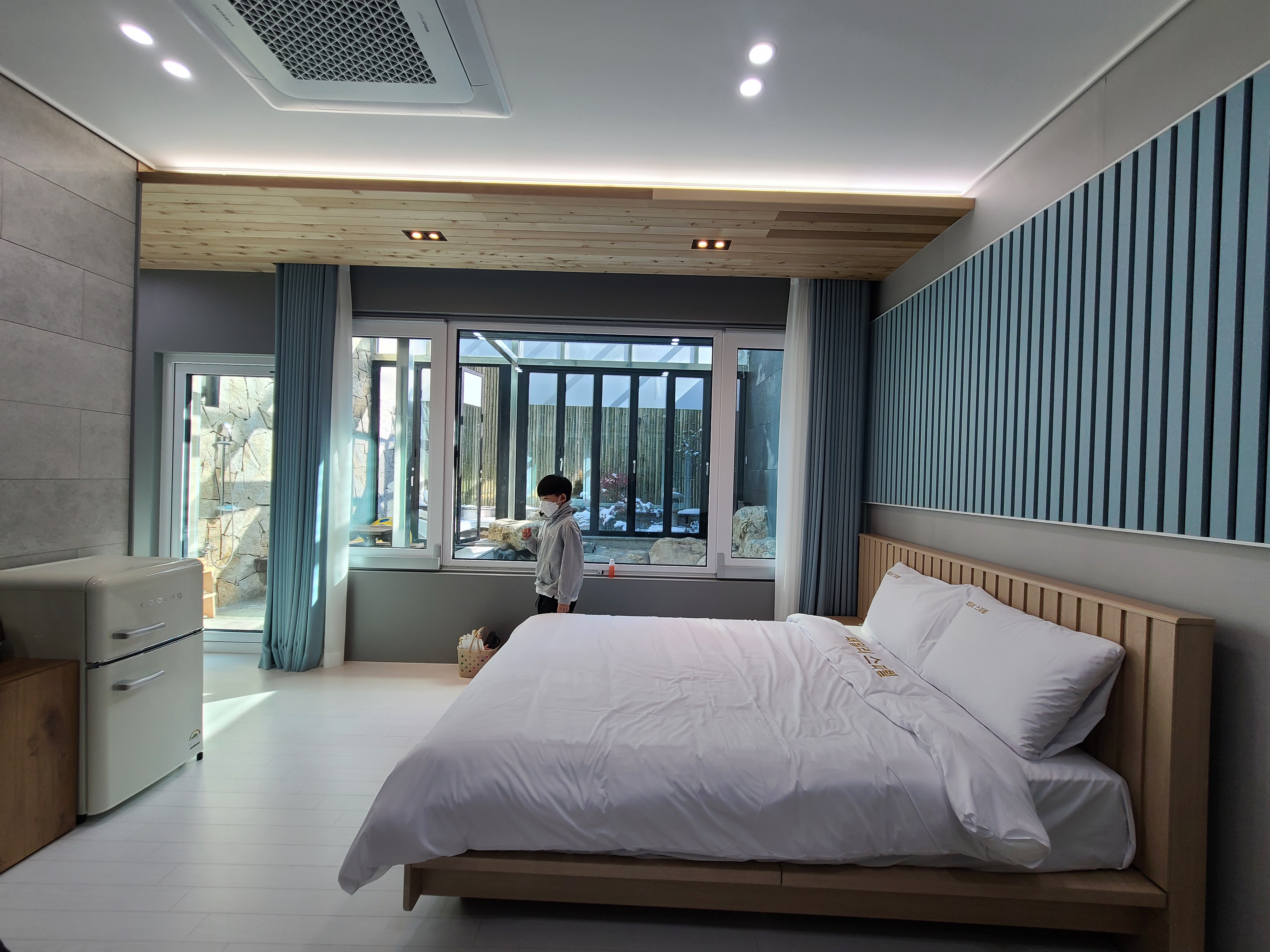 객실의 모승이다. 침대가 있고 작은 냉장고도 보이고 노천탕이 바로 앞에 커다란 창문으로 보여요. 새롭게 지어서 그런지 아주 깔끔 네요.