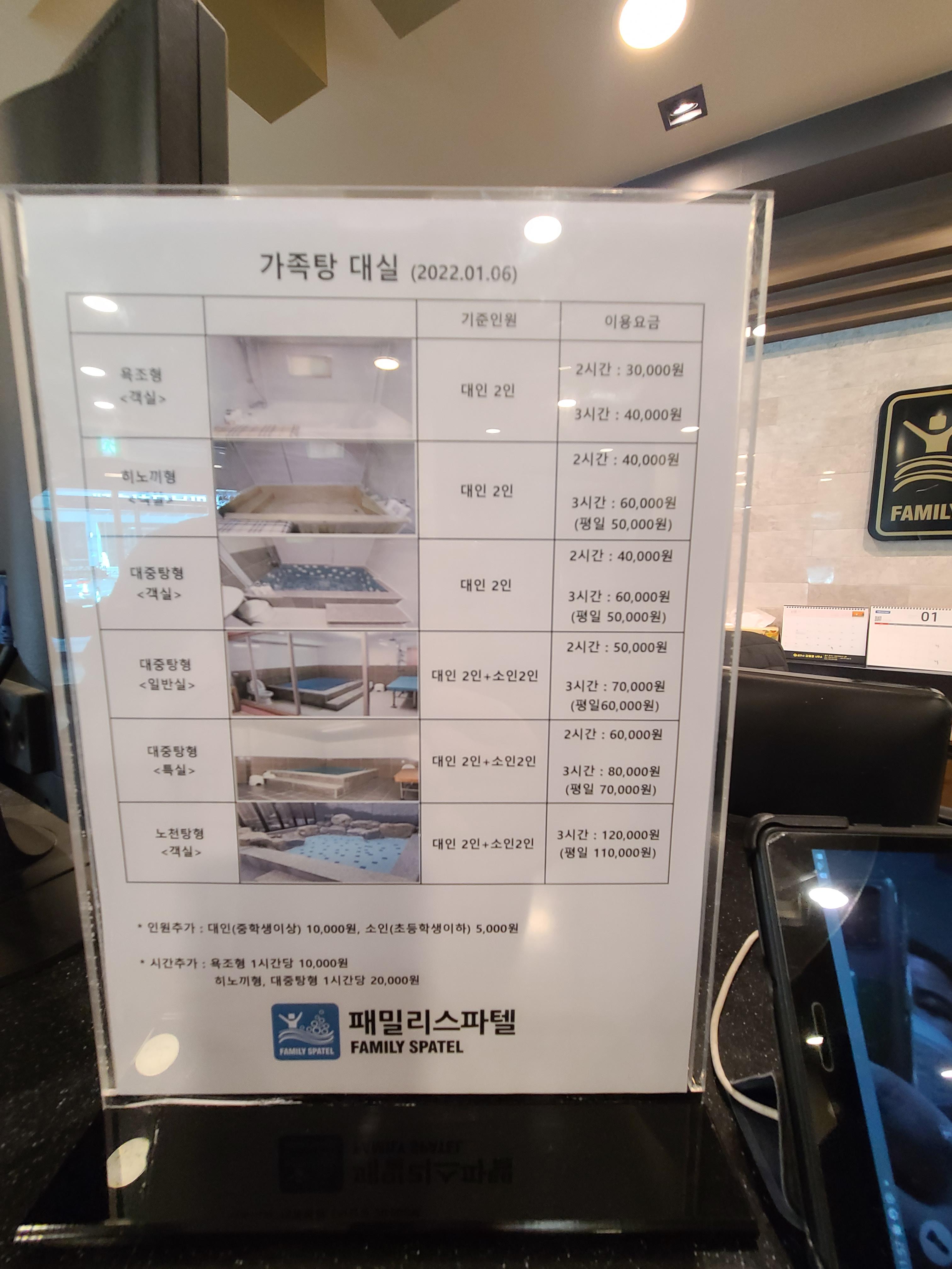 가족탕 대실은 욕실형, 히노끼형, 대중탕 객실 형, 대중탕형일반실, 대중탕형 특실, 노천탕형이 있습니다. 가족탕 대실 가격은 3만 원에서 12만 원까지 있습니다.
