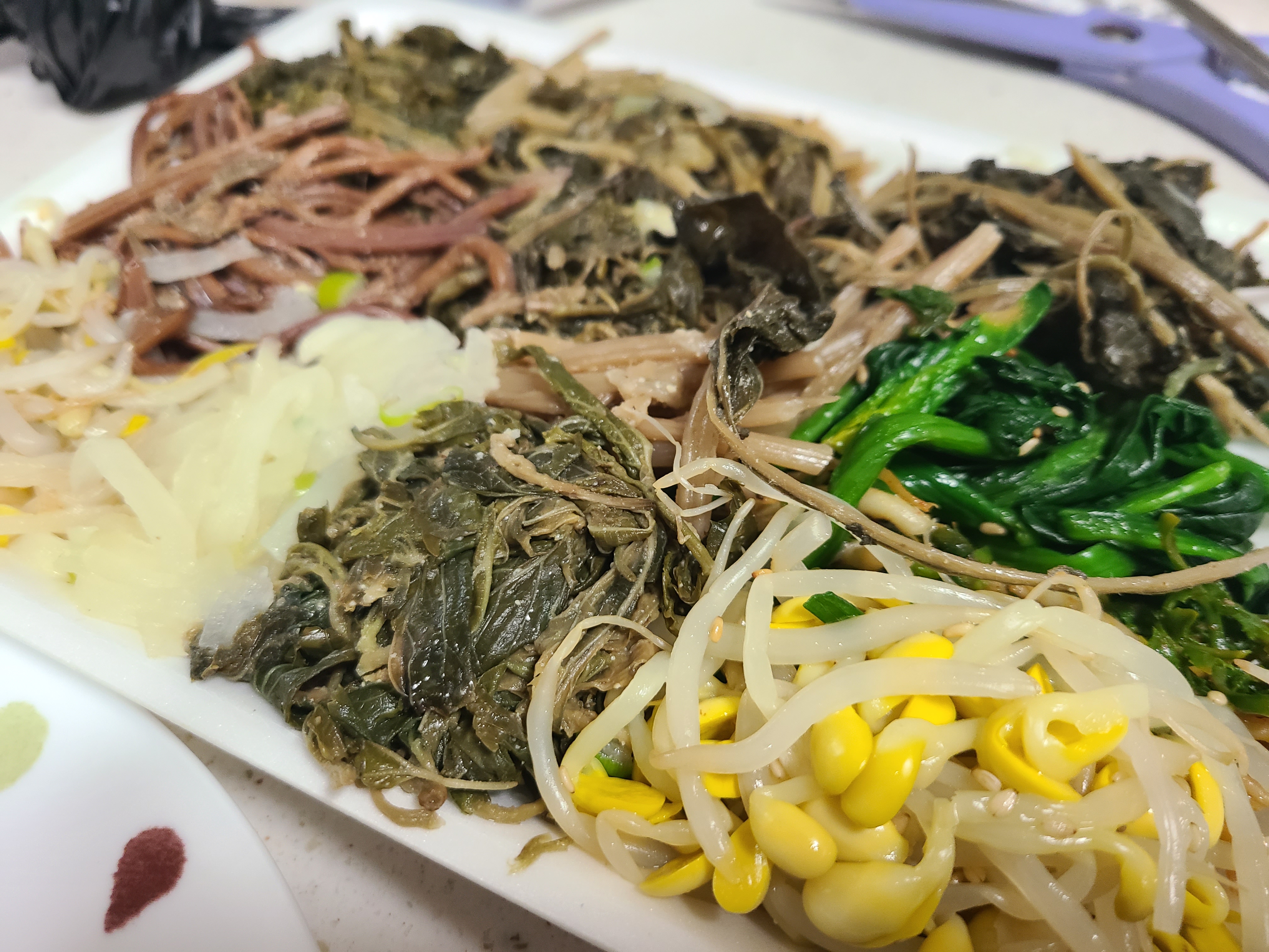 묵은 나물에는 박, 버섯, 콩, 오이, 가지 등 각종 채소를 말려 둔 나물을 먹는데 이는 한여름에 더위를 타지 않는다고 합니다.