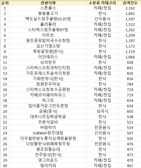 한국관광공사 빅데이터에 나온 충북 청주 서원구 맛집 추천 랭킹을 알아보았습니다. 전월 티맵을 검색량 기준으로 맛집 카페 순위를 매긴 것이니 참고하시기 바랍니다. 청주시 서원구 맛집 랭