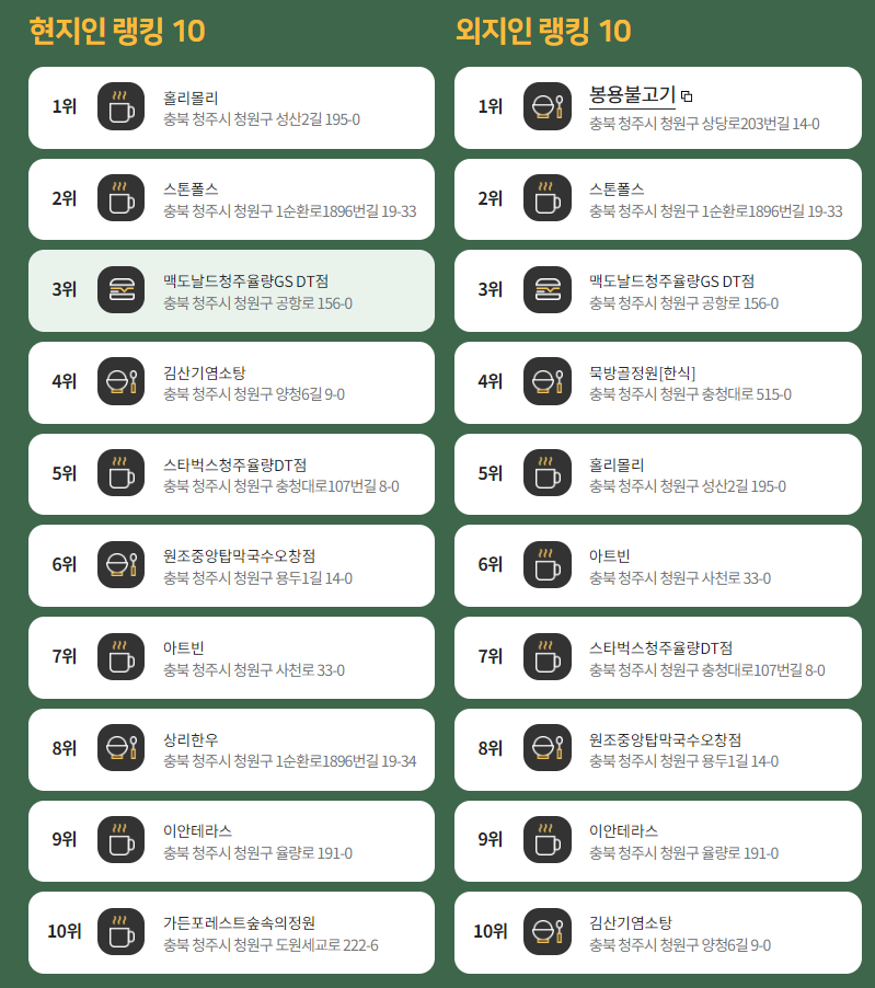 청주 맛집 베스트 10을 알아보았습니다. 2022년 전월 티맵 네비게이션 데이터를 기반으로 청주시에 있는 맛집 음식점 카페 제과점을 순위를 매긴것입니다. 도보로 이용하거나 네비를 이용하지 않은 것은 포함되지 않으니 참고하시면 좋겠습니다. 동네사람들 이 자주가는 현지인 맛집과 여행들이 가는 외지인이 가는 맛집을 구분해 놓았으니 참고하세요.